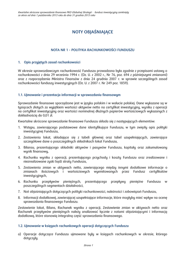 Kwartalne skrócone sprawozdanie finansowe PKO Globalnej Strategii - fundusz inwestycyjny zamknięty za okres od dnia 1 października 2013 roku do dnia 31 grudnia 2013 roku NOTY OBJAŚNIAJĄCE NOTA NR 1 – POLITYKA RACHUNKOWOŚCI FUNDUSZU 1. Opis przyjętych zasad rachunkowości W okresie sprawozdawczym rachunkowość Funduszu prowadzona była zgodnie z przepisami ustawy o rachunkowości z dnia 29 września 1994 r. (Dz. U. z 2002 r., Nr 76, poz. 694 z późniejszymi zmianami) oraz z rozporządzenia Ministra Finansów z dnia 24 grudnia 2007 r. w sprawie szczególnych zasad rachunkowości funduszy inwestycyjnych (Dz. U. z 2007 r. Nr 249 poz. 1859). 1.1. Ujmowanie i prezentacja informacji w sprawozdaniu finansowym Sprawozdanie finansowe sporządzone jest w języku polskim i w walucie polskiej. Dane wykazane są w tysiącach złotych za wyjątkiem wartości aktywów netto na certyfikat inwestycyjny, wyniku z operacji na certyfikat inwestycyjny oraz wartości nominalnej dłużnych papierów wartościowych wykazanych z dokładnością do 0,01 zł. Kwartalne skrócone sprawozdanie finansowe Funduszu składa się z następujących elementów: 1. Wstępu, zawierającego podstawowe dane identyfikujące Funduszu, w tym zwięzły opis polityki inwestycyjnej Funduszu, 2. Zestawienia lokat, składające się z tabeli głównej oraz tabel uzupełniających, zawierające szczegółowe dane o poszczególnych składnikach lokat Funduszu, 3. Bilansu, prezentującego składniki aktywów i pasywów Funduszu, kapitały oraz zakumulowany wynik finansowy, 4. Rachunku wyniku z operacji, prezentującego przychody i koszty Funduszu oraz zrealizowane i niezrealizowane zyski bądź straty Funduszu, 5. Zestawienia zmian w aktywach netto, zawierającego między innymi dodatkowe informacje o zmianach ilościowych i wartościowych wyemitowanych przez Fundusz certyfikatów inwestycyjnych, 6. Rachunku przepływów pieniężnych, prezentującego poszczególnych segmentach działalności, przepływy pieniężne Funduszu w 7. Not objaśniających dotyczących polityki rachunkowości, należności i zobowiązań Funduszu, 8. Informacji dodatkowej, zawierającej uzupełniające informacje, które mogłyby mieć wpływ na ocenę sprawozdania finansowego Funduszu. Zestawienie lokat, Bilans, Rachunek wyniku z operacji, Zestawienie zmian w aktywach netto oraz Rachunek przepływów pieniężnych należy analizować łącznie z notami objaśniającymi i informacją dodatkową, które stanowią integralną część sprawozdania finansowego. 1.2. Ujmowanie w księgach rachunkowych operacji dotyczących Funduszu a) Operacje dotyczące Funduszu ujmowane były w księgach rachunkowych w okresie, którego dotyczyły. Strona 1 Kwartalne skrócone sprawozdanie finansowe PKO Globalnej Strategii - fundusz inwestycyjny zamknięty za okres od dnia 1 października 2013 roku do dnia 31 grudnia 2013 roku b) Nabycie albo zbycie składników lokat przez Fundusz ujmowane było w księgach rachunkowych w dacie zawarcia umowy. c) Nabyte składniki lokat ujmowane były w księgach rachunkowych według ceny nabycia uwzględniającej koszty związane z ich nabyciem, w szczególności prowizje maklerskie. Składnikom lokat nabytym nieodpłatnie została przypisana cena nabycia równa zeru. d) Składnikom lokat otrzymanym w zamian za inne składniki została przypisana cena nabycia wynikająca z ceny nabycia składników lokat wymienionych i ewentualnych dopłat lub otrzymanych przychodów pieniężnych. e) Dniem wprowadzenia do ksiąg zmiany kapitału wpłaconego był dzień wydania certyfikatów inwestycyjnych. f) Dniem wprowadzenia do ksiąg zmiany kapitału wypłaconego był dzień dokonania przez KDPW zapisu wykupu certyfikatów. g) Zysk lub strata ze zbycia lokat wyliczana była metodą HIFO (najdroższe sprzedaje się jako pierwsze), polegającą na przypisaniu sprzedanym składnikom najwyższej ceny nabycia, a w przypadku składników wycenianych w wysokości skorygowanej ceny nabycia, oszacowanej przy zastosowaniu efektywnej stopy procentowej, najwyższej bieżącej wartości księgowej. h) Operacje dotyczące Funduszu ujmowane były w walucie, w której zostały wyrażone, a także w walucie polskiej po przeliczeniu według średniego kursu wyliczonego dla danej waluty przez Narodowy Bank Polski na dzień ujęcia tych operacji w księgach rachunkowych Funduszu. i) Naliczone przychody Funduszu obejmują w szczególności: przychody odsetkowe oraz dodatnie saldo różnic kursowych powstałe w związku z wyceną środków pieniężnych, należności oraz zobowiązań w walutach obcych. j) Przychody odsetkowe od dłużnych papierów wartościowych, wycenianych w wartości godziwej, naliczane były zgodnie z zasadami ustalonymi dla tych papierów wartościowych przez emitenta. k) Koszty operacyjne Funduszu obejmują w szczególności: wynagrodzenie stałe i zmienne Towarzystwa za zarządzanie, wynagrodzenie depozytariusza, koszty badania i przeglądu sprawozdań finansowych, koszty, koszty sponsora i animatora emisji, KDPW, GPW, koszty organizacji i obsługi posiedzeń Zgromadzenia Inwestorów i Rady Inwestorów, koszty systemów informatycznych, koszty odsetkowe oraz ujemne saldo różnic kursowych powstałe w związku z wyceną środków pieniężnych, należności oraz zobowiązań w walutach obcych. W księgach Funduszu w każdym Dniu Wyceny tworzona była rezerwa na wynagrodzenie stałe i zmienne Towarzystwa za zarządzanie oraz na inne koszty, które zgodnie ze Statutem są pokrywane przez Fundusz. Płatności z tytułu kosztów operacyjnych zmniejszały uprzednio utworzoną rezerwę.. 1.3. Metody wyceny aktywów, z uwzględnieniem stosowanych metod klasyfikacji i wyceny składników lokat oraz zobowiązań Funduszu, aktywów netto i wyniku z operacji Ustalanie wartości aktywów netto oraz wartości aktywów netto na certyfikat inwestycyjny a) W każdym dniu wyceny wyceniane były aktywa Funduszu oraz ustalane: i) wartość aktywów netto Fundu
