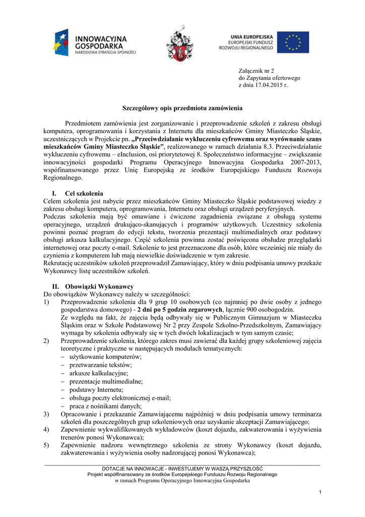 Załącznik nr 2 do Zapytania ofertowego z dnia 17.04.2015 r. Szczegółowy opis przedmiotu zamówienia Przedmiotem zamówienia jest zorganizowanie i przeprowadzenie szkoleń z zakresu obsługi komputera, oprogramowania i korzystania z Internetu dla mieszkańców Gminy Miasteczko Śląskie, uczestniczących w Projekcie pn. „Przeciwdziałanie wykluczeniu cyfrowemu oraz wyrównanie szans mieszkańców Gminy Miasteczko Śląskie”, realizowanego w ramach działania 8.3. Przeciwdziałanie wykluczeniu cyfrowemu – eInclusion, osi priorytetowej 8. Społeczeństwo informacyjne – zwiększanie innowacyjności gospodarki Programu Operacyjnego Innowacyjna Gospodarka 2007-2013, wspófinansowanego przez Unię Europejską ze środków Europejskiego Funduszu Rozwoju Regionalnego. I. Cel szkolenia Celem szkolenia jest nabycie przez mieszkańców Gminy Miasteczko Śląskie podstawowej wiedzy z zakresu obsługi komputera, oprogramowania, Internetu oraz obsługi urządzeń peryferyjnych. Podczas szkolenia mają być omawiane i ćwiczone zagadnienia związane z obsługą systemu operacyjnego, urządzeń drukująco-skanujących i programów użytkowych. Uczestnicy szkolenia powinni poznać program do edycji tekstu, tworzenia prezentacji multimedialnych oraz podstawy obsługi arkusza kalkulacyjnego. Część szkolenia powinna zostać poświęcona obsłudze przeglądarki internetowej oraz poczty e-mail. Szkolenie to jest przeznaczone dla osób, które wcześniej nie miały do czynienia z komputerem lub mają niewielkie doświadczenie w tym zakresie. Rekrutację uczestników szkoleń przeprowadził Zamawiający, który w dniu podpisania umowy przekaże Wykonawcy listę uczestników szkoleń. II. Obowiązki Wykonawcy Do obowiązków Wykonawcy należy w szczególności: 1) Przeprowadzenie szkolenia dla 9 grup 10 osobowych (co najmniej po dwie osoby z jednego gospodarstwa domowego) - 2 dni po 5 godzin zegarowych, łącznie 900 osobogodzin. Ze względu na fakt, że zajęcia będą odbywały się w Publicznym Gimnazjum w Miasteczku Śląskim oraz w Szkole Podstawowej Nr 2 przy Zespole Szkolno-Przedszkolnym, Zamawiający wymaga by szkolenia odbywały się w tych dwóch lokalizacjach w tym samym czasie; 2) Przeprowadzenie szkolenia, którego zakres musi zawierać dla każdej grupy szkoleniowej zajęcia teoretyczne i praktyczne w następujących modułach tematycznych: − użytkowanie komputerów; − przetwarzanie tekstów; − arkusze kalkulacyjne; − prezentacje multimedialne; − podstawy Internetu; − obsługa poczty elektronicznej e-mail; − praca z nośnikami danych; 3) Opracowanie i przekazanie Zamawiającemu najpóźniej w dniu podpisania umowy terminarza szkoleń dla poszczególnych grup szkoleniowych oraz uzyskanie akceptacji Zamawiającego; 4) Zapewnienie wykwalifikowanych wykładowców (koszt dojazdu, zakwaterowania i wyżywienia trenerów ponosi Wykonawca); 5) Zapewnienie nadzoru wewnętrznego szkolenia ze strony Wykonawcy (koszt dojazdu, zakwaterowania i wyżywienia osoby nadzorującej ponosi Wykonawca); _____________________________________________________________________________________________________ DOTACJE NA INNOWACJE - INWESTUJEMY W WASZĄ PRZYSZŁOŚĆ Projekt współfinansowany ze środków Europejskiego Funduszu Rozwoju Regionalnego w ramach Programu Operacyjnego Innowacyjna Gospodarka 1 6) 7) 8) 9) 10) 11) 12) 13) 14) Opracowanie i przedstawienie Zamawiającemu nie później niż na 3 dni przed terminem rozpoczęcia szkoleń projektu materiałów dydaktycznych odpowiadających treści zajęć, które po zaakceptowaniu pozostaną u Zamawiającego na potrzeby archiwalne Projektu. W skład materiałów dydaktycznych powinny wchodzić w szczególności: podręcznik lub inne niezbędne materiały szkoleniowe oraz notatnik i przybory do pisania. Materiały (podręcznik) powinny być spięte w sposób uniemożliwiający dekompletację (np. zbindowane) i powinny zawierać m.in.: program szkolenia, teoretyczne wprowadzenie w zagadnienia poszczególnych zakresów szkoleń oraz materiał ćwiczeniowo-warsztatowy. Materiały dydaktyczne będą nowe, nieużywane, adekwatne do treści szkolenia oraz dobre jakościowo. Wykonawca dostarczy na miejsce szkolenia przedmiotowe materiały i przekaże je każdemu uczestnikowi szkoleń wraz z ich rozpoczęciem na własność; Opracowanie i przedstawienie Zamawiającemu projektu certyfikatów do akceptacji nie później niż na 3 dni przed terminem rozpoczęcia szkoleń. Na materiałach szkoleniowych i certyfikatach Wykonawca umieści logo POIG, logo UE, logo i nazwę Zamawiającego, tytuł Projektu oraz informację o współfinansowaniu przedsięwzięcia ze środków Europejskiego Funduszu Rozwoju Regionalnego, zgodnie z wytycznymi zawartymi w „Przewodniku w zakresie promocji projektów finansowanych w ramach Programu Operacyjnego Innowacyjna Gospodarka, 2007-2013 dla beneficjentów i instytucji zaangażowanych we wdrażanie programu”, który jest dostępny na stronie: http://www.wwpe.gov.pl; Prowadzenie dokumentacji z przebiegu szkolenia, składającej się z: a) dziennika zajęć edukacyjnych zawierającego tematy i wymiar godzin zajęć edukacyjnych, b) listę obecności zawierającą: imię, nazwisko i podpis uczestnika szkolenia, c) rejestru potwierdzeń odbioru materiałów szkoleniowych, d) rejestru wydanych certyfikatów potwierdzających ukończenie szkolenia i uzyskanie kwalifikacji; Umożliwienie Zamawiającemu oraz innym uprawnionym podmiotom przeprowadzenia kontroli prawidłowości realizacji usługi, w tym m.in. prowadzonej dokumentacji, trenerów i osób szkolonych w dowolnym momencie realizacji usługi; Opracowanie ankiet i przeprowadzenie na ich podstawie anonimowych badań jakości szkolenia (badanie ankietowe po zakończeniu szkolenia prowadzone wśród uczestników dotyczące odczuć związanych z przeprowadzonym szkoleniem, m.in.: ocena szkolenia ogółem, ocena trenera, ocena materiałów szkoleniowych, samoocena wiedzy uczestnik