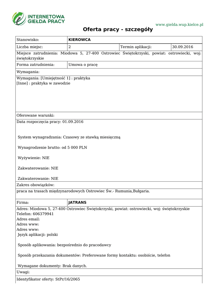 Oferta pracy - szczegóły Stanowisko: KIEROWCA Liczba miejsc: 2 www.gielda.wup.kielce.pl Termin aplikacji: 30.09.2016 Miejsce zatrudnienia: Miodowa 5, 27-400 Ostrowiec Świętokrzyski, powiat: ostrowiecki, woj: świętokrzyskie Forma zatrudnienia: Umowa o pracę Wymagania: Wymagania: [Umiejętność 1] : praktyka [Inne] : praktyka w zawodzie Oferowane warunki: Data rozpoczęcia pracy: 01.09.2016 System wynagradzania: Czasowy ze stawką miesięczną Wynagrodzenie brutto: od 5 000 PLN Wyżywienie: NIE Zakwaterowanie: NIE Zakwaterowanie: NIE Zakres obowiązków: praca na trasach międzynarodowych Ostrowiec Św.- Rumunia,Bułgaria. Firma: JATRANS Adres: Miodowa 5, 27-400 Ostrowiec Świętokrzyski, powiat: ostrowiecki, woj: świętokrzyskie Telefon: 606379941 Adres email: Adres www: Adres www: Język aplikacji: polski Sposób aplikowania: bezpośrednio do pracodawcy Sposób przekazania dokumentów: Preferowane formy kontaktu: osobiście, telefon Wymagane dokumenty: Brak danych. Uwagi: Identyfikator oferty: StPr/16/2065 Instytucja koordynująca ofertę: Powiatowy Urząd Pracy w Ostrowcu Świętokrzyskim Urząd Pracy dokłada wszelkich starań, aby oferty pracy będące w zasobach urzędu, były rzetelne i wiarygodne. Ponieważ wszystkie oferty pracy pochodzą od osób trzecich Urząd Pracy zastrzega, że odpowiedzialność za ewentualne rozbieżności pomiędzy warunkami pracy zaprezentowanymi w niniejszej ofercie a warunkami zaproponowanymi przez potencjalnego pracodawcę ponosi pracodawca.