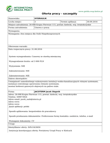 Oferta pracy - szczegóły Stanowisko: HYDRAULIK Liczba miejsc: 3 Termin aplikacji: www.gielda.wup.kielce.pl 30.09.2016 Miejsce zatrudnienia: 26-008 Krajno Pierwsze 115, powiat: kielecki, woj: świętokrzyskie Forma zatrudnienia: Umowa o pracę Wymagania: Wymagania: dwa miejsca dla Osób Niepełnosprawnych Oferowane warunki: Data rozpoczęcia pracy: 31.08.2016 System wynagradzania: Czasowy ze stawką miesięczną Wynagrodzenie brutto: od 3 000 PLN Wyżywienie: NIE Zakwaterowanie: NIE Zakwaterowanie: NIE Zakres obowiązków: Umiejętność samodzielnego wykonywania instalacji wodno-kanalizacyjnych różnymi systemami, instalacji centralnego ogrzewania różnymi systemami, montaż kotłowni gazowych olejowych na paliwo stale. Firma: JACOTERM Jacek Stępnik Adres: 26-008 Krajno Pierwsze 115, powiat: kielecki, woj: świętokrzyskie Telefon: 509073924 Adres email: [email protected] Adres www: Adres www: Język aplikacji: polski Sposób aplikowania: bezpośrednio do pracodawcy Sposób przekazania dokumentów: Preferowane formy kontaktu: osobiście, telefon, e-mail Wymagane dokumenty: CV Uwagi: Identyfikator oferty: StPr/16/3650 Instytucja koordynująca ofertę: Powiatowy Urząd Pracy w Kielcach Urząd Pracy dokłada wszelkich starań, aby oferty pracy będące w zasobach urzędu, były rzetelne i wiarygodne. Ponieważ wszystkie oferty pracy pochodzą od osób trzecich Urząd Pracy zastrzega, że odpowiedzialność za ewentualne rozbieżności pomiędzy warunkami pracy zaprezentowanymi w niniejszej ofercie a warunkami zaproponowanymi przez potencjalnego pracodawcę ponosi pracodawca.