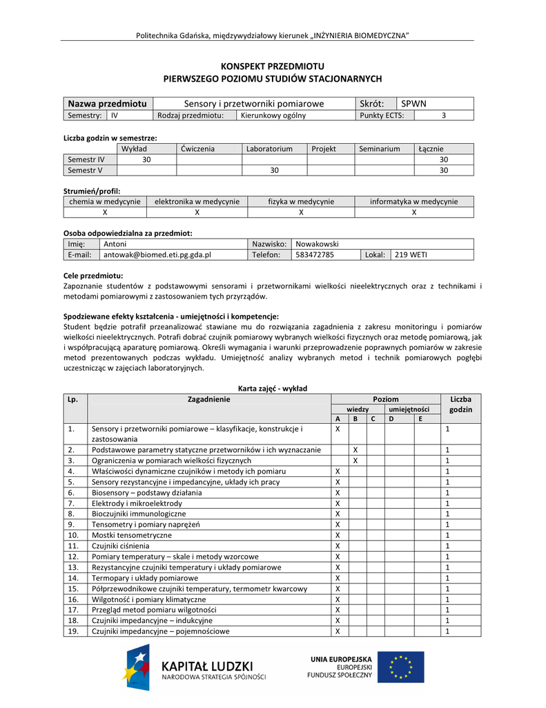 Politechnika Gdańska, międzywydziałowy kierunek „INŻYNIERIA BIOMEDYCZNA” KONSPEKT PRZEDMIOTU PIERWSZEGO POZIOMU STUDIÓW STACJONARNYCH Nazwa przedmiotu Semestry: Sensory i przetworniki pomiarowe IV Rodzaj przedmiotu: Liczba godzin w semestrze: Wykład Semestr IV 30 Semestr V Strumień/profil: chemia w medycynie X Skrót: Kierunkowy ogólny Ćwiczenia Laboratorium SPWN Punkty ECTS: Projekt Seminarium 30 elektronika w medycynie X Osoba odpowiedzialna za przedmiot: Imię: Antoni E-mail: [email protected] fizyka w medycynie X Nazwisko: Telefon: 3 Łącznie 30 30 informatyka w medycynie X Nowakowski 583472785 Lokal: 219 WETI Cele przedmiotu: Zapoznanie studentów z podstawowymi sensorami i przetwornikami wielkości nieelektrycznych oraz z technikami i metodami pomiarowymi z zastosowaniem tych przyrządów. Spodziewane efekty kształcenia - umiejętności i kompetencje: Student będzie potrafił przeanalizować stawiane mu do rozwiązania zagadnienia z zakresu monitoringu i pomiarów wielkości nieelektrycznych. Potrafi dobrać czujnik pomiarowy wybranych wielkości fizycznych oraz metodę pomiarową, jak i współpracującą aparaturę pomiarową. Określi wymagania i warunki przeprowadzenie poprawnych pomiarów w zakresie metod prezentowanych podczas wykładu. Umiejętność analizy wybranych metod i technik pomiarowych pogłębi uczestnicząc w zajęciach laboratoryjnych. Karta zajęć - wykład Lp. Zagadnienie Poziom wiedzy A B C 1. 2. 3. 4. 5. 6. 7. 8. 9. 10. 11. 12. 13. 14. 15. 16. 17. 18. 19. Sensory i przetworniki pomiarowe – klasyfikacje, konstrukcje i zastosowania Podstawowe parametry statyczne przetworników i ich wyznaczanie Ograniczenia w pomiarach wielkości fizycznych Właściwości dynamiczne czujników i metody ich pomiaru Sensory rezystancyjne i impedancyjne, układy ich pracy Biosensory – podstawy działania Elektrody i mikroelektrody Bioczujniki immunologiczne Tensometry i pomiary naprężeń Mostki tensometryczne Czujniki ciśnienia Pomiary temperatury – skale i metody wzorcowe Rezystancyjne czujniki temperatury i układy pomiarowe Termopary i układy pomiarowe Półprzewodnikowe czujniki temperatury, termometr kwarcowy Wilgotność i pomiary klimatyczne Przegląd metod pomiaru wilgotności Czujniki impedancyjne – indukcyjne Czujniki impedancyjne – pojemnościowe X Liczba godzin 1 X X X X X X X X X X X X X X X X X X umiejętności D E 1 1 1 1 1 1 1 1 1 1 1 1 1 1 1 1 1 1 Politechnika Gdańska, międzywydziałowy kierunek „INŻYNIERIA BIOMEDYCZNA” 20. 21. 22. 23. 24. 25. 26. 27. 28. 29. 30. Detektory promieniowania widzialnego i podczerwonego Pirometria optyczna Metody pomiarów sejsmicznych Akcelerometry i wibrometry sejsmiczne Sensory ładunkowe i pomiary elektrometryczne Przetworniki impulsowe i kodowe Pomiary przepływów i lepkości Metody dopplerowskie pomiaru prędkości, przyspieszenia Metody analizy ilościowej i jakościowej Mikrosystemy w analityce chemicznej Tendencje rozwojowe w konstrukcji sensorów X X X X X X X X X X X Karta zajęć - laboratorium Zagadnienie Lp. 1 1 1 1 1 1 1 1 1 1 1 Razem: 30 Poziom wiedzy A B C 1. 2. 3. 4. 5. 6. 7. 8. 9. 10. Wprowadzenie i zaliczenia Pomiary tensometryczne Sensory indukcyjne Pomiary sejsmiczne Termorezystory i termopary Czujniki impulsowe i kodowe Sensory i pomiary ciśnienia Przetworniki optyczne Pirometria optyczna Czujniki piezoelektryczne i pojemnościowe Próg zaliczenia: Semestr: IV Semestr: V z wykładu z ćwiczeń umiejętności D E X X X X X X X X X X Warunki zaliczenia przedmiotu Z laboratorium z projektu z seminarium Liczba godzin 3 3 3 3 3 3 3 3 3 3 Razem: 30 z całości 30/55 30/45 60/100 Opis form zaliczenia Wykład (semestr IV) Id Termin 1. Egzamin Punkty 55 Razem: 55 Laboratorium (semestr V) Id Termin 1. Wprowadzenie i zaliczenia 2. Ćwiczenie 2 3. Ćwiczenie 3 4. Ćwiczenie 4 5. Ćwiczenie 5 6. Ćwiczenie 6 7. Ćwiczenie 7 8. Ćwiczenie 8 9. Ćwiczenie 9 10. Ćwiczenie 10 Punkty 5 5 5 5 5 5 5 5 5 Razem: 45 Zakres Problemy z zakresu 1-30, wg planu wykładu Zakres Zadania do realizacji wynikające z programu ćwiczenia nr 2 Zadania do realizacji wynikające z programu ćwiczenia nr 3 Zadania do realizacji wynikające z programu ćwiczenia nr 4 Zadania do realizacji wynikające z programu ćwiczenia nr 5 Zadania do realizacji wynikające z programu ćwiczenia nr 6 Zadania do realizacji wynikające z programu ćwiczenia nr 7 Zadania do realizacji wynikające z programu ćwiczenia nr 8 Zadania do realizacji wynikające z programu ćwiczenia nr 9 Zadania do realizacji wynikające z programu ćwiczenia nr 10 Uwagi dotyczące kryteriów zaliczenia: Projekt „Przygotowanie i realizacja kierunku inżynieria biomedyczna – studia międzywydziałowe” współfinansowany ze środków Unii Europejskiej w ramach Europejskiego Funduszu Społecznego. Politechnika Gdańska, międzywydziałowy kierunek „INŻYNIERIA BIOMEDYCZNA” Wymagane jest zaliczenie każdej formy przedmiotu. Za istotne uważa się umiejętności praktycznego zastosowania zdobytej wiedzy, zarówno podczas realizacji zadań laboratoryjnych. Lp. 1. Przedmiot Matematyka 2. Fizyka 3. Podstawy elektroniki 4. 5. 6. Metrologia Chemia Mechanika i wytrzymałość materiałów Przedmioty wyprzedzające wraz z wymaganiami wstępnymi Zakres 1. Równania różniczkowe zwyczajne 2. Rachunek całkowy 3. Równania cząstkowe 4. Elementy rachunku wektorowego 1. Fale 2. Akustyka 3. Ultradźwięki, generacja 4. Propagacja ultradźwięków w materiałach 5. Zjawisko Dopplera 6. Elektryczność i magnetyzm 7. Optyka 8. Promieniowanie cieplne 1. Elementy półprzewodnikowe 2. Wzmacniacz operacyjny 3. Obwody i sygnały Cały zakres programu studiów Cały zakres programu studiów Cały zakres programu studiów Metody dydaktyczne: Wykład prowadzony będzie z użyciem pokazów materiału w postaci elektronicznej PPT i projektora. Ilustrowany będzie przykładami konstrukcji i zastosowań sensorów i przetworników pomiarowych. Zajęcia laboratoryjne b