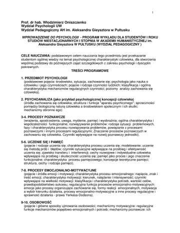 1 Prof. dr hab. Włodzimierz Oniszczenko Wydział Psychologii UW Wydział Pedagogiczny AH im. Aleksandra Gieysztora w Pułtusku WPROWADZENIE DO PSYCHOLOGII - PROGRAM WYKŁADU DLA STUDENTÓW I ROKU STUDIÓW NIESTACJONARNYCH I STOPNIA W AKADEMII HUMANISTYCZNEJ im. Aleksandra Gieysztora W PUŁTUSKU (WYDZIAŁ PEDAGOGICZNY ) CELE NAUCZANIA: podstawowym celem nauczania tego przedmiotu jest przekazanie studentom ogólnej wiedzy na temat psychologicznej charakterystyki człowieka, dla stworzenia wspólnej podstawy do późniejszych zajęć szczegółowych z zakresu psychologii i dyscyplin pokrewnych. TREŚCI PROGRAMOWE 1. PRZEDMIOT PSYCHOLOGII (podstawowe pojęcia: środowisko, sytuacja, zachowanie się; psychologia jako nauka o człowieku i jego czynnościach; pojęcie i rodzaje czynności ludzkich; klasyfikacja i ogólna charakterystyka mechanizmów regulacyjnych czynności; poziomy analizy zachowania się człowieka). 2. PSYCHOANALIZA (jako przykład psychologicznej koncepcji człowieka) (źródła zachowania się człowieka; struktura i funkcje "aparatu psychicznego"; sprzeczności pomiędzy biologiczną naturą człowieka a środowiskiem społecznym i ich skutki; mechanizmy obronne ego) 3-4. PROCESY POZNAWCZE (wrażenia, spostrzeżenia, uwaga, myślenie, pamięć i wyobraźnia; ogólna charakterystyka i współzależności funkcjonalne; rozwiązywanie problemów: rodzaje sytuacji problemowych, fazy i charakterystyka procesu rozwiązywania problemów, powiązanie z procesami poznawczymi i innymi procesami regulacyjnymi; Znaczenie procesów poznawczych w zachowaniu się człowieka. Czynniki wpływające na rozwój poznawczy jednostki). 5-6. UCZENIE SIĘ I PAMIĘĆ (pojęcie i rodzaje uczenia się; charakterystyka procesu uczenia się; modelowanie; uczenie się metodą prób i błędów; czynniki sytuacyjne wpływające na przebieg i efektywność uczenia się; zjawisko transferu i interferencji; cechy rozwojowe i indywidualne człowieka wpływające na przebieg i skuteczność uczenia się; pamięć jako proces i jego znaczenie funkcjonalne; charakterystyka procesu pamięciowego; koncepcje teoretyczne pamięci; struktura, cechy i rodzaje pamięci). 7-8. PROCESY EMOCJONALNO-MOTYWACYJNE (pojęcie i źródła emocji i motywacji; charakterystyka procesu emocjonalnego: napięcie, znak i treść emocji; charakterystyka motywacji: kierunek, natężenie i intensywność; czynniki wpływające na wielkość motywacji: klasyfikacja i charakterystyka potrzeb, wartość celów, prawdopodobieństwo sukcesu; regulacyjna funkcja procesów emocjonalno-motywacyjnych: emocje jako procesy organizujące zachowanie się, formy reakcji emocjonalnych, motywacja a wybór kierunku działania, procesy emocjonalno-motywacyjne a inne procesy regulacyjne i sprawność działania - prawa Yerkesa-Dodsona). 9-10. OSOBOWOŚĆ (pojęcie i główne sposoby ujmowania osobowości; mechanizmy motywacyjne: regulacyjne funkcje mechanizmów popędowo-emocjonalnych i potrzeb; mechanizmy poznawcze: ich 2 struktura i podstawowe funkcje; struktura "ja" i jej znaczenie regulacyjne; czynniki rozwoju osobowości). 11. RÓŻNICE INDYWIDUALNE: TEMPERAMENT (psychologia osobowości a różnice indywidualne; przesłanki psychologii r.i.; zmienność międzyosobnicza - znaczenie czynników genetycznych i środowiskowych; możliwości i preferencje człowieka jako przedmiot zainteresowania psychologii r.i.; wybrane współczesne koncepcje temperamentu; rola cech temperamentu: preferencje sytuacji o określonej wartości stymulacyjnej, zachowanie się w sytuacjach trudnych, pojęcie „temperamentu trudnego”; temperamentalny czynnik ryzyka; temperament a osobowość). 12-13. RÓŻNICE INDYWIDUALNE: ZDOLNOŚCI I INTELIGENCJA (pojęcie zdolności i inteligencji; różne koncepcje struktury intelektu; pojęcie i struktura inteligencji społecznej; źródła różnic w poziomie zdolności; testy inteligencji; pojęcie ilorazu inteligencji). 14. STRES (Pojęcie sytuacji trudnej; dysonans poznawczy i frustracja; pojęcie stresu; podstawowe koncepcje stresu; stres biologiczny i psychologiczny: poglądy H.Selye i R.Lazarusa; przejawy i następstwa stresu; konsekwencje chronicznego stresu; pojęcie kosztów psychofizjologicznych; czynniki ryzyka w powstawaniu zaburzeń zachowania i psychosomatycznych; wzór A zachowania i typ C osobowości; czynniki współwyznaczające odporność na stres; rola różnic indywidualnych; sposoby radzenia sobie ze stresem ostrym i przewlekłym) SPOSÓB ZALICZENIA: pisemny test wiadomości z oceną LITERATURA OBOWIĄZKOWA: 1. Gerrig, R.J., Zimbardo, P.H. (2006). Psychologia i życie. Gdańsk: Gdańskie Wydawnictwo Psychologiczne. 2. Oniszczenko, W. (1998). Stres - to brzmi groźnie (wyd. II). Warszawa: Wydawnictwo „Żak”. LITERATURA ZALECANA: 1. Strelau, J., Doliński, D. (red.) (2008). Psychologia. Podręcznik akademicki. Gdańsk: Gdańskie Wydawnictwo Psychologiczne (rozdz. 2 oraz 6 – 9).