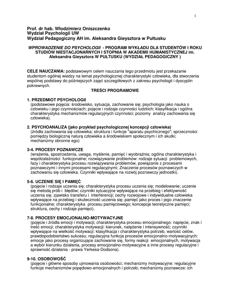 Prof. dr hab. Włodzimierz Oniszczenko Wydział Psychologii UW