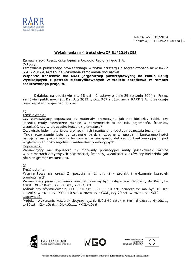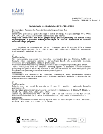 RARR/BZ/3319/2014 Rzeszów, 2014.04.23 Strona | 1 Wyjaśnienia nr 4 treści siwz ZP 31/2014/CES Zamawiający: Rzeszowska Agencja Rozwoju Regionalnego S.A. Dotyczy: zamówienia publicznego prowadzonego w trybie przetargu nieograniczonego nr w RARR S.A. ZP 31/2014/CES na wykonanie zamówienia pod nazwą: Wsparcie finansowe dla NGO (organizacji pozarządowych) na zakup usług wynikających z potrzeb zidentyfikowanych w trakcie doradztwa w ramach realizowanego projektu. Działając na podstawie art. 38 ust. 2 ustawy z dnia 29 stycznia 2004 r. Prawo zamówień publicznych (tj. Dz. U. z 2013r., poz. 907 z późn. zm.) RARR S.A. przekazuje treść zapytań i wyjaśnień do siwz. 1) Treść pytania: Czy zamawiający dopuszcza by materiały promocyjne jak np. kieliszki, kubki, czy koszulki miały nieznaczne różnice w parametrach takich jak. pojemność, średnica, wysokość, czy w przypadku koszulek gramatura? Oczywiście kolor materiałów promocyjnych i naniesione logotypy pozostają bez zmian. Takie rozwiązanie było by zapewne bardziej zgodne z zasadami konkurencyjności panującej na rynku i można by również w ten sposób dotrzeć do konkurencyjnych pod względem cen poszczególnych materiałów promocyjnych. Odpowiedź: Zamawiający nie dopuszcza by materiały promocyjne miały jakiekolwiek różnice w parametrach dotyczących pojemności, średnicy, wysokości kubków czy kieliszków jak również gramatury koszulek. 2) Treść pytania: Pytanie tyczy się części 2, pozycja nr 2, pkt. 2 - projekt i wykonanie koszulek promocyjnych. Zamawiający pisze iż rozmiary koszulek powinny być następujące: S-10szt., M–10szt., L– 10szt., XL– 10szt., XXL–10szt., 2XL–10szt. Jednak czy sformułowanie XXL - 10 szt i 2XL - 10 szt. oznacza że ma być 10 szt. koszulek w rozmiarze XXL i 10 szt. w rozmiarze XXXL, czy 20 szt. w rozmiarze XXL? Odpowiedź: Projekt i wykonanie koszulek dotyczy łącznie ilości 60 sztuk w tym: S-10szt., M–10szt., L–10szt., XL– 10szt., XXL–10szt., XXXL–10szt.