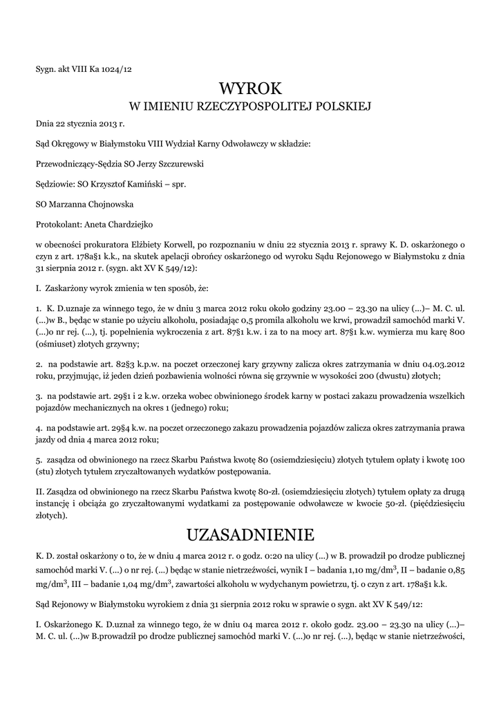 Sygn. akt VIII Ka 1024/12 WYROK W IMIENIU RZECZYPOSPOLITEJ POLSKIEJ Dnia 22 stycznia 2013 r. Sąd Okręgowy w Białymstoku VIII Wydział Karny Odwoławczy w składzie: Przewodniczący-Sędzia SO Jerzy Szczurewski Sędziowie: SO Krzysztof Kamiński – spr. SO Marzanna Chojnowska Protokolant: Aneta Chardziejko w obecności prokuratora Elżbiety Korwell, po rozpoznaniu w dniu 22 stycznia 2013 r. sprawy K. D. oskarżonego o czyn z art. 178a§1 k.k., na skutek apelacji obrońcy oskarżonego od wyroku Sądu Rejonowego w Białymstoku z dnia 31 sierpnia 2012 r. (sygn. akt XV K 549/12): I. Zaskarżony wyrok zmienia w ten sposób, że: 1. K. D.uznaje za winnego tego, że w dniu 3 marca 2012 roku około godziny 23.00 – 23.30 na ulicy (...)– M. C. ul. (...)w B., będąc w stanie po użyciu alkoholu, posiadając 0,5 promila alkoholu we krwi, prowadził samochód marki V. (...)o nr rej. (...), tj. popełnienia wykroczenia z art. 87§1 k.w. i za to na mocy art. 87§1 k.w. wymierza mu karę 800 (ośmiuset) złotych grzywny; 2. na podstawie art. 82§3 k.p.w. na poczet orzeczonej kary grzywny zalicza okres zatrzymania w dniu 04.03.2012 roku, przyjmując, iż jeden dzień pozbawienia wolności równa się grzywnie w wysokości 200 (dwustu) złotych; 3. na podstawie art. 29§1 i 2 k.w. orzeka wobec obwinionego środek karny w postaci zakazu prowadzenia wszelkich pojazdów mechanicznych na okres 1 (jednego) roku; 4. na podstawie art. 29§4 k.w. na poczet orzeczonego zakazu prowadzenia pojazdów zalicza okres zatrzymania prawa jazdy od dnia 4 marca 2012 roku; 5. zasądza od obwinionego na rzecz Skarbu Państwa kwotę 80 (osiemdziesięciu) złotych tytułem opłaty i kwotę 100 (stu) złotych tytułem zryczałtowanych wydatków postępowania. II. Zasądza od obwinionego na rzecz Skarbu Państwa kwotę 80-zł. (osiemdziesięciu złotych) tytułem opłaty za drugą instancję i obciąża go zryczałtowanymi wydatkami za postępowanie odwoławcze w kwocie 50-zł. (pięćdziesięciu złotych). UZASADNIENIE K. D. został oskarżony o to, że w dniu 4 marca 2012 r. o godz. 0:20 na ulicy (...) w B. prowadził po drodze publicznej samochód marki V. (...) o nr rej. (...) będąc w stanie nietrzeźwości, wynik I – badania 1,10 mg/dm3, II – badanie 0,85 mg/dm3, III – badanie 1,04 mg/dm3, zawartości alkoholu w wydychanym powietrzu, tj. o czyn z art. 178a§1 k.k. Sąd Rejonowy w Białymstoku wyrokiem z dnia 31 sierpnia 2012 roku w sprawie o sygn. akt XV K 549/12: I. Oskarżonego K. D.uznał za winnego tego, że w dniu 04 marca 2012 r. około godz. 23.00 – 23.30 na ulicy (...)– M. C. ul. (...)w B.prowadził po drodze publicznej samochód marki V. (...)o nr rej. (...), będąc w stanie nietrzeźwości, posiadając od 0,7 do 0,5 promila alkoholu we krwi, tj. czynu z art. 178a§1 k.k. i za to na mocy art. 178a§1 k.k. skazał go na karę grzywny w wysokości 100 (stu) stawek dziennych, przy przyjęciu, iż jedna stawka dzienna równa się kwocie 15 (piętnastu) złotych. II. Na podstawie art. 63§1 k.k. na poczet orzeczonej kary grzywny zaliczył oskarżonemu okres zatrzymania jeden dzień, tj. 04.03.2012r., przyjmując, iż jeden dzień pozbawienia wolności równa się dwóm stawkom dziennym grzywny. III. Na podstawie art. 42§2 k.k. orzekł wobec oskarżonego środek karny w postaci zakazu prowadzenia wszelkich pojazdów mechanicznych na okres 1 (jednego) roku. IV. Na podstawie art. 63§2 kk zaliczył oskarżonemu na poczet orzeczonego w pkt. III środka karnego okres zatrzymania prawa jazdy od dnia 04.03.2012r. V. Zasądził od oskarżonego na rzecz Skarbu Państwa kwotę 150 (sto pięćdziesiąt) złotych tytułem opłaty i obciążył go pozostałymi kosztami sądowymi w sprawie. Powyższy wyrok, na podstawie art. 425§1 k.p.k. i art. 444 k.p.k., zaskarżył w całości obrońca oskarżonego. Na podstawie art. 438 pkt 2 i 3 k.p.k. oraz art. 427 k.p.k. wyrokowi temu zarzucił: -obrazę przepisów postępowania mających wpływ na treść orzeczenia, tj. art. 4 k.p.k. w zw. z art. 410 k.p.k. wyrażającą się w ocenie materiału dowodowego z przekroczeniem swobody przewidzianej wart. 7 k.p.k. polegającej na naruszeniu zasady obiektywizmu poprzez jednostronną interpretację zaistniałych okoliczności i art. 2§2 k.p.k. przez niedokonanie prawdziwych ustaleń faktycznych i uznanie, że zgromadzony materiał dowodowy w niniejszej sprawie pozwala przyjąć, iż oskarżony K. Ł. D. w dniu przedmiotowego zdarzenia ok. 23.00-23.30 prowadził po drodze publicznej samochód marki V. (...), będąc w stanie nietrzeźwości, posiadając od 0,7 do 0,5 promila alkoholu we krwi, wyczerpując tym samym znamiona czynu opisanego w art. 178a§1 k.k. w sytuacji gdy, przy prawidłowej ocenie materiału dowodowego z uwzględnieniem zasad prawidłowego rozumowania oraz wskazań wiedzy i doświadczenia życiowego, a także zasady postępowania karnego in dubio pro reo, stanowiącej iż wszelkie nie dające się usunąć wątpliwości, które pojawiły się w przedmiotowej sprawie, rozstrzyga się na korzyść oskarżonego, Sąd winien dojść do stanowiska, iż brak jest danych dostatecznie uzasadniających, że oskarżony w określonych przez Sąd I instancji ramach czasowych tj. około godziny 23.00-23.30 prowadził samochód marki V. (...) posiadając od 0,7 do 0,5 promila alkoholu we krwi, spożywając przedtem alkohol w postaci dwóch piw, - błąd w ustaleniach faktycznych przyjętych za podstawę skarżonego orzeczenia, które miały wpływ na jego treść poprzez dowolne określenie ram czasowych przedmiotowego zdarzenia i przyjęcie, że oskarżony w dniu 04-03-2012 r. prowadził po spożyciu dwóch piw ok. godz. 23.00-23.30 samochód marki V. (...), w sytuacji gdy, zebrany materiał dowodowy w niniejszej sprawie nie pozwala w sposób jednoznaczny i precyzyjny określić czasu prowadzenia przez oskarżonego samochodu i ilości i czasu spożywania przez oskarżonego alkoholu, a zeznania świadków złożone na etap