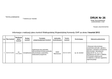 Terminy przekazania : DRUK Nr 26 7 kwietnia (za I kwartał) Uwaga ! Druk przekazywany za pośrednictwem e-mail Poznań, dnia 04.04.2012r. Informacja o realizacji planu kontroli Wielkopolskiej Wojewódzkiej Komendy OHP za okres I kwartał 2012 L.p. Plan kontroli 1 30-31.01.2012 Realizacja planu kontroli 3031.01.2012 Rodzaj kontroli Tematyka przeprowadzonych kontroli organizacja pracy jednostki, dokumentacja formalna jednostki, kompleksowa dokumentacja uczestników, realizowanie programów Jednostka kontrolowana OSiW Niechanowo Termin kontroli 30-31.01.2012 Kontrolujący sp. ds. kontroli Zalecenia pokontrolne 1.Stosować dokumentację uczestników jednostki, zgodnie z wykazem i zasadami prowadzenia dokumentacji, stanowiącymi Załączniki Nr 1a, 1b, 1c do Zarządzenia KG OHP nr 26/BOA; 2.Prowadzić składnicę akt; 3.Ustalenia w zakresie regulaminu organizacyjnego doraźna 2 3 17.02.2012 17.02.2012 funkcjonowanie jednostki MCK Gniezno organizacja pracy jednostki, dokumentacja formalna jednostki, problemowa KP Pobiedziska dokumentacja odbiorców usług 06.02.2012 17.02.2012 sp. ds. kontroli st.sp. ds. pr. europ. i współp międz. sp. ds. kontroli 1. Przechowywać dokumentację, związaną z działalnością jednostki, w siedzibie. 2. Nie przechowywać w siedzibie jednostki materiałów nie związanych bezpośrednio z realizacją projektu. 3. Listy obecności ze spotkań grupowych z uczestnikami muszą zawierać podpisy tychże uczestników. Ma to szczególne znaczenie w przypadku „beneficjentów” – osób objętych projektem EFS. 4. Terminowo przesyłać sprawozdania i plany do WWK OHP Poznań. 5. Zweryfikować oznakowanie EFS na dodatkowym zestawie komputerowym MSI, fotelu obrotowym oraz stoliku pod komputer. W przypadku gdy ww. aktywa zostały sfinansowane w ramach projektu należy uzupełnić oznakowanie. 6. Naprawić 3 stoły konferencyjne. 1.Przedłożyć do zatwierdzenia wszystkie dokumenty źródłowe i sprawozdania, które tego wymagają, a na których brak zatwierdzenia. W miarę możliwości na bieżąco zatwierdzać dokumentację. 2. Zintensyfikować działalność w zakresie organizacji zajęć grupowych, zwłaszcza poprzez zacieśnienie współpracy z Powiatowym Urzędem Pracy. 3. Założyć Zeszyt wyjść służbowych. 4. Założyć Książkę kontroli. 4 doraźna realizacja polityki bezpieczeństwa i ochrony danych osobowych oraz Biuro WWK zabezpieczenia systemów OHP Poznań informatycznych 01.03.2012 1. Niezwłocznie wdrożyć i stosować zasady określone w Załącznikach nr 1 i nr 2 do Zarządzenia WWK OHP Nr 23/ZKW, 2. Stosować przepisy: uoodo oraz rozporządzenia Ministra Spraw Wewnętrznych i Administracji z dnia 29.04.2004r. w sprawie dokumentacji przetwarzania danych osobowych oraz sp. ds. kontroli, warunków technicznych i st. sp. ds. Obronnych, organizacyjnych, jakimi powinny Zarządzania odpowiadać urządzenia i systemy Kryzysowego i Ochrony informatyczne służące do przetwarzania Informacji Niejawnych, danych osobowych, programista informatyk 3. Przygotowanie przez administratora bezpieczeństwa informacji raportu z dotychczas realizowanej polityki bezpieczeństwa informacji w Biurze WWK OHP Poznań oraz opracowanie założeń do strategii dotyczącej wdrożenia i stosowania zasad polityki bezpieczeństwa ochrony danych osobowych, 4. Zorganizowanie narady pokontrolnej 5 09.03.2012 6 12-15.03.2012 09.03.2012 1229.03.2012 organizacja pracy jednostki, dokumentacja formalna jednostki, problemowa dokumentacja odbiorców usług organizacja pracy jednostki, dokumentacja formalna jednostki, dokumentacja odbiorców usług, kompleksowa realizacja umów o refundację kosztów szkolenia zawodowego pracowników młodocianych KP Koło 09.03.2012 CEiPM Poznań (KP, MCIZ, 12-29.03.2012 MCK, MBP, RCR) sp. ds. kontroli 1. Zatwierdzać wszystkie dokumenty, które tego wymagają, a na których brak zatwierdzenia. W miarę możliwości na bieżąco zatwierdzać dokumentację, zgodnie ze Standardem. 2. Dopilnowywać, aby opiekunowie młodzieży uczącej się składali podpisy na listach obecności. 3. Dopilnowywać, aby uczestnicy składali podpisy na listach obecności. 1. MCIZ - Skrygować w rejestrze indywidualnych porad zawodowych za I kw. 2012r. (poz. 2-28) ilość faktycznie udzielonych porad, 2. MCIZ - Doradcy zawodowi powinni składać podpisy na wszystkich kartach usług doradczych, 3. MCIZ - Stosować "nowe" karty drogowe-od 01.01.2012r., sp. ds. kontroli, 4. MBP - Prowadzić "Kartę kontaktów sp. ds. rynku pracy, z pracodawcą", st. sp. ds. refundacji, st. 5. W przypadku „wniosków o sp. ds. logistyki wyrażenie zgody na zlecenie wykonania pracy w godzinach nadliczbowych” oraz „wniosków o wyrażenie zgody na udzielenie czasu wolnego od pracy” przedkładać je do zatwierdzenia Komendantowi WWK OHP Poznań, 6. Założyć ewidencję wyposażenia niskocennego. 7 16 i 20.03.2012 8 28.03.2012 Sporządził : 16 i 20.03.2012 28.03.2012 organizacja pracy jednostki, dokumentacja formalna jednostki, kompleksowa dokumentacja uczestników, HP Września realizacja programów organizacja pracy jednostki, dokumentacja formalna jednostki, dokumentacja odbiorców usług, problemowa PPP Wolsztyn poziom świadczonych usług, zabezpieczenie dokumentacji Daniel Troczyński - sp.ds. kontroli Imię i Nazwisko, stanowisko 04.04.2012 Data 16 i 20.03.2012 28.03.2012 1. Ustalenia w zakresie regulaminu organizacyjnego, 2. Uzupełnienie wpisów w sp. ds. kontroli, dziennikach zajęć wychowawczych, st. ref. ds.. kształcenia, 3. Wyszczególnienie w dziennkach st. ref. ds.. org. jedn. godzin, w których wychowawca opiek.-wych. i spraw. pracuje z młodzieżą, planist. 4. Wypełnianie dokumentacji z przeprowadzonych hospitacji zajęć wychowawczych. sp. ds. kontroli Zatwierdził : 1. Uzupełnić podpisy koordynatora projektu na właściwej dokumentacji 2. Wyjaśnić niezgodność danych pomiędzy treścią oferty a rejestrem Piotr Zerbe Wielkopolski Wojewódzki Komendant OHP Terminy pr