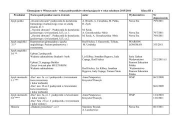 Gimnazjum w Witaszycach - wykaz podręczników obowiązujących w roku szkolnym 2015/2016 Przedmiot Język polski Język angielski 3.1* Język angielski 3.0 ** Nazwa podręcznika/ nazwa ćwiczeń autor Wydawnictwo „Swoimi słowami” podręcznik do kształcenia literackiego i kulturowego wraz ze szkołą pisania, kl. 3 „ Swoimi słowami” . Podręcznik do kształcenia językowego z ćwiczeniami, kl.3, cz. 1. „Swoimi słowami” . Podręcznik do kształcenia językowego z ćwiczeniami, kl.3, cz.2. Repetytorium gimnazjalne z języka angielskiego. Poziom podstawowy i rozszerzony. A. Brożek, A. Ciesielska, M. Pułka, D. Zych Nowa Era Nr dopuszczenia 79/9/2011 M. Szulc, A. Gorzałczyńska -Mróz M. Szulc, A. Gorzałczyńska -Mróz Nowa Era Nowa Era 79/7/2011 79/8/2011 Rod Fricker, J. Gaszewski, T.Siuta, M. Umińska PEARSON LONGMAN 353/2011 Liz Kilbey, Jonathan Bygrave, Judy Copage, Rod Fricker Seria Upbeat Wydawnictwo Pearson Education Polska Wydawnictwo Pearson Education Polska WSiP Upbeat 2 podręcznik Wydanie uaktualnione Student's book Upbeat 2 Language Builder Zeszyt ćwiczeń plus MULTI-ROM Wydanie uaktualnione Język niemiecki 3.1 *** Język niemiecki 3.0 **** Historia Klasa III a Aha! neu 3a cz.1 podręcznik z ćwiczeniami kurs rozszerzony ( kolor niebieski) Aha! neu 3b cz.2 podręcznik z ćwiczeniami kurs rozszerzony ( kolor niebieski) Aha ! neu 3a, cz. 1 podręcznik z ćwiczeniami ( kolor zielony) Aha ! Neu 2 b cz. 2 podręcznik z ćwiczeniami ( kolor zielony) „Śladami przeszłości”. cz.3 Rod Fricker, Liz Kilbey, Jonathan Bygrave, Judy Copage, Tomasz Siuta Anna Potapowicz, Krzysztof Tkaczyk 25/2/2011/z1 86/5/2009 86/6/2009 Anna Potapowicz, Krzysztof Tkaczyk WSiP 13/4/2010 13/6/2011 Stanisław Roszak A. Łaszkiewicz Nowa Era 60/3/2011 Fizyka Podręcznik: Spotkania z fizyką cz. 4. Ćwiczenia: Spotkania z fizyką cz. 4. Biologia Puls życia 3. Podręcznik Geografia Puls życia 3. Zeszyt ćwiczeń „Puls Ziemi 3.” G. Francuz-Ornat, T. Kulawik M. Nowotny Różańska Nowa Era 93/4/2011 A. Boczarowski, M. Sęktas Nowa Era 58/3/2010 R. Malarz Nowa Era 5/3/2010 Zeszyt ćwiczeń Puls Ziemi 3 Nowa Era Chemia Ciekawa chemia cz. 3 podręcznik H. Gulińska, J. Smolińska WSiP 40/3/2009 Wdż Religia Wędrując ku dorosłości. Żyć w miłości Boga. T. Król, K. Maśniak, D. Jackowiak, J. Szpet Matematyka Matematyka 3 wersja zgodna z najnowszą podstawą programową Edukacja dla bezpieczeństwa- linia druga, edycja jednoczęściowa, plus zeszyt ćwiczeń . ” Dziś i jutro” Podręcznik z ćwiczeniami cz.2 Praca zbiorowa pod redakcją Małgorzaty Dobrowolskiej Wyd. Rubikon Wyd. Księgarnia Św. Wojciecha GWO 205/2009 AZ-33-01/10PO-3/13 168/1/2009 K. Izbicki, Ł. Wrycz-Rekowski OPERON 270/2010 I. Janicka, A. Janicki, A. Kucia Nowa Era 77/2/2010 Edukacja dla bezpieczeństwa wos Uwaga! * 3.1 – język angielski: kupują uczniowie, którzy uczą się tego języka 3 godz. tygodniowo ** 3.0– język angielski: kupują uczniowie, którzy uczą się tego języka 2 godz. tygodniowo *** 3.1 – język niemiecki: kupują uczniowie, którzy uczą się tego języka 3 godz. tygodniowo **** 3.0 – język niemiecki: kupują uczniowie, którzy uczą się tego języka 2 godz. tygodniowo