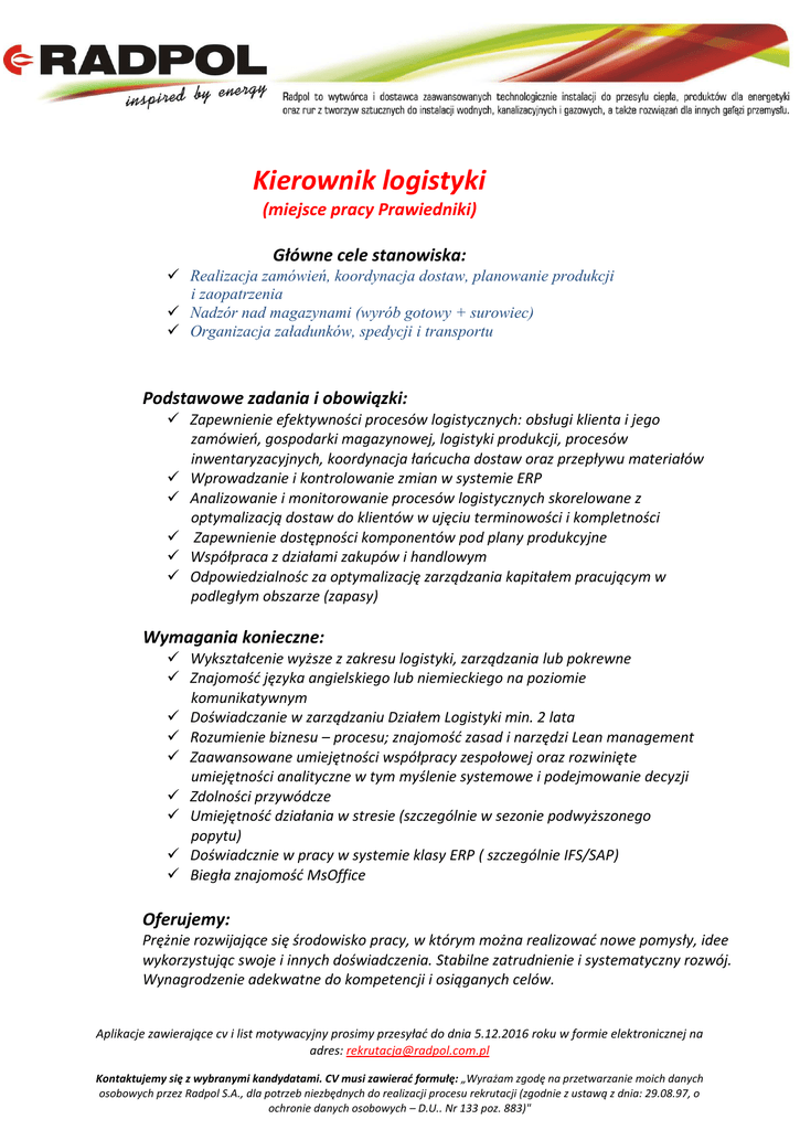 Kierownik logistyki (miejsce pracy Prawiedniki) Główne cele stanowiska: Realizacja zamówień, koordynacja dostaw, planowanie produkcji i zaopatrzenia Nadzór nad magazynami (wyrób gotowy + surowiec) Organizacja załadunków, spedycji i transportu Podstawowe zadania i obowiązki: Zapewnienie efektywności procesów logistycznych: obsługi klienta i jego zamówień, gospodarki magazynowej, logistyki produkcji, procesów inwentaryzacyjnych, koordynacja łańcucha dostaw oraz przepływu materiałów Wprowadzanie i kontrolowanie zmian w systemie ERP Analizowanie i monitorowanie procesów logistycznych skorelowane z optymalizacją dostaw do klientów w ujęciu terminowości i kompletności Zapewnienie dostępności komponentów pod plany produkcyjne Współpraca z działami zakupów i handlowym Odpowiedzialnośc za optymalizację zarządzania kapitałem pracującym w podległym obszarze (zapasy) Wymagania konieczne: Wykształcenie wyższe z zakresu logistyki, zarządzania lub pokrewne Znajomość języka angielskiego lub niemieckiego na poziomie komunikatywnym Doświadczanie w zarządzaniu Działem Logistyki min. 2 lata Rozumienie biznesu – procesu; znajomość zasad i narzędzi Lean management Zaawansowane umiejętności współpracy zespołowej oraz rozwinięte umiejętności analityczne w tym myślenie systemowe i podejmowanie decyzji Zdolności przywódcze Umiejętność działania w stresie (szczególnie w sezonie podwyższonego popytu) Doświadcznie w pracy w systemie klasy ERP ( szczególnie IFS/SAP) Biegła znajomość MsOffice Oferujemy: Prężnie rozwijające się środowisko pracy, w którym można realizować nowe pomysły, idee wykorzystując swoje i innych doświadczenia. Stabilne zatrudnienie i systematyczny rozwój. Wynagrodzenie adekwatne do kompetencji i osiąganych celów. Aplikacje zawierające cv i list motywacyjny prosimy przesyłać do dnia 5.12.2016 roku w formie elektronicznej na adres: [email protected] Kontaktujemy się z wybranymi kandydatami. CV musi zawierać formułę: „Wyrażam zgodę na przetwarzanie moich danych osobowych przez Radpol S.A., dla potrzeb niezbędnych do realizacji procesu rekrutacji (zgodnie z ustawą z dnia: 29.08.97, o ochronie danych osobowych – D.U.. Nr 133 poz. 883)"