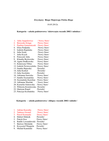Zwycięzcy Biegu Majowego Polska Biega 18.05.2012r. Kategoria – szkoła podstawowa / dziewczęta rocznik 2002 i młodsze / 1. Julia Jurgielewicz / Nowy Staw/ 2. Boroszko Kinga /Nowy Staw/ 3. Paulina Gumieniczek /Nowy Staw/ 4. Eliza Podjaska /Nowy Staw/ 5. Izabela Repińska /Nowy Staw/ 6. Julia Szulc /Nowy Staw/ 7. Julia Krych /Nowy Staw/ 8. Potoczek Julia /Nowy Staw/ 9. Klaudia Brylowska /Nowy Staw/ 10. Agata Dudkowska /Nowy Staw/ 11. Katarzyna Nibus /Nowy Staw/ 12. Izabela Świerczyńska /Nowy Staw/ 13. Sandra Bajorska /Świerki/ 14. Julia Kurkul /Świerki/ 15. Julia Socińska /Świerki/ 16. Adrianna Sawicka /Nowy Staw/ 17. Sandra Szymańska /Nowy Staw/ 18. Szymańska Karolina /Nowy Staw/ 19. Adrianna Wasilak / Nowy Staw/ 20. Kornelia Ostrowska /Nowy Staw/ 21. Wiktoria Kisielewska /Świerki/ 22. Martyna Ropel /Świerki/ 23. Patrycja Kochańska /Nowy Staw/ Kategoria - szkoła podstawowa / chłopcy rocznik 2002 i młodsi / 1. 2. 3. 4. 5. 6. 7. 8. 9. Adrian Kaszuba Tadeusz Grzmil Paweł Kornacki Hubert Moksik Patryk Koc Radek Lewandowski Bartosz Michalak Krzysztof Wargiela Michał Kamiński /Nowy Staw/ /Nowy Staw/ /Nowy Staw/ /Świerki/ /Nowy Staw/ /Świerki/ /Nowy Staw/ /Świerki/ /Nowy Staw/ 10. Dawid Ogórek 11. Karol Kruszczyński 12. Kacper Płuciennik 13. Jakub Ratkowski 14. Dawid Jeleń 15. Tomasz Celer 16. Dawid Wiśniewski 17. Igor Bień 18. Michał Ceran 19. Przemysław Żukowski 20. Dominik Baranowski 21. Patryk Szymański 22. Kacper Staśkowski 23. Dawid Dróźdź 24. Michał Rzepka /Nowy Staw/ /Nowy Staw/ /Świerki/ /Nowy Staw/ /Świerki/ /Świerki/ /Świerki/ /Nowy Staw/ /Nowy Staw/ /Nowy Staw/ /Nowy Staw/ /Nowy Staw/ /Świerki/ / Świerki/ /Nowy Staw/ Kategoria – szkoła podstawowa / dziewczęta rocznik 1999 i młodsze / 1. Natalia Damrath /Nowy Staw/ 2. Wiktoria Kostrzewska /Nowy Staw/ 3. Magda Jeleń /Świerki/ 4. Emilia Czapla /Świerki/ 5. Maja Płóciennik /Świerki/ 6 Dorota Miazga /Świerki/ 7. Anna Kurek /Nowy Staw/ 8. Marta Błaszczyk /Świerki/ 9. Oliwia Przezak /Świerki/ 10. Nikola Krauze /Nowy Staw/ 11. Kamila Potapczuk /Nowy Staw/ 12 .Daria Kot /Nowy Staw/ 13. Klaudia Stępniak /Nowy Staw/ 14. Milena Ostrowska /Nowy Staw/ 15. Karolina Mytkowska /Nowy Staw/ 16. Zofia Fijas /Nowy Staw/ 17. Agnieszka Kamińska /Nowy Staw/ 18..Julia Mazella /Nowy Staw/ Kategoria – szkoła podstawowa /chłopcy rocznik 1999 i młodsi / 1. 2. 3. 4. 5. 6. 7. Jakub Kamiński Daniel Królikowski Jakub Szczodrowski Marcin Kępka Bartosz Celer Jakub Moksik Łukasz Kaźmierczak /Nowy Staw/ /Świerki/ /Świerki/ /Nowy Staw/ /Świerki/ /Świerki/ /Nowy Staw/ 8. Jakub Stefaniak /Nowy Staw/ 9. Michał Tkacz /Świerki/ 10. Dawid Miazga /Świerki/ 11. Michał Cekała /Świerki/ 12. Kacper Krupa /Swierki/ 13. Jakub Rafał /Nowy Staw/ 14. Jakub Damrath /Nowy Staw/ 15. Patryk Cerowsski /Nowy Staw 16. Radek Kowalewski /Świerki/ 17. Kacper Mytkowski /Nowy Staw/ 18. Kamil Kalinowski /Nowy Staw/ 19. Mateusz Niewiadomski /Nowy Staw/ 20. Miłosz Nagrodzki /Świerki/ 21. Igor Gutfrańsksi /Nowy Staw/ 22. Błażej Sociński /Świerki/ 23. Filip Paziak /Nowy Staw/ 24. Damian Król /Nowy Staw/ 25. Jakub Kożlarek /Nowy Staw/ Kategoria – Gimnazjum / dziewczęta rocznik 1998-1996 / 1. 2. 3. 4. 5. 6. 7. 8. 9. Ewelina Nagrodzka Monika Gumieniczek Zuzanna Pawęska Dominika Kwiatkowska Anna Agejczyk Adrianna Jurkowska Anna Piwowar Agnieszka Więckowska Dominika Jeleń /Nowy Staw/ /Nowy Staw/ /Nowy Staw/ /Nowy Staw/ /Nowy Staw/ /Nowy Staw/ /Nowy Staw/ /Nowy Staw/ /Nowy Staw/ Kategoria – Gimnazjum / chłopcy rocznik 1998-1996 1. 2. 3. 4. 5. 6. 7. Tomasz Kopoński Artur Bernacki Mateusz Jagodziński Wiktor Wolak Remigiusz Bałaziński Damian Witkowski Kamil Wargiela /Nowy Staw/ /Nowy Staw/ /Nowy Staw/ /Nowy Staw/ /Nowy Staw/ /Nowy Staw/ /Nowy Staw/ Dnia 18.05.2012r. w Biegu Majowym „ Polska Biega” wzięło udział 106 osób / uczniów /.