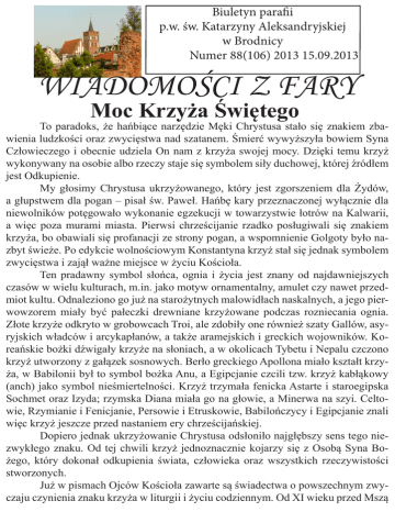 Biuletyn parafii p.w. św. Katarzyny Aleksandryjskiej w Brodnicy Numer 88(106) 2013 15.09.2013 WIADOMOŚCI Z FARY Moc Krzyża Świętego To paradoks, że hańbiące narzędzie Męki Chrystusa stało się znakiem zbawienia ludzkości oraz zwycięstwa nad szatanem. Śmierć wywyższyła bowiem Syna Człowieczego i obecnie udziela On nam z krzyża swojej mocy. Dzięki temu krzyż wykonywany na osobie albo rzeczy staje się symbolem siły duchowej, której źródłem jest Odkupienie. My głosimy Chrystusa ukrzyżowanego, który jest zgorszeniem dla Żydów, a głupstwem dla pogan – pisał św. Paweł. Hańbę kary przeznaczonej wyłącznie dla niewolników potęgowało wykonanie egzekucji w towarzystwie łotrów na Kalwarii, a więc poza murami miasta. Pierwsi chrześcijanie rzadko posługiwali się znakiem krzyża, bo obawiali się profanacji ze strony pogan, a wspomnienie Golgoty było nazbyt świeże. Po edykcie wolnościowym Konstantyna krzyż stał się jednak symbolem zwycięstwa i zajął ważne miejsce w życiu Kościoła. Ten pradawny symbol słońca, ognia i życia jest znany od najdawniejszych czasów w wielu kulturach, m.in. jako motyw ornamentalny, amulet czy nawet przedmiot kultu. Odnaleziono go już na starożytnych malowidłach naskalnych, a jego pierwowzorem miały być pałeczki drewniane krzyżowane podczas rozniecania ognia. Złote krzyże odkryto w grobowcach Troi, ale zdobiły one również szaty Gallów, asyryjskich władców i arcykapłanów, a także aramejskich i greckich wojowników. Koreańskie bożki dźwigały krzyże na słoniach, a w okolicach Tybetu i Nepalu czczono krzyż utworzony z gałązek sosnowych. Berło greckiego Apollona miało kształt krzyża, w Babilonii był to symbol bożka Anu, a Egipcjanie czcili tzw. krzyż kabłąkowy (anch) jako symbol nieśmiertelności. Krzyż trzymała fenicka Astarte i staroegipska Sochmet oraz Izyda; rzymska Diana miała go na głowie, a Minerwa na szyi. Celtowie, Rzymianie i Fenicjanie, Persowie i Etruskowie, Babilończycy i Egipcjanie znali więc krzyż jeszcze przed nastaniem ery chrześcijańskiej. Dopiero jednak ukrzyżowanie Chrystusa odsłoniło najgłębszy sens tego niezwykłego znaku. Od tej chwili krzyż jednoznacznie kojarzy się z Osobą Syna Bożego, który dokonał odkupienia świata, człowieka oraz wszystkich rzeczywistości stworzonych. Już w pismach Ojców Kościoła zawarte są świadectwa o powszechnym zwyczaju czynienia znaku krzyża w liturgii i życiu codziennym. Od XI wieku przed Mszą św. krzyż noszono w okazałej procesji, potem mały krzyżyk umieszczono na ołtarzu, a od połowy XIII w. znalazł się pomiędzy dwoma świecznikami. To na planie krzyża wznoszono świątynie, w których nad wejściem do prezbiterium, na tzw. belce tęczowej, mocowano „krzyże triumfalne”. Na najstarszych krzyżach nie było jeszcze wizerunku Chrystusa, potem ukazywano Go jako Króla triumfującego z krzyża, aż wreszcie w epoce gotyku pojawiły się wstrząsające wyobrażenia Ukrzyżowanego, wyrażające całą grozę męczeństwa. A także wzruszające Piety - wizerunki Maryi ze zmarłym Synem na kolanach – oraz pierwsze drogi krzyżowe. W XV wieku znane były także „żywe krzyże”, z których wyrastały cztery ramiona: górne otwierało kluczem niebo, dolne uderzało młotem w piekło, prawe koronowało Kościół, a lewe – uderzało mieczem w Synagogę. Chrześcijaństwo jest religią krzyża, który otacza najgłębszą czcią w kulcie relikwii Krzyża św., geście czynienia znaku krzyża oraz poszanowaniu krucyfiksów. Dniem szczególnej czci krzyża jest każdego roku Wielki Piątek, ale znak krzyża towarzyszy nam na co dzień, od narodzin aż do śmierci. Wielu chrześcijan nosi na piersiach małe krzyżyki, znakiem krzyża błogosławimy kobietę oczekującą potomstwa, a podczas chrztu znaczymy nim narodzone dziecko, zaś u kresu życia kreślimy krzyż na ciele umierającego, a podczas pogrzebu ustawiamy go nad mogiłą. Któż policzyłby wszystkie krzyże i krzyżyki, które towarzyszą życiu człowieka, podczas Mszy św., nabożeństw, przyjmowania sakramentów, błogosławieństw, wspólnych modłów i prywatnie odmawianych pacierzy oraz przed każdą ważną czynnością? Przed kościołami oraz przydrożnymi krzyżami i figurami żegnamy się, a krzyże zawieszamy w rozmaitych miejscach, bo chcemy uświęcić także przestrzeń, w której żyjemy: świątynie i kaplice, mieszkania i miejsca pracy oraz nauki, szpitale i cmentarze, czy rozstaje polnych dróg. OGŁOSZENIA PARAFIALNE XXIV Niedziela Zwykła 15. września 2013 1. Dzisiejsza niedziela obchodzona jest w Kościele w Polsce jako Dzień Środków Społecznego Przekazu. Z tej okazji dziękujemy naszym lokalnym telewizjom za transmisje niedzielnych i świątecznych Mszy św. Te podziękowania składamy szczególnie w imieniu ludzi starszych i chorych, którzy tylko za pośrednictwem transmisji telewizyjnych mogą łączyć się z nami na wspólnej modlitwie. 2. Dziś w Toruniu o godz. 16.00 podczas uroczystej Mszy św. zostanie pożegnany Obraz MB Częstochowskiej, który przez ponad rok peregrynował po naszej diecezji. Autokar z przedstawicielami naszej parafii wyjeżdża na tę uroczystość o godz. 13.30 z przed Pałacu Anny Wazówny. 3. O godz. 17.00 w Kaplicy Krzyża Świętego nabożeństwo przed obrazem JEZU UFAM TOBIE. 4. Z inicjatywy Konferencji Episkopatu Polski rozpoczynamy III Tydzień Wychowania pod hasłem: „Wychowujmy do wartości. Aby budowali życie na skale”. Pa- miętajmy w naszych modlitwach o tych wszystkich, od których zależy wychowanie młodego pokolenia. 5. W liturgii wspominać będziemy: w poniedziałek 16. września śśw. Korneliusza, papieża i Cypriana, biskupa, w środę 18. września św. Stanisława Kostkę, patrona Polski, w piątek 20. września męczenników koreańskich: Andrzeja, Pawła i Towarzyszy, w sobotę 21. września św. Mateusza Apostoła. Wszystkim solenizantom 