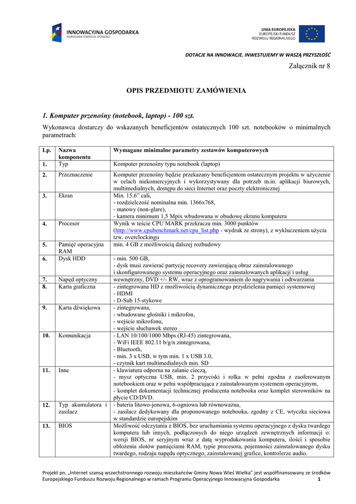 DOTACJE NA INNOWACJE. INWESTUJEMY W WASZĄ PRZYSZŁOŚĆ Załącznik nr 8 OPIS PRZEDMIOTU ZAMÓWIENIA 1. Komputer przenośny (notebook, laptop) - 100 szt. Wykonawca dostarczy do wskazanych beneficjentów ostatecznych 100 szt. notebooków o minimalnych parametrach: Wymagane minimalne parametry zestawów komputerowych 1. Nazwa komponentu Typ 2. Przeznaczenie 3. Ekran 4. Procesor 5. 6. Pamięć operacyjna RAM Dysk HDD Komputer przenośny będzie przekazany beneficjentom ostatecznym projektu w użyczenie w celach niekomercyjnych i wykorzystywany dla potrzeb m.in. aplikacji biurowych, multimedialnych, dostępu do sieci Internet oraz poczty elektronicznej Min. 15.6” cali, - rozdzielczość nominalna min. 1366x768, - matowy (non-glare), - kamera minimum 1,5 Mpix wbudowana w obudowę ekranu komputera Wynik w teście CPU MARK przekracza min. 3000 punktów (http://www.cpubenchmark.net/cpu_list.php - wydruk ze strony), z wykluczeniem użycia tzw. overclockingu min. 4 GB z możliwością dalszej rozbudowy 7. 8. Napęd optyczny Karta graficzna 9. Karta dźwiękowa 10. Komunikacja 11. Inne 12. Typ akumulatora i zasilacz 13. BIOS Lp. Komputer przenośny typu notebook (laptop) - min. 500 GB, - dysk musi zawierać partycję recovery zawierającą obraz zainstalowanego i skonfigurowanego systemu operacyjnego oraz zainstalowanych aplikacji i usług wewnętrzny, DVD +/- RW, wraz z oprogramowaniem do nagrywania i odtwarzania - zintegrowana HD z możliwością dynamicznego przydzielenia pamięci systemowej - HDMI - D-Sub 15-stykowe - zintegrowana, - wbudowane głośniki i mikrofon, - wejście mikrofonu, - wejście słuchawek stereo - LAN 10/100/1000 Mbps (RJ-45) zintegrowana, - WiFi IEEE 802.11 b/g/n zintegrowana, - Bluetooth, - min. 3 x USB, w tym min. 1 x USB 3.0, - czytnik kart multimedialnych min. SD - klawiatura odporna na zalanie cieczą, - mysz optyczna USB, min. 2 przyciski i rolka w pełni zgodna z zaoferowanym notebookiem oraz w pełni współpracująca z zainstalowanym systemem operacyjnym, - komplet dokumentacji technicznej producenta notebooka oraz komplet sterowników na płycie CD/DVD. - bateria litowo-jonowa, 6-ogniowa lub równoważna, - zasilacz dedykowany dla proponowanego notebooka, zgodny z CE, wtyczka sieciowa w standardzie europejskim Możliwość odczytania z BIOS, bez uruchamiania systemu operacyjnego z dysku twardego komputera lub innych, podłączonych do niego urządzeń zewnętrznych informacji o: wersji BIOS, nr seryjnym wraz z datą wyprodukowania komputera, ilości i sposobie obłożenia slotów pamięciami RAM, typie procesora, pojemności zainstalowanego dysku twardego, rodzaju napędu optycznego, zainstalowanej grafice, kontrolerze audio. Projekt pn. „Internet szansą wszechstronnego rozwoju mieszkańców Gminy Nowa Wieś Wielka” jest współfinansowany ze środków Europejskiego Funduszu Rozwoju Regionalnego w ramach Programu Operacyjnego Innowacyjna Gospodarka 1 DOTACJE NA INNOWACJE. INWESTUJEMY W WASZĄ PRZYSZŁOŚĆ 14. Zainstalowane oprogramowanie BIOS winien posiadać: funkcję blokowania/odblokowania BOOT-owania z zewnętrznych urządzeń, możliwość uruchomienia trybu recovery z ukrytej partycji, funkcję blokowania/odblokowania BOOT-owania z USB, możliwość włączenia/wyłączenia hasła dostępu do BIOS Zainstalowany system operacyjny w polskiej wersji językowej musi spełniać następujące wymagania, poprzez wbudowane mechanizmy, bez użycia dodatkowych aplikacji: 1. Możliwość dokonywania aktualizacji i poprawek systemu przez Internet z możliwością wyboru instalowanych poprawek; 2. Możliwość dokonywania uaktualnień sterowników urządzeń przez Internet - witrynę producenta systemu; 3. Darmowe aktualizacje w ramach wersji systemu operacyjnego przez Internet (niezbędne aktualizacje, poprawki, biuletyny bezpieczeństwa muszą być dostarczane bez dodatkowych opłat); 4. Internetowa aktualizacja zapewniona w języku polskim; 5. Wbudowana zapora internetowa (firewall) dla ochrony połączeń internetowych; zintegrowana z systemem konsola do zarządzania ustawieniami zapory i regułami IP v4 i v6; 6. Zlokalizowane w języku polskim, co najmniej następujące elementy: menu, odtwarzacz multimediów, pomoc, komunikaty systemowe; 7. Wsparcie dla większości powszechnie używanych urządzeń peryferyjnych (drukarek, urządzeń sieciowych, standardów USB, Plug&Play, WiFi); 8. Funkcjonalność automatycznej zmiany domyślnej drukarki w zależności od sieci, do której podłączony jest komputer; 9. Interfejs użytkownika działający w trybie graficznym z elementami 3D; 10. Zintegrowana z interfejsem użytkownika interaktywna część pulpitu służąca do uruchamiania aplikacji, które użytkownik może dowolnie wymieniać; 11. Możliwość zdalnej automatycznej instalacji, konfiguracji, administrowania oraz aktualizowania systemu; 12. Zabezpieczony hasłem hierarchiczny dostęp do systemu, konta i profile użytkowników zarządzane zdalnie; 13. Praca systemu w trybie ochrony kont użytkowników; 14. Zintegrowany z systemem moduł wyszukiwania informacji (plików różnego typu) dostępny z kilku poziomów: poziom menu, poziom otwartego okna systemu operacyjnego; 15. System wyszukiwania oparty na konfigurowalnym przez użytkownika module indeksacji zasobów lokalnych; 16. Zintegrowane z systemem operacyjnym narzędzia zwalczające złośliwe oprogramowanie (aktualizacje dostępne u producenta nieodpłatnie bez ograniczeń czasowych); 17. Funkcjonalność rozpoznawania mowy, pozwalająca na sterowanie komputerem głosowo, wraz z modułem „uczenia się” głosu użytkownika; 18. Zintegrowany z systemem operacyjnym moduł synchronizacji komputera z urządzeniami zewnętrznymi; 19. Wbudowany system pomocy w języku polskim; 20. Możliwość przystosowania dla osób niepełnosprawnych (np. słabo widzących); 21. Możliwość zarządzania stacją roboczą poprzez polityki – przez politykę rozumiemy zestaw reguł definiujących lub ograniczający