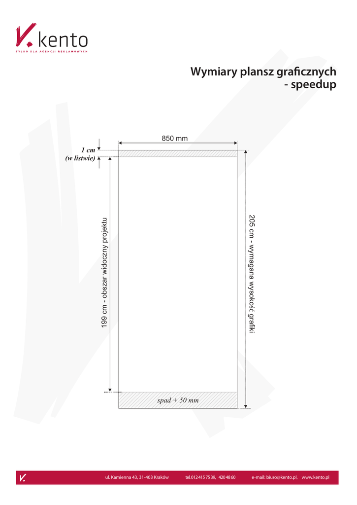 Wymiary plansz graficznych - speedup 850 mm 1 cm (w listwie) 199 cm - obszar widoczny projektu 205 cm - wymagana wysokość grafiki spad + 50 mm ul. Kamienna 43, 31-403 Kraków tel. 012 415 75 39, 420 48 60 e-mail: [email protected], www.kento.pl