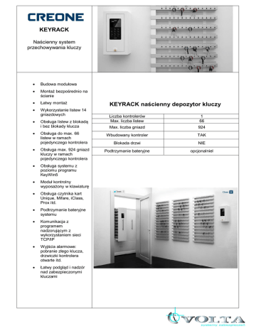 KEYRACK Naścienny system przechowywania kluczy Budowa modułowa Montaż bezpośrednio na ścianie Łatwy montaż Wykorzystanie listew 14 gniazdowych Obsługa listew z blokadą i bez blokady klucza Obsługa do max. 66 listew w ramach pojedynczego kontrolera Obsługa max. 924 gniazd kluczy w ramach pojedynczego kontrolera Obsługa systemu z poziomu programu KeyWin5 Moduł kontrolny wyposażony w klawiaturę Obsługa czytnika kart Unique, Mifare, iClass, Prox itd. Podtrzymanie bateryjne systemu Komunikacja z programem nadzorującym z wykorzystaniem sieci TCP/IP Wyjścia alarmowe: pobranie złego klucza, drzwiczki kontrolera otwarte itd. Łatwy podgląd i nadzór nad zabezpieczonymi kluczami KEYRACK naścienny depozytor kluczy Liczba kontrolerów Max. liczba listew 1 66 Max. liczba gniazd 924 Wbudowany kontroler TAK Blokada drzwi NIE Podtrzymanie bateryjne opcjonalniel Montaż listew bezpośrednio na ścianie Montaż listew w sejfie: