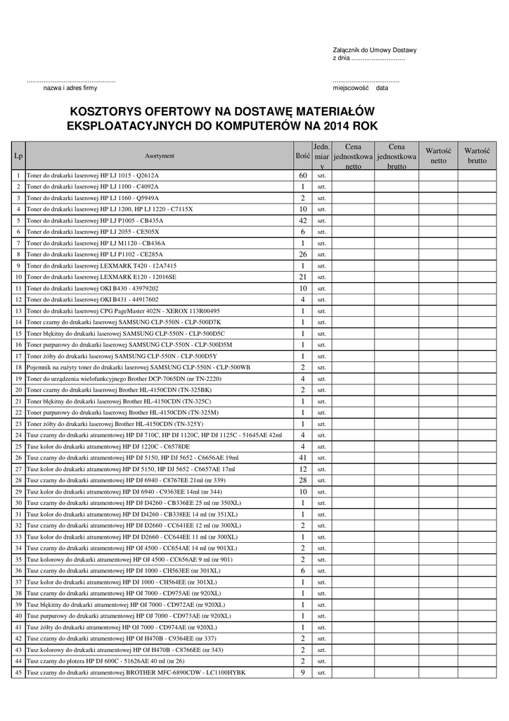 Załącznik do Umowy Dostawy z dnia ............................. ................................................ nazwa i adres firmy .................................... miejscowość data KOSZTORYS OFERTOWY NA DOSTAWĘ MATERIAŁÓW EKSPLOATACYJNYCH DO KOMPUTERÓW NA 2014 ROK Lp Asortyment 1 Toner do drukarki laserowej HP LJ 1015 - Q2612A 2 Toner do drukarki laserowej HP LJ 1100 - C4092A 3 Toner do drukarki laserowej HP LJ 1160 - Q5949A 4 Toner do drukarki laserowej HP LJ 1200, HP LJ 1220 - C7115X 5 Toner do drukarki laserowej HP LJ P1005 - CB435A 6 Toner do drukarki laserowej HP LJ 2055 - CE505X 7 Toner do drukarki laserowej HP LJ M1120 - CB436A 8 Toner do drukarki laserowej HP LJ P1102 - CE285A 9 Toner do drukarki laserowej LEXMARK T420 - 12A7415 10 Toner do drukarki laserowej LEXMARK E120 - 12016SE 11 Toner do drukarki laserowej OKI B430 - 43979202 12 Toner do drukarki laserowej OKI B431 - 44917602 13 Toner do drukarki laserowej CPG PageMaster 402N - XEROX 113R00495 14 Toner czarny do drukarki laserowej SAMSUNG CLP-550N - CLP-500D7K 15 Toner błękitny do drukarki laserowej SAMSUNG CLP-550N - CLP-500D5C 16 Toner purpurowy do drukarki laserowej SAMSUNG CLP-550N - CLP-500D5M 17 Toner żółty do drukarki laserowej SAMSUNG CLP-550N - CLP-500D5Y 18 Pojemnik na zużyty toner do drukarki laserowej SAMSUNG CLP-550N - CLP-500WB 19 Toner do urządzenia wielofunkcyjnego Brother DCP-7065DN (nr TN-2220) 20 Toner czarny do drukarki laserowej Brother HL-4150CDN (TN-325BK) 21 Toner błękitny do drukarki laserowej Brother HL-4150CDN (TN-325C) 22 Toner purpurowy do drukarki laserowej Brother HL-4150CDN (TN-325M) 23 Toner żółty do drukarki laserowej Brother HL-4150CDN (TN-325Y) 24 Tusz czarny do drukarki atramentowej HP DJ 710C, HP DJ 1120C, HP DJ 1125C - 51645AE 42ml 25 Tusz kolor do drukarki atramentowej HP DJ 1220C - C6578DE 26 Tusz czarny do drukarki atramentowej HP DJ 5150, HP DJ 5652 - C6656AE 19ml 27 Tusz kolor do drukarki atramentowej HP DJ 5150, HP DJ 5652 - C6657AE 17ml 28 Tusz czarny do drukarki atramentowej HP DJ 6940 - C8767EE 21ml (nr 339) 29 Tusz kolor do drukarki atramentowej HP DJ 6940 - C9363EE 14ml (nr 344) 30 Tusz czarny do drukarki atramentowej HP DJ D4260 - CB336EE 25 ml (nr 350XL) 31 Tusz kolor do drukarki atramentowej HP DJ D4260 - CB338EE 14 ml (nr 351XL) 32 Tusz czarny do drukarki atramentowej HP DJ D2660 - CC641EE 12 ml (nr 300XL) 33 Tusz kolor do drukarki atramentowej HP DJ D2660 - CC644EE 11 ml (nr 300XL) 34 Tusz czarny do drukarki atramentowej HP OJ 4500 - CC654AE 14 ml (nr 901XL) 35 Tusz kolorowy do drukarki atramentowej HP OJ 4500 - CC656AE 9 ml (nr 901) 36 Tusz czarny do drukarki atramentowej HP DJ 1000 - CH563EE (nr 301XL) 37 Tusz kolor do drukarki atramentowej HP DJ 1000 - CH564EE (nr 301XL) 38 Tusz czarny do drukarki atramentowej HP OJ 7000 - CD975AE (nr 920XL) 39 Tusz błękitny do drukarki atramentowej HP OJ 7000 - CD972AE (nr 920XL) 40 Tusz purpurowy do drukarki atramentowej HP OJ 7000 - CD973AE (nr 920XL) 41 Tusz żółty do drukarki atramentowej HP OJ 7000 - CD974AE (nr 920XL) 42 Tusz czarny do drukarki atramentowej HP OJ H470B - C9364EE (nr 337) 43 Tusz kolorowy do drukarki atramentowej HP OJ H470B - C8766EE (nr 343) 44 Tusz czarny do plotera HP DJ 600C - 51626AE 40 ml (nr 26) 45 Tusz czarny do drukarki atramentowej BROTHER MFC-6890CDW - LC1100HYBK Jedn. Cena Cena Ilość miar jednostkowa jednostkowa y netto brutto 60 szt. szt. 1 szt. 2 10 szt. 42 szt. szt. 6 szt. 1 26 szt. szt. 1 21 szt. 10 szt. szt. 4 szt. 1 szt. 1 szt. 1 szt. 1 szt. 1 szt. 2 szt. 4 szt. 2 szt. 1 szt. 1 szt. 1 szt. 4 szt. 4 41 szt. 12 szt. 28 szt. 10 szt. szt. 1 szt. 1 szt. 2 szt. 1 szt. 2 szt. 2 szt. 6 szt. 1 szt. 1 szt. 1 szt. 1 szt. 1 szt. 2 szt. 2 szt. 2 szt. 9 Wartość netto Wartość brutto 2 Tusz purpurowy do drukarki atramentowej BROTHER MFC-6890CDW - LC1100HYM 2 Tusz żółty do drukarki atramentowej BROTHER MFC-6890CDW - LC1100HYY 3 Tusz czarny do drukarki atramentowej HP OJ Pro 8100 - CN045AE (950XL) 1 Tusz błękitny do drukarki atramentowej HP OJ Pro 8100 - CN046AE (951XL) 1 Tusz purpurowy do drukarki atramentowej HP OJ Pro 8100 - CN047AE (951XL) 1 Tusz żółty do drukarki atramentowej HP OJ Pro 8100 - CN048AE (951XL) 1 Czarny tusz 400ml + głowica do drukarki OCE TCS 500 - Combi-pack Black (29953720) 1 Czarny tusz 2x400ml + głowica do drukarki OCE TCS 500 - Combi-pack XL Black (29953724) 1 Błękitny tusz 2x400ml + głowica do drukarki OCE TCS 500 - Combi-pack XL Cyan (29953723) 1 Purpurowy tusz 2x400ml + głowica do drukarki OCE TCS 500 - Combi-pack XL Magenta (29953725) 1 Żółty tusz 2x400ml + głowica do drukarki OCE TCS 500 - Combi-pack XL Yellow (29953726) 1 Taśma do drukarki igłowej PANASONIC KX-P 1150 - KX-P 115 2 Płyta CD-R 700 MB 700 Płyta DVD-R 4,7 GB 700 Koperta na płytę CD/DVD z foliowym okienkiem (pakowane po 100 szt.) 4 46 Tusz błękitny do drukarki atramentowej BROTHER MFC-6890CDW - LC1100HYC szt. 47 szt. 48 49 50 51 52 53 54 55 56 57 58 59 60 61 szt. szt. szt. szt. szt. szt. szt. szt. szt. szt. szt. szt. szt. op. RAZEM: ............................................................. Imię i Nazwisko oraz pieczęć imienna