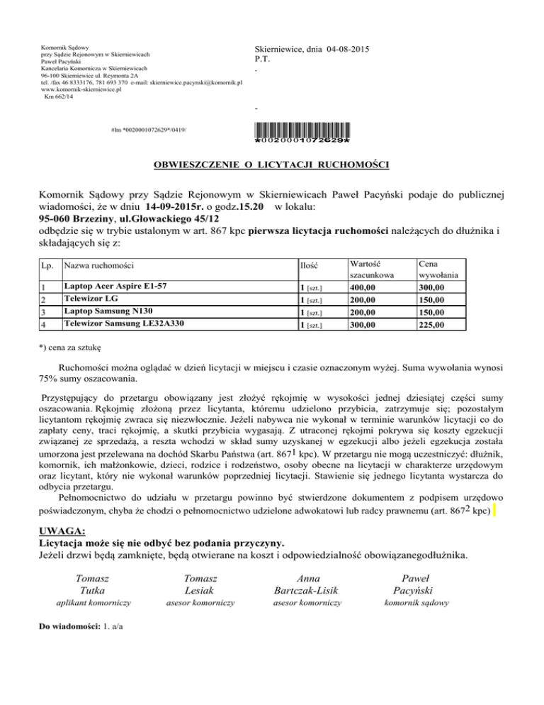 Komornik Sądowy przy Sądzie Rejonowym w Skierniewicach Paweł Pacyński Kancelaria Komornicza w Skierniewicach 96-100 Skierniewice ul. Reymonta 2A tel. /fax 46 8333176, 781 693 370 e-mail: [email protected] www.komornik-skierniewice.pl Km 662/14 Skierniewice, dnia 04-08-2015 P.T. . #łm *0020001072629*/0419/ *0020001072629* OBWIESZCZENIE O LICYTACJI RUCHOMOŚCI Komornik Sądowy przy Sądzie Rejonowym w Skierniewicach Paweł Pacyński podaje do publicznej wiadomości, że w dniu 14-09-2015r. o godz.15.20 w lokalu: 95-060 Brzeziny, ul.Głowackiego 45/12 odbędzie się w trybie ustalonym w art. 867 kpc pierwsza licytacja ruchomości należących do dłużnika i składających się z: Lp. Nazwa ruchomości Ilość 1 2 3 4 Laptop Acer Aspire E1-57 Telewizor LG Laptop Samsung N130 Telewizor Samsung LE32A330 1 [szt.] 1 [szt.] 1 [szt.] 1 [szt.] Wartość szacunkowa 400,00 200,00 200,00 300,00 Cena wywołania 300,00 150,00 150,00 225,00 *) cena za sztukę Ruchomości można oglądać w dzień licytacji w miejscu i czasie oznaczonym wyżej. Suma wywołania wynosi 75% sumy oszacowania. Przystępujący do przetargu obowiązany jest złożyć rękojmię w wysokości jednej dziesiątej części sumy oszacowania. Rękojmię złożoną przez licytanta, któremu udzielono przybicia, zatrzymuje się; pozostałym licytantom rękojmię zwraca się niezwłocznie. Jeżeli nabywca nie wykonał w terminie warunków licytacji co do zapłaty ceny, traci rękojmię, a skutki przybicia wygasają. Z utraconej rękojmi pokrywa się koszty egzekucji związanej ze sprzedażą, a reszta wchodzi w skład sumy uzyskanej w egzekucji albo jeżeli egzekucja została umorzona jest przelewana na dochód Skarbu Państwa (art. 8671 kpc). W przetargu nie mogą uczestniczyć: dłużnik, komornik, ich małżonkowie, dzieci, rodzice i rodzeństwo, osoby obecne na licytacji w charakterze urzędowym oraz licytant, który nie wykonał warunków poprzedniej licytacji. Stawienie się jednego licytanta wystarcza do odbycia przetargu. Pełnomocnictwo do udziału w przetargu powinno być stwierdzone dokumentem z podpisem urzędowo poświadczonym, chyba że chodzi o pełnomocnictwo udzielone adwokatowi lub radcy prawnemu (art. 8672 kpc) UWAGA: Licytacja może się nie odbyć bez podania przyczyny. Jeżeli drzwi będą zamknięte, będą otwierane na koszt i odpowiedzialność obowiązanegodłużnika. Tomasz Tutka Tomasz Lesiak Anna Bartczak-Lisik aplikant komorniczy asesor komorniczy asesor komorniczy Do wiadomości: 1. a/a Paweł Pacyński komornik sądowy