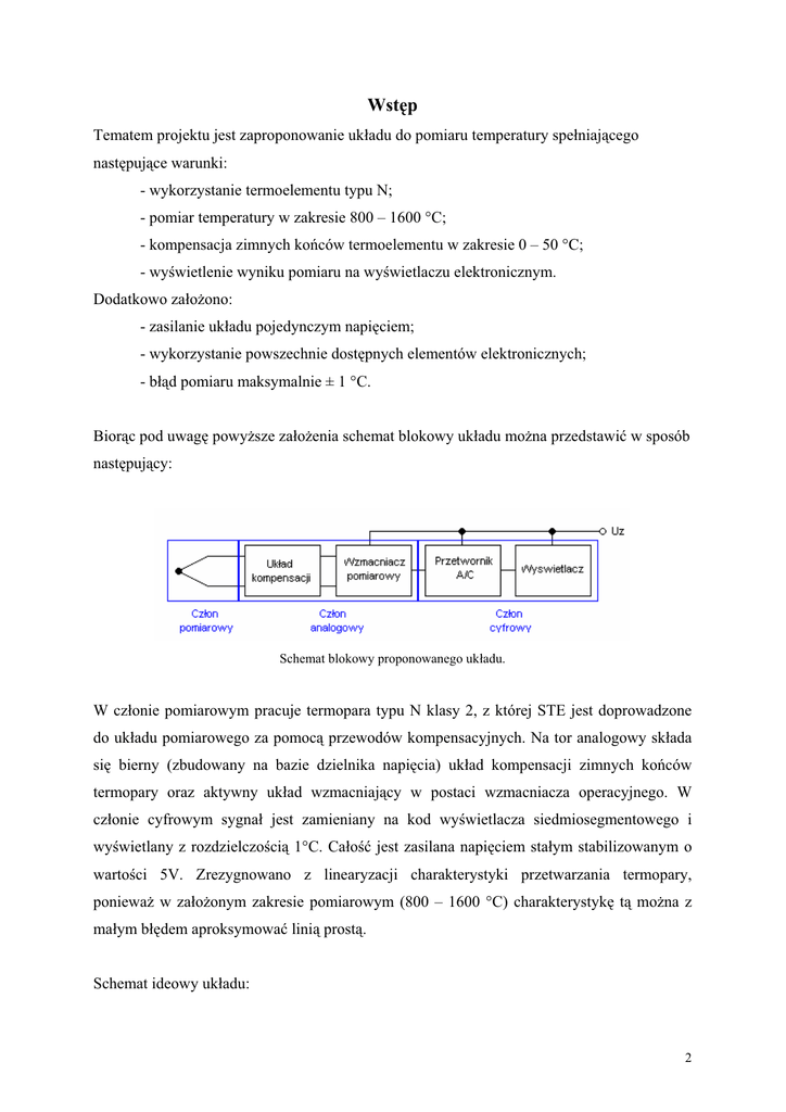 WstĊp Tematem projektu jest zaproponowanie ukáadu do pomiaru temperatury speániającego nastĊpujące warunki: - wykorzystanie termoelementu typu N; - pomiar temperatury w zakresie 800 – 1600 °C; - kompensacja zimnych koĔców termoelementu w zakresie 0 – 50 °C; - wyĞwietlenie wyniku pomiaru na wyĞwietlaczu elektronicznym. Dodatkowo zaáoĪono: - zasilanie ukáadu pojedynczym napiĊciem; - wykorzystanie powszechnie dostĊpnych elementów elektronicznych; - báąd pomiaru maksymalnie ± 1 °C. Biorąc pod uwagĊ powyĪsze zaáoĪenia schemat blokowy ukáadu moĪna przedstawiü w sposób nastĊpujący: Schemat blokowy proponowanego ukáadu. W czáonie pomiarowym pracuje termopara typu N klasy 2, z której STE jest doprowadzone do ukáadu pomiarowego za pomocą przewodów kompensacyjnych. Na tor analogowy skáada siĊ bierny (zbudowany na bazie dzielnika napiĊcia) ukáad kompensacji zimnych koĔców termopary oraz aktywny ukáad wzmacniający w postaci wzmacniacza operacyjnego. W czáonie cyfrowym sygnaá jest zamieniany na kod wyĞwietlacza siedmiosegmentowego i wyĞwietlany z rozdzielczoĞcią 1°C. CaáoĞü jest zasilana napiĊciem staáym stabilizowanym o wartoĞci 5V. Zrezygnowano z linearyzacji charakterystyki przetwarzania termopary, poniewaĪ w zaáoĪonym zakresie pomiarowym (800 – 1600 °C) charakterystykĊ tą moĪna z maáym báĊdem aproksymowaü linią prostą. Schemat ideowy ukáadu: 2 Schemat ideowy ukáadu do pomiaru temperatury Opis i dziaáanie ukáadu Ukáad kompensacji temperaturowej zimnych koĔców termopary zrealizowano w obwodzie U1, R1, R2. Ukáad LM 35 jest scalonym przetwornikiem temperatura / napiĊcie o nachyleniu charakterystyki przetwarzania 10 mV/°C. Jako temperaturĊ odniesienia przyjĊto 0 °C. Sygnaá z wyjĞcia U1 trafia na dzielnik napiĊcia zbudowany na R1, R2. Jego przekáadnia jest równa wspóáczynnikowi Seebeck’a zastosowanej termopary (39,29 μV/°C). W wyniku tego kaĪda zmiana temperatury otoczenia ǻT powoduje powstanie na rezystancji R2 napiĊcia równego: U R2 'T , R1 R2 np. U R 2 1qC 25450 39,29 PV NapiĊcie to dodane do STE termopary podawane jest poprzez dzielnik napiĊcia R3 R4 na wejĞcie nieodwracające wzmacniacza operacyjnego U2. Wzmocnienie wzmacniacza dobrano elementami R5 R6 P1 w taki sposób, aby w zakresie temperatur 800 – 1600°C, czemu odpowiada zakres STE termoelementu 28,46 – 58,4 mV, napiĊcie na wyjĞciu wzmacniacza operacyjnego wynosiáo 800 – 1600 mV. Potencjometr P1 typu heltrim sáuĪy do dokáadnej regulacji tego wzmocnienia. DziĊki temu moĪliwe staáo siĊ zastosowanie w czáonie cyfrowym zwykáego woltomierza wyskalowanego w stopniach Celsjusza. Woltomierz ten zbudowano w oparciu o fabryczną aplikacjĊ ukáadu ICL 7107, który jest scalonym przetwornikiem A/C dziaáającym na zasadzie podwójnego caákowania. Posiada on wyjĞcia bezpoĞrednio sterujące czterema segmentami wyĞwietlaczy LED, co daje maksymalne wskazanie 1999 (3½ cyfry). WartoĞci dzielnika napiĊü R8 R9 P1 dobrano w ten sposób, Īeby U4 pracowaá na zakresie 0…2V. W ten sposób na wyĞwietlaczu w sposób bezpoĞredni bĊdzie pokazywana wartoĞü temperatury. Elementy R10 C4 decydują o wartoĞci czĊstotliwoĞci wewnĊtrznego generatora taktującego i zostaáy tak dobrane, aby wynosiáa ona 50kHz. Wtedy uzyskuje siĊ zminimalizowanie zakáóceĔ sieciowych. Diody prostownicze D1 D2 D3 ograniczają jasnoĞü wyĞwietlacza, a poniewaĪ segmenty LED są bezpoĞrednio sterowane z wyjĞü ukáadu ICL7107, diody zmniejszają nagrzewanie siĊ ukáadu. Do poprawnej pracy U4 wymaga podania na wejĞcie V- (wyprowadzenie 26) napiĊcia ujemnego (-5…-3V), które z zaáoĪenia nie bĊdzie dostarczane przez zasilacz. Zastosowano wiĊc powielacz diodowy C8 C9 D4 D5 sterowany przebiegiem prostokątnym z wyjĞcia oscylatora ukáadu U4 wzmocnionym prądowo przez równolegle poáączonych inwertorów mocy zawartych w ukáadzie U3 (CD4049). Do zasilania termometru uĪyto scalony stabilizator napiĊcia uA7805 wraz z wáaĞciwymi kondensatorami filtrującymi C10 C11 C12. Komputerowa analiza dziaáania ukáadu. AnalizĊ dziaáania ukáadu przeprowadzono w programie PSpice 9.1. Zbadano zachowanie siĊ tylko toru analogowego ze wzglĊdu na brak modelu matematycznego ukáadu ICL7107 w bibliotece elementów programu. AnalizĊ rozpoczĊto od zbadania sygnaáu na wyjĞciu wzmacniacza pomiarowego przy zmianach STE termopary w granicach 28,46 – 58,40 mV (odpowiada to zmianom temperatury 800 – 1600 °C). TemperaturĊ odniesienia przyjĊto staáą, równa 0 °C. Badany ukáad i charakterystykĊ przejĞciową przedstawiono na rysunku poniĪej. Schemat wykorzystany w symulacji (powyĪej) i charakterystyka przejĞciowa toru pomiarowego (poniĪej) 5 NastĊpnie sprawdzono dziaáanie ukáadu kompensacji temperaturowej zimnych koĔców termopary w ukáadzie przedstawionym poniĪej. ħródáo napiĊcia staáego V2 symulowaáo ukáad LM35. Zmieniano jego napiĊcie w zakresie 0 – 500mV, co odpowiada temperaturze 0 50 °C. Symulacje przeprowadzono przy temperaturze termopary wynoszącej 800 (28,455mV) i 1550 (56,575mV)stopni. 6 Analiza báĊdów ukáadu. 7