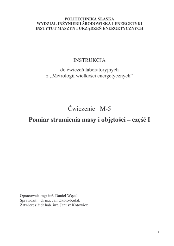 POLITECHNIKA L SKA WYDZIAŁ IN YNIERII RODOWISKA I ENERGETYKI INSTYTUT MASZYN I URZ DZE ENERGETYCZNYCH INSTRUKCJA do wicze laboratoryjnych z „Metrologii wielko ci energetycznych” wiczenie M-5 Pomiar strumienia masy i obj to ci – cz I Opracował: mgr in . Daniel W cel Sprawdził: dr in . Jan Około-Kułak Zatwierdził: dr hab. in . Janusz Kotowicz 1 Cel wiczenia: Celem wiczenia jest poznanie podstawowych technik pomiaru strumienia masy powietrza wilgotnego w ruroci gach za pomoc : metod zw kowych i pomiaru pr dko ci w przekroju kanał. 1. Prawie w ka dym procesie technologicznym wyst puje przepływ jakiej substancji. Czy to w elektrowni czy w hucie przepływ cieczy lub gazu wyst puje prawie na ka dym kroku. Ilo przepływaj cej substancji, podobnie jak jej parametry, wpływaj na prac danego zakładu. Nale y je oczywi cie tak dobra aby praca była jak najbardziej efektywna, a koszty jak najni sze. Ale eby je dobra trzeba zna ich warto ci, czyli nale y je zmierzy . I tym wła nie b dziecie si zajmowa na laboratorium, czyli pomiarem strumienia obj to ci lub masy (inaczej zwanym obj to ciowym lub masowym nat eniem przepływu) powietrza wilgotnego przepływaj cego przez ruroci g pomiarowy. W przypadku płynów ci liwych tzn. gdy g sto ρ=ρ(p,T) lepiej posługiwa si poj ciem strumienia masy. Do tego wykorzystacie kilka przyrz dów pomiarowych, o których słyszeli cie ju na wykładzie tj.: kryz ISA z przytarczowym odbiorem ci nienia, klasyczn zw k Venturiego, termoanemomet, rurk spi trzaj c Prandtla, anemometr czaszowy. Niestety obfito metod i przyrz dów pomiarowych stosowanych przy pomiarach strumieni masy i obj to ci uniemo liwia pełn prezentacj materiału zawieraj cego podstawy teoretyczne poszczególnych metod i przyrz dów. Je li co umkn ło Twojej uwadze na wykładzie, w tej instrukcji znajdziesz wiele wiadomo ci teoretycznych oraz sposób wykonywania pomiarów i opracowania wyników. 2. wiczenie niew tpliwie pozwoli zorientowa si w wielko ci przepływaj cego powietrza w ruroci gu oraz innych parametrów powietrza pozwalaj cych obliczy strumie obj to ci lub masy (chodzi głównie o pr dko przepływu oraz spadek ci nienia na zw kach). Umo liwi równie praktyczne wykorzystanie ró nych manometrów, którymi na co dzie nie dokonuje si pomiarów. Ponadto b dziesz musiał wykorzysta tablice fizyczne oraz szereg wzorów które mo na znale np. w polskich normach. Daje to szans zapoznania si z rzadko u ywanym na co dzie lecz niezb dnym w pracy in yniera dokumentem jakim jest norma. 3. Przyrz dy do pomiaru strumienia obj to ci lub masy w rzeczywisto ci nie mierz tej wielko ci, mierzymy nimi spadki ci nie lub pr dko ci które nast pnie 2 przeliczamy na strumie . Przyrz dy umo liwiaj ce mierzenie strumienia masy i obj to ci mo na podzieli na nast puj ce grupy: a. wykorzystuj ce zjawisko dławienia przepływaj cej strugi (najliczniejsza i najcz ciej spotykana w praktyce): I. zw ki miernicze: kryza; dysza (ISA, Venturiego); klasyczna zw ka Venturiego; kryza segmentowa, II. przepływomierze pływakowe tzw. Rotametry (elementy dławi ce o stałym spadku ci nienia), III. danaidy: jednozw kowa, dwuzw kowa, IV. przelewy miernicze, V. zw kowe kanały miernicze. b. umo liwiaj ce pomiary pr dko ci miejscowych: I. rurki spi trzaj ce: Prandtla, Brabbéego, II. młynki hydrometryczne Otta, III. anemometry: skrzydełkowy, czaszowy, IV. termoanemometry, V. katatermometry. c. pozostałe: I. przepływomierze elektromagnetyczne (do cieczy o małych przewodno ciach elektrycznych m.in. muły, szlamy, cieki), II. przepływomierze ultrad wi kowe (mog by wzorcowane metod po redni tzn. w oparciu o model matematyczny → pomiar pr dko ci redniej mierzonej po drodze fali ultrad wi kowej umiejscowionej w rednicy). Powy sze dwa przepływomierze charakteryzuj si nast puj cymi zaletami: brak spadku ci nienia, mo liwo instalowania na pełnym ruroci gu, niewra liwo na nierównomierny rozkład pr dko ci i nieuspokojon strug . W układzie pomiarowym zainstalowano wentylator promieniowy zasysaj cy przewodem ss cym wilgotne powietrze o parametrach po, to, ϕo i po spr eniu odprowadza go przewodem tłocz cym na hal . Przewód ss cy i tłocz cy s ruroci gami stalowymi o przekroju kołowym. Wewn trzna rednica przewodu rednica przewodu tłocz cego ss cego wynosi Ds = 494 mm, natomiast Dt = 400 mm, maksymalna nierówno powierzchni wewn trznej ruroci gu = 0,2 mm. Na ruroci gu ss cym wentylatora jest zainstalowana kryza ISA z przytarczowym pomiarem spadku ci nienia. rednica kryzy d20=260,3 mm, promie zaokr glenia kraw dzi wlotowej kryzy rk=0,2 mm. Na ruroci gu tłocz cym wentylatora jest zainstalowana klasyczna zw ka Venturiego. rednica gardzieli zw ki d20=187 mm, na której znajduje si jeden otwór odbioru ci nienia statycznego. Do kryzy i zw ki podł czone s jednoramienne cieczowe manometry ró nicowe zabudowane na tablicy pomiarowej. Składaj si one ze szklanej rurki wyskalowanej w [mm] poł czonej ze zbiornikiem wypełnionym ciecz manometryczn . Stosunek k przekroju wewn trznego rurki manometru do przekroju wewn trznego zbiornika wynosi: 3 A1 4 = A2 80 2 = 0,0025 i st d mo na zało y , e poziom cieczy w zbiorniku nie b dzie praktycznie ulegał zmianie. Zw ka Venturiego p2 Sto ek dławi cy t1 Rurka Prandtla Kryza ISA t2 p2 t 1’ p1, p1 pss Wentylator pd Rys.1 Schemat instalacji pomiarowej a) Kryza ISA Zw ka miernicza jest urz dzeniem zmniejszaj cym pole powierzchni wewn trznego przekroju ruroci gu, tzn. urz dzeniem stanowi cym dodatkowy opór dla strugi przepływaj cego płynu. Przy przepływie przez opór struga zostaje zdławiona i na zw ce mierniczej wyst pi spadek ci nienia statycznego. Pomi dzy strumieniem masy i spadkiem ci nienia na zw ce mierniczej wyst puj zale no ci (dla ustalenia ich nale y sporz dzi bilans energetyczny przepływaj cej przez zmniejszony przekrój strugi). Zakłada si , e jest zachowana ci gło strugi przepływaj cego płynu i e jego g sto w czasie przepływu przez zmniejszony przekrój nie ulega zmiani