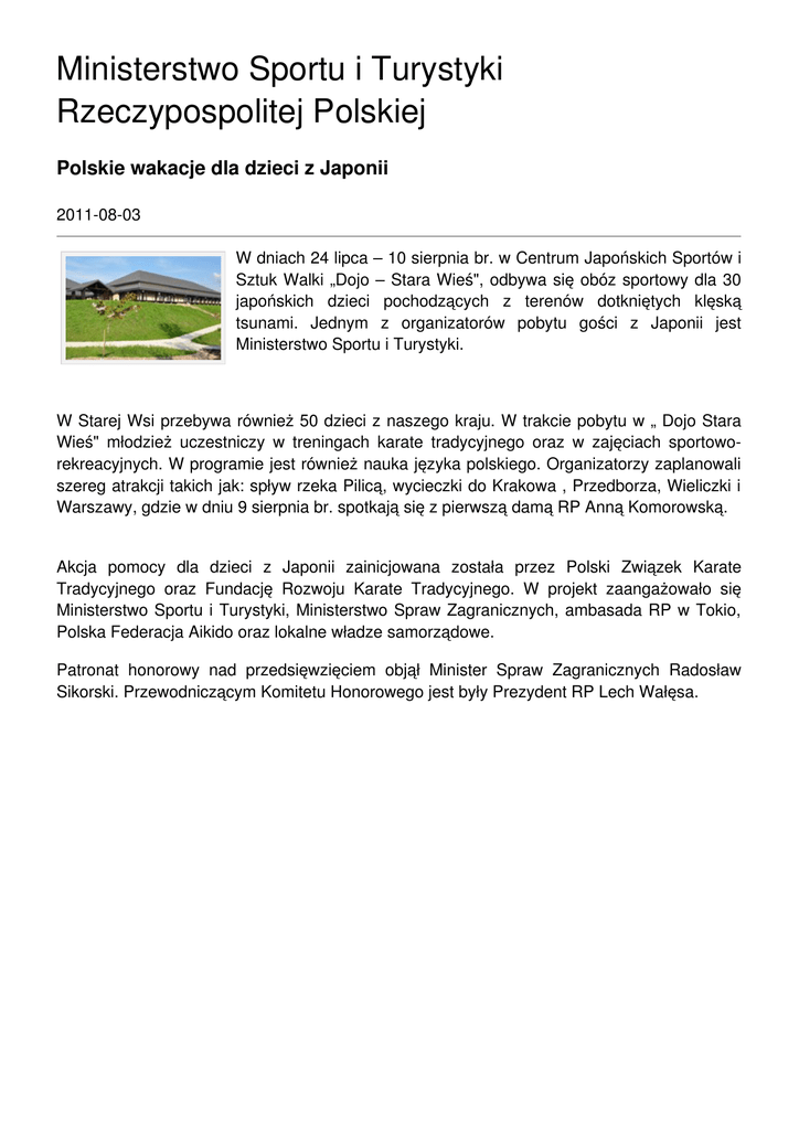 Ministerstwo Sportu i Turystyki Rzeczypospolitej Polskiej Polskie wakacje dla dzieci z Japonii 2011-08-03 W dniach 24 lipca – 10 sierpnia br. w Centrum Japońskich Sportów i Sztuk Walki „Dojo – Stara Wieś", odbywa się obóz sportowy dla 30 japońskich dzieci pochodzących z terenów dotkniętych klęską tsunami. Jednym z organizatorów pobytu gości z Japonii jest Ministerstwo Sportu i Turystyki. W Starej Wsi przebywa również 50 dzieci z naszego kraju. W trakcie pobytu w „ Dojo Stara Wieś" młodzież uczestniczy w treningach karate tradycyjnego oraz w zajęciach sportoworekreacyjnych. W programie jest również nauka języka polskiego. Organizatorzy zaplanowali szereg atrakcji takich jak: spływ rzeka Pilicą, wycieczki do Krakowa , Przedborza, Wieliczki i Warszawy, gdzie w dniu 9 sierpnia br. spotkają się z pierwszą damą RP Anną Komorowską. Akcja pomocy dla dzieci z Japonii zainicjowana została przez Polski Związek Karate Tradycyjnego oraz Fundację Rozwoju Karate Tradycyjnego. W projekt zaangażowało się Ministerstwo Sportu i Turystyki, Ministerstwo Spraw Zagranicznych, ambasada RP w Tokio, Polska Federacja Aikido oraz lokalne władze samorządowe. Patronat honorowy nad przedsięwzięciem objął Minister Spraw Zagranicznych Radosław Sikorski. Przewodniczącym Komitetu Honorowego jest były Prezydent RP Lech Wałęsa.