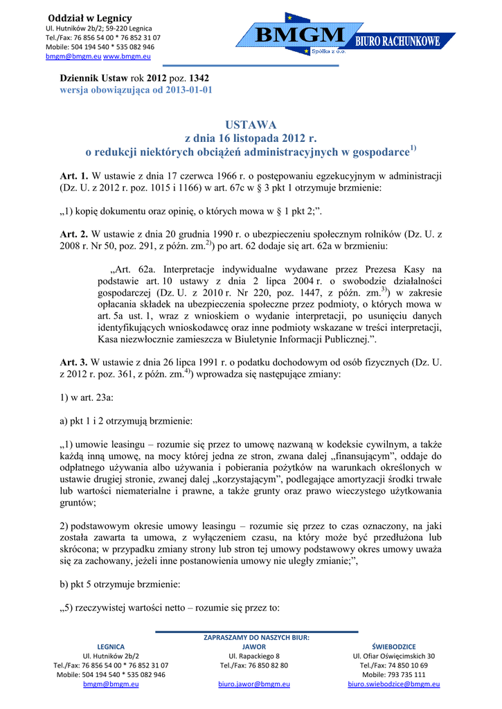 Oddział w Legnicy Ul. Hutników 2b/2; 59-220 Legnica Tel./Fax: 76 856 54 00 * 76 852 31 07 Mobile: 504 194 540 * 535 082 946 [email protected] www.bmgm.eu Dziennik Ustaw rok 2012 poz. 1342 wersja obowiązująca od 2013-01-01 USTAWA z dnia 16 listopada 2012 r. o redukcji niektórych obciążeń administracyjnych w gospodarce1) Art. 1. W ustawie z dnia 17 czerwca 1966 r. o postępowaniu egzekucyjnym w administracji (Dz. U. z 2012 r. poz. 1015 i 1166) w art. 67c w § 3 pkt 1 otrzymuje brzmienie: „1) kopię dokumentu oraz opinię, o których mowa w § 1 pkt 2;”. Art. 2. W ustawie z dnia 20 grudnia 1990 r. o ubezpieczeniu społecznym rolników (Dz. U. z 2008 r. Nr 50, poz. 291, z późn. zm.2)) po art. 62 dodaje się art. 62a w brzmieniu: „Art. 62a. Interpretacje indywidualne wydawane przez Prezesa Kasy na podstawie art. 10 ustawy z dnia 2 lipca 2004 r. o swobodzie działalności gospodarczej (Dz. U. z 2010 r. Nr 220, poz. 1447, z późn. zm.3)) w zakresie opłacania składek na ubezpieczenia społeczne przez podmioty, o których mowa w art. 5a ust. 1, wraz z wnioskiem o wydanie interpretacji, po usunięciu danych identyfikujących wnioskodawcę oraz inne podmioty wskazane w treści interpretacji, Kasa niezwłocznie zamieszcza w Biuletynie Informacji Publicznej.”. Art. 3. W ustawie z dnia 26 lipca 1991 r. o podatku dochodowym od osób fizycznych (Dz. U. z 2012 r. poz. 361, z późn. zm.4)) wprowadza się następujące zmiany: 1) w art. 23a: a) pkt 1 i 2 otrzymują brzmienie: „1) umowie leasingu – rozumie się przez to umowę nazwaną w kodeksie cywilnym, a także każdą inną umowę, na mocy której jedna ze stron, zwana dalej „finansującym”, oddaje do odpłatnego używania albo używania i pobierania pożytków na warunkach określonych w ustawie drugiej stronie, zwanej dalej „korzystającym”, podlegające amortyzacji środki trwałe lub wartości niematerialne i prawne, a także grunty oraz prawo wieczystego użytkowania gruntów; 2) podstawowym okresie umowy leasingu – rozumie się przez to czas oznaczony, na jaki została zawarta ta umowa, z wyłączeniem czasu, na który może być przedłużona lub skrócona; w przypadku zmiany strony lub stron tej umowy podstawowy okres umowy uważa się za zachowany, jeżeli inne postanowienia umowy nie uległy zmianie;”, b) pkt 5 otrzymuje brzmienie: „5) rzeczywistej wartości netto – rozumie się przez to: LEGNICA Ul. Hutników 2b/2 Tel./Fax: 76 856 54 00 * 76 852 31 07 Mobile: 504 194 540 * 535 082 946 [email protected] ZAPRASZAMY DO NASZYCH BIUR: JAWOR Ul. Rapackiego 8 Tel./Fax: 76 850 82 80 [email protected] ŚWIEBODZICE Ul. Ofiar Oświęcimskich 30 Tel./Fax: 74 850 10 69 Mobile: 793 735 111 [email protected] a) wartość początkową środków trwałych lub wartości niematerialnych i prawnych zaktualizowaną zgodnie z odrębnymi przepisami, pomniejszoną o sumę odpisów amortyzacyjnych, o których mowa w art. 22h ust. 1 pkt 1, b) wartość, o której mowa w art. 22ł ust. 6;”; 2) w art. 23b w ust. 1: a) pkt 1 otrzymuje brzmienie: „1) umowa leasingu, w przypadku gdy korzystającym nie jest osoba wymieniona w pkt 2, została zawarta na czas oznaczony, stanowiący co najmniej 40% normatywnego okresu amortyzacji, jeżeli przedmiotem umowy leasingu są podlegające odpisom amortyzacyjnym rzeczy ruchome lub wartości niematerialne i prawne, albo została zawarta na okres co najmniej 5 lat, jeżeli jej przedmiotem są podlegające odpisom amortyzacyjnym nieruchomości;”, b) pkt 3 otrzymuje brzmienie: „3) suma ustalonych opłat w umowie leasingu, o której mowa w pkt 1 lub 2, pomniejszona o należny podatek od towarów i usług, odpowiada co najmniej wartości początkowej środków trwałych lub wartości niematerialnych i prawnych, a w przypadku zawarcia przez finansującego następnej umowy leasingu środka trwałego lub wartości niematerialnej i prawnej będących uprzednio przedmiotem takiej umowy odpowiada co najmniej jego wartości rynkowej z dnia zawarcia następnej umowy leasingu; przepis art. 19 stosuje się odpowiednio.”; 3) w art. 23f: a) w ust. 1: – zdanie wstępne otrzymuje brzmienie: „Do przychodów finansującego, z zastrzeżeniem ust. 3, i odpowiednio do kosztów uzyskania przychodów korzystającego nie zalicza się opłat, o których mowa w art. 23b ust. 1, w części stanowiącej spłatę wartości początkowej środków trwałych lub wartości niematerialnych i prawnych, jeżeli są spełnione łącznie następujące warunki:”, – pkt 2 otrzymuje brzmienie: „2) suma ustalonych w umowie leasingu opłat, pomniejszona o należny podatek od towarów i usług, odpowiada co najmniej wartości początkowej środków trwałych lub wartości niematerialnych i prawnych, a w przypadku zawarcia przez finansującego następnej umowy leasingu środka trwałego lub wartości niematerialnej i prawnej będących uprzednio przedmiotem takiej umowy odpowiada co najmniej jego wartości rynkowej z dnia zawarcia następnej umowy leasingu; przepis art. 19 stosuje się odpowiednio;”, b) dodaje się ust. 3 w brzmieniu: „3. Do przychodów finansującego zalicza się opłaty, o których mowa w art. 23b ust. 1, uzyskane z tytułu wszystkich umów leasingu zawartych przez finansującego dotyczących Strona 2 z 23 www.bmgm.eu tego samego środka trwałego lub wartości niematerialnej i prawnej, w części przewyższającej spłatę wartości początkowej, określonej zgodnie z art. 22g.”; 4) art. 23i otrzymuje brzmienie: „Art. 23i. 1. Jeżeli przedmiotem umowy leasingu zawartej na czas oznaczony są grunty lub prawo wieczystego użytkowania gruntów, a suma ustalonych w niej opłat odpowiada co najmniej wartości gruntów lub prawa wieczystego użytkowania gruntów równej wydatkom na ich nabycie – do przychodów finansującego i odpowiednio do kosztów uzyskania przychodów korzystającego nie zalicza się opłat ustalonych w tej umowie, ponoszonych przez korzystającego w podstawowym okresie tej um