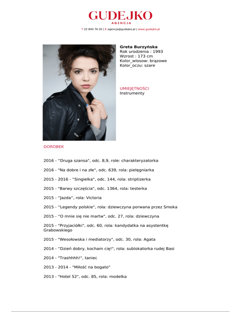 T 22 840 76 20 | E [email protected] | www.gudejko.pl Greta Burzyńska Rok urodzenia : 1993 Wzrost : 173 cm Kolor_wlosow: brązowe Kolor_oczu: szare UMIEJĘTNOŚCI Instrumenty DOROBEK 2016 - ''Druga szansa", odc. 8,9, role: charakteryzatorka 2016 - "Na dobre i na złe", odc. 639, rola: pielęgniarka 2015 - 2016 - ''Singielka", odc. 144, rola: striptizerka 2015 - "Barwy szczęścia", odc. 1364, rola: testerka 2015 - ''Jazda'', rola: Victoria 2015 - ''Legendy polskie", rola: dziewczyna porwana przez Smoka 2015 - ''O mnie się nie martw", odc. 27, rola: dziewczyna 2015 - "Przyjaciółki", odc. 60, rola: kandydatka na asystentkę Grabowskiego 2015 - "Wesołowska i mediatorzy", odc. 30, rola: Agata 2014 - ''Dzień dobry, kocham cię!", rola: sublokatorka rudej Basi 2014 - "Trashhhh!", taniec 2013 - 2014 - "Miłość na bogato" 2013 - "Hotel 52", odc. 85, rola: modelka Powered by TCPDF (www.tcpdf.org)