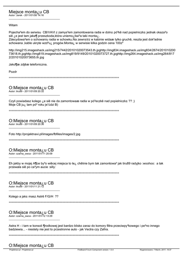 Miejsce monta¿u CB Autor: Jarek - 2011/01/08 14:16 _____________________________________ Witam Pojecha³em do serwisu CB/VAVI z zamys³em zamontowania radia w doln± pó³kê nad popielniczk± jednak okaza³o siê ¿e jest tam jaka¶ przeszkoda,która uniemo¿liwi³a taki monta¿. Zdecydowa³em o schowaniu radia w schowku.Na zewn±trz w kabinie widaæ tylko gruchê, reszta jest dok³adnie schowana ,kable ukryte wzd³u¿ progów.Monta¿ w serwisie kilka godzin cena 100z³ http://img215.imageshack.us/img215/7442/20101020073543.th.jpghttp://img834.imageshack.us/img834/2674/201010200 73618.th.jpghttp://img819.imageshack.us/img819/9149/20101020073727.th.jpghttp://img264.imageshack.us/img264/817 2/20101020073655.th.jpg Jako¶æ zdjêæ telefoniczna. Pozdr ============================================================================ O:Miejsce monta¿u CB Autor: tiru89 - 2011/01/09 20:32 _____________________________________ Czyli powiadasz kolego ¿e siê nie da zamontowaæ radia w pó³eczkê nad popielniczk± ?? ;) Moje CB ju¿ tam pó³ roku je¼dzi B) ============================================================================ O:Miejsce monta¿u CB Autor: tiru89 - 2011/01/09 20:36 _____________________________________ Foto http://projektnavi.pl/images/fbfiles/images/2.jpg ============================================================================ O:Miejsce monta¿u CB Autor: czarna_owca - 2011/01/11 20:09 _____________________________________ Eh jakby w mojej A¶ce by³o wiêcej miejsca to te¿ chêtnie bym tak zamontowa³ jak tiru89 radyjko :woohoo: a tak przewala siê po ca³ym aucie :silly: ============================================================================ O:Miejsce monta¿u CB Autor: tiru89 - 2011/01/11 21:12 _____________________________________ Kolego a jak± masz Astrê F/G/H ?? ============================================================================ O:Miejsce monta¿u CB Autor: czarna_owca - 2011/01/12 13:29 _____________________________________ Astra H - i tam w konsoli ¶rodkowej jest bardzo blisko zaraz do komory filtra przeciwpy³kowego i pe³no innego badziewia... - niestety nie jest to przestronne auto - jak Vectra czy Zafira. ============================================================================ O:Miejsce monta¿u CB Projektnavi.pl - Projektnavi.pl FireBoard Forum Component version: 1.0.4 Wygenerowano: 7 March, 2017, 19:37 Autor: Luca san - 2011/03/03 10:03 _____________________________________ Witam. Chcia³bym od¶wie¿yæ temat. Podobnie jak wiêkszo¶æ u¿ytkowników Astry H szuka³em miejsca na radio. Wcze¶niej je¼dzi³em Vectr± C i z niej chcê wykorzystaæ patent. Zakupi³em pod³okietnik poliftowy od Vectry C. Pocz±tkowo chcia³em zwê¿aæ pod³okietnik z 17 cm na 15 cm bo tyle jest miêdzy siedzeniami. Po przymiarce odpu¶ci³em. Rozebra³em pod³okietnik na czê¶ci pierwsze i zamówi³em dodatkow± za¶lepkê pod portal telefonu. W ¶rodku (schowek pod³okietnika) zamontowa³em ALAN 109 - takim dysponowa³em. Teraz wiem ¿e lepiej jest wybraæ radio szersze i ni¿sze. Ma³o przeróbek serii raptem dwa otwory w tunelu pod tuleje M6 i troszkê d³ubania. Pozosta³o mi wlutowaæ k±towy wtyk UC1. http://img109.imageshack.us/img109/1125/20110303009.jpg http://img40.imageshack.us/img40/6453/20110303010.jpg http://img43.imageshack.us/img43/7749/20110303011.jpg ============================================================================ O:Miejsce monta¿u CB Autor: mandzur36 - 2011/04/14 10:53 _____________________________________ czarna_owca napisa³: Astra H - i tam w konsoli ¶rodkowej jest bardzo blisko zaraz do komory filtra przeciwpy³kowego i pe³no innego badziewia... - niestety nie jest to przestronne auto - jak Vectra czy Zafira. Podobno osoby niepal±ce wyci±gaj± popielniczki i w ich miejsce montuj± CB. Przymierza³em siê do tego, radyjko by mi wesz³o, ale niestety jestem osob± pal±c±, nad czym bardzo ubolewam i nie zamontowa³em tam swojego radyjka.:( ============================================================================ O:Miejsce monta¿u CB Autor: Pa³aszD - 2011/06/07 15:06 _____________________________________ U mnie radyjko w Signum je¼dzi w kieszeni za siedzeniem pasa¿era, a grucha le¿y obok siedzenia pasa¿era. te¿ bym musia³ zamontowaæ na sta³e. Nawet dobry pomys³ z tym schowkiem. ============================================================================ O:Miejsce monta¿u CB Autor: Micha³ 321 - 2011/06/21 20:54 _____________________________________ Ja planuje monta¿ pod pod³okietnikiem, foty wkrótce. ============================================================================ O:Miejsce monta¿u CB Autor: Lolopolozo - 2011/06/22 14:05 _____________________________________ Nie lepiej w podsufitce na tym plastiku ko³o lampki?Widzia³em tak wmontowane w VC i sprawuje siê super.Znam szkodnika który to montowa³ ============================================================================ O:Miejsce monta¿u CB Autor: roby73 - 2011/07/12 21:18 _____________________________________ Ja w swojej Asi zamontowa³em radyjko na s³upku bocznym obok fotela kierowcy. £atwy dostêp, gruszka w kieszeni Projektnavi.pl - Projektnavi.pl FireBoard Forum Component version: 1.0.4 Wygenerowano: 7 March, 2017, 19:37 drzwi i ¶miga jak ta lala B) Kabelki poprowadzone pod tapicerk±:) ============================================================================ O:Miejsce monta¿u CB Autor: J.m.oizo - 2011/12/04 19:23 _____________________________________ A ja mam radio Albrechta ze zdejmowanym panelem przednim. Radio siedzi w schowku a panel jest zamontowany do plastiku w podsufitce ko³o lampki. P.S. Czy wynalaz³ juz ktos sposób na rozwiazanie problemu zak³ucania CB Radia przez silnik 1.9 CDTi? ============================================================================ O:Miejsce monta¿u CB Autor: knorrr - 2011/12/05 21:33 _____________________________________ W kwestii zak³óceñ - kupiæ radio z dobrymi filtrami. P