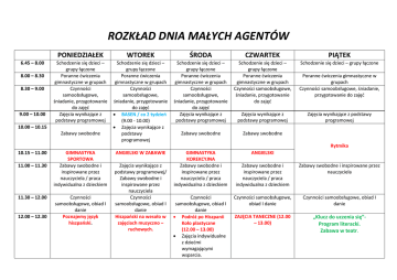 ROZKŁAD DNIA MAŁYCH AGENTÓW 6.45 – 8.00 8.00 – 8.30 8.30 – 9.00 9.00 – 10.00 10.00 – 10.15 10.15 – 11.00 11.00 – 11.30 11.30 – 12.00 12.00 – 12.30 PONIEDZIAŁEK Schodzenie się dzieci – grupy łączone Poranne ćwiczenia gimnastyczne w grupach Czynności samoobsługowe, śniadanie, przygotowanie do zajęć Zajęcia wynikające z podstawy programowej Zabawy swobodne GIMNASTYKA SPORTOWA Zabawy swobodne i inspirowane przez nauczyciela / praca indywidualna z dzieckiem Czynności samoobsługowe, obiad I danie Poznajemy język hiszpański. WTOREK ŚRODA CZWARTEK Schodzenie się dzieci – grupy łączone Poranne ćwiczenia gimnastyczne w grupach Czynności samoobsługowe, śniadanie, przygotowanie do zajęć • BASEN / co 2 tydzień (9.00 - 10.00) • Zajęcia wynikające z podstawy programowej Schodzenie się dzieci – grupy łączone Poranne ćwiczenia gimnastyczne w grupach Czynności samoobsługowe, śniadanie, przygotowanie do zajęć Zajęcia wynikające z podstawy programowej Schodzenie się dzieci – grupy łączone Poranne ćwiczenia gimnastyczne w grupach Czynności samoobsługowe, śniadanie, przygotowanie do zajęć Zabawy swobodne Zabawy swobodne ANGIELSKI W ZABAWIE GIMNASTYKA KOREKCYJNA Zabawy swobodne i inspirowane przez nauczyciela / praca indywidualna z dzieckiem Zajęcia wynikające z podstawy programowej/ Zabawy swobodne i inspirowane przez nauczyciela Czynności samoobsługowe, obiad I danie Hiszpański na wesoło w zajęciach muzyczno – ruchowych. Zajęcia wynikające z podstawy programowej PIĄTEK Schodzenie się dzieci – grupy łączone Poranne ćwiczenia gimnastyczne w grupach Czynności samoobsługowe, śniadanie, przygotowanie do zajęć Zajęcia wynikające z podstawy programowej Rytmika Czynności samoobsługowe, obiad I danie • Podróż po Hiszpanii Koło plastyczne (12.00 – 13.00) • Zajęcia indywidualne z dziećmi wymagającymi wsparcia. ANGIELSKI Zabawy swobodne i inspirowane przez nauczyciela / praca indywidualna z dzieckiem Zabawy swobodne i inspirowane przez nauczyciela Czynności samoobsługowe, obiad I danie Czynności samoobsługowe, obiad I danie ZAJĘCIA TANECZNE (12.00 – 13.00) „Klucz do uczenia się”Program literacki. Zabawa w teatr. 12.30– 13.30 13.30 – 14.00 14.00 – 14.30 Pobyt dzieci na świeżym powietrzu, organizowanie gier i zabaw ruchowych, obserwacji przyrodniczych, prac gospodarczych, porządkowych, zabawy swobodne, spacery Czynności samoobsługowe, obiad II danie • Poznajemy grę na flażoletach – 1 grupa Pobyt dzieci na świeżym powietrzu, organizowanie gier i zabaw ruchowych, obserwacji przyrodniczych, prac gospodarczych, porządkowych, zabawy swobodne, spacery Czynności samoobsługowe, obiad II danie • Poznajemy grę na flażoletach 2 grupa Zabawy na dużej Sali Zabawy na dużej Sali • • Pobyt dzieci na świeżym powietrzu, organizowanie gier i zabaw ruchowych, obserwacji przyrodniczych, prac gospodarczych, porządkowych, zabawy swobodne, spacery Czynności samoobsługowe, obiad II danie • „Klucz do uczenia się” konstrukcje – 1 grupa / • Zabawy na dużej Sali Pobyt dzieci na świeżym powietrzu, organizowanie gier i zabaw ruchowych, obserwacji przyrodniczych, prac gospodarczych, porządkowych, zabawy swobodne, spacery Pobyt dzieci na świeżym powietrzu, organizowanie gier i zabaw ruchowych, obserwacji przyrodniczych, prac gospodarczych, porządkowych, zabawy swobodne, spacery Czynności samoobsługowe, obiad II danie Czynności samoobsługowe, obiad II danie • • „Klucz do uczenia się” konstrukcje – 2 grupa Zabawy na dużej Sali Poznajemy tajemnice ludzkiego ciała. „Było sobie życie” 14.30 – 15.00 Łączenie grup – Zabawa na dużej sali Łączenie grup – Gry i zabawy ruchowe Łączenie grup – Zabawa na dużej Sali Taneczne układy ruchowe Łączenie grup – „Było sobie życie” 15.00 – 15.15 15.15 – 15.45 Podwieczorek Podwieczorek Podwieczorek Podwieczorek Podwieczorek Taneczne układy ruchowe Zabawy swobodne w kącikach tematycznch Taneczne układy ruchowe Zabawy swobodne w kącikach tematycznch Zabawy swobodne w kącikach tematycznch 15.45 – 16.30 Zabawy swobodne w kącikach tematycznch Zabawy swobodne w kącikach tematycznch