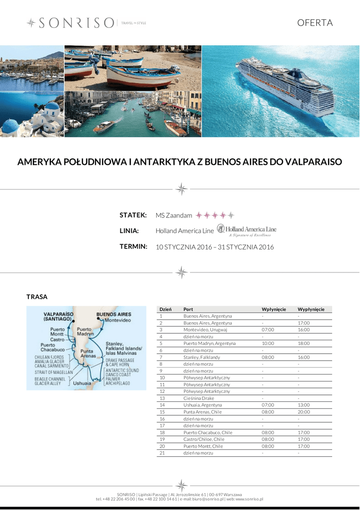 OFERTA AMERYKA POŁUDNIOWA I ANTARKTYKA Z BUENOS AIRES DO VALPARAISO STATEK: MS Zaandam LINIA: Holland America Line TERMIN: 10 STYCZNIA 2016 – 31 STYCZNIA 2016 TRASA Dzień 1 2 3 4 5 6 7 8 9 10 11 12 13 14 15 16 17 18 19 20 21 Port Buenos Aires, Argentyna Buenos Aires, Argentyna Montevideo, Urugwaj dzień na morzu Puerto Madryn, Argentyna dzień na morzu Stanley, Falklandy dzień na morzu dzień na morzu Półwysep Antarktyczny Półwysep Antarktyczny Półwysep Antarktyczny Cieśnina Drake Ushuaia, Argentyna Punta Arenas, Chile dzień na morzu dzień na morzu Puerto Chacabuco, Chile Castro/Chiloe, Chile Puerto Montt, Chile dzień na morzu Wpłynięcie 07:00 10:00 08:00 07:00 08:00 08:00 08:00 08:00 - SONRISO | Lipiński Passage | Al. Jero zo limskie 61 | 00-697 Warszawa tel. +48 22 206 45 00 | fax. +48 22 100 14 61 | e-mail: biuro @so nriso .pl | web: www.so nriso .pl Wypłynięcie 17:00 16:00 18:00 16:00 13:00 20:00 17:00 17:00 17:00 - OFERTA Dzień Port Wpłynięcie Wypłynięcie 22 Valparaiso (Santiago), Chile 07:00 - CENA Typ kabiny Kabina wewnętrzna Cena z osobę od 3 078 EUR Vista Suite z balkonem od 6 798 EUR Deluxe Veranda Suite od 11 789 EUR CENA ZAWIERA DOTATKOWE OPŁATY zakwaterowanie w 2 - os. kabinie wybranej kategorii pełne wyżywienie: 3 posiłki, przekąski między posiłakmi, bufet o północy napoje do posiłków: woda stołowa, kawa, herbata oraz sok do śniadania serwis bagażowy podczas wejścia i zejścia ze statku 24 godzinny serwis kabinowy korzystanie z urządzeń sportowo - rekreacyjnych dostępnych na pokładzie (baseny, jacuzzi, boiska sportowe, kluby dla dzieci i młodzieży itp.) udział we wszystkich imprezach organizowanych na pokładzie (przedstawienia, pokazy, aukcje, animacje i inne) obowiązkowe opłaty portowe dojazd/przelot do portu rozpoczęcia i zakończenia rejsu transfery (lotnisko - port - lotnisko) ewentulne noclegi przed lub po rejsie wycieczki fakultatywne napoje: bezalkoholowe, alkoholowe, woda mineralna dostępne w restauracjach i barach (istnieje możliwość wykupienia pakietów napojów, o szczegóły zapytaj w biurze) korzystanie z mini baru w kabinie korzystanie z usług typu: SPA, salon piękności, pralnia itp. wydatki osobiste tj. zakupy w butikach, internet, kasyno itp. obowiązkowa opłata serwisowa (napiwki dla obsługi statku ok. 12,50 USD/os. dorosła/dzień, dzieci poniżej 3 lat nie płacą) obowiązkowe ubezpieczenie turystyczne koszt wymaganych wiz Na życzenie świadczymy dodatkowo usługi: rezerwacje hotelowe na całym świecie rezerwacje biletów lotniczych, trasferów oraz parkingu w porcie rezerwacje wycieczek fakultatywnych i innych atrakcji SONRISO | Lipiński Passage | Al. Jero zo limskie 61 | 00-697 Warszawa tel. +48 22 206 45 00 | fax. +48 22 100 14 61 | e-mail: biuro @so nriso .pl | web: www.so nriso .pl