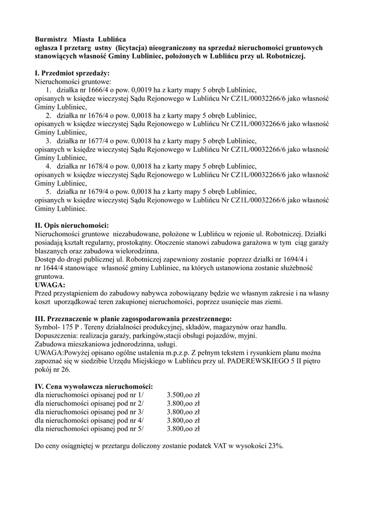 Burmistrz Miasta Lublińca ogłasza I przetarg ustny (licytacja) nieograniczony na sprzedaż nieruchomości gruntowych stanowiących własność Gminy Lubliniec, położonych w Lublińcu przy ul. Robotniczej. I. Przedmiot sprzedaży: Nieruchomości gruntowe: 1. działka nr 1666/4 o pow. 0,0019 ha z karty mapy 5 obręb Lubliniec, opisanych w księdze wieczystej Sądu Rejonowego w Lublińcu Nr CZ1L/00032266/6 jako własność Gminy Lubliniec, 2. działka nr 1676/4 o pow. 0,0018 ha z karty mapy 5 obręb Lubliniec, opisanych w księdze wieczystej Sądu Rejonowego w Lublińcu Nr CZ1L/00032266/6 jako własność Gminy Lubliniec, 3. działka nr 1677/4 o pow. 0,0018 ha z karty mapy 5 obręb Lubliniec, opisanych w księdze wieczystej Sądu Rejonowego w Lublińcu Nr CZ1L/00032266/6 jako własność Gminy Lubliniec, 4. działka nr 1678/4 o pow. 0,0018 ha z karty mapy 5 obręb Lubliniec, opisanych w księdze wieczystej Sądu Rejonowego w Lublińcu Nr CZ1L/00032266/6 jako własność Gminy Lubliniec, 5. działka nr 1679/4 o pow. 0,0018 ha z karty mapy 5 obręb Lubliniec, opisanych w księdze wieczystej Sądu Rejonowego w Lublińcu Nr CZ1L/00032266/6 jako własność Gminy Lubliniec. II. Opis nieruchomości: Nieruchomości gruntowe niezabudowane, położone w Lublińcu w rejonie ul. Robotniczej. Działki posiadają kształt regularny, prostokątny. Otoczenie stanowi zabudowa garażowa w tym ciąg garaży blaszanych oraz zabudowa wielorodzinna. Dostęp do drogi publicznej ul. Robotniczej zapewniony zostanie poprzez działki nr 1694/4 i nr 1644/4 stanowiące własność gminy Lubliniec, na których ustanowiona zostanie służebność gruntowa. UWAGA: Przed przystąpieniem do zabudowy nabywca zobowiązany będzie we własnym zakresie i na własny koszt uporządkować teren zakupionej nieruchomości, poprzez usunięcie mas ziemi. III. Przeznaczenie w planie zagospodarowania przestrzennego: Symbol- 175 P . Tereny działalności produkcyjnej, składów, magazynów oraz handlu. Dopuszczenia: realizacja garaży, parkingów,stacji obsługi pojazdów, myjni. Zabudowa mieszkaniowa jednorodzinna, usługi. UWAGA:Powyżej opisano ogólne ustalenia m.p.z.p. Z pełnym tekstem i rysunkiem planu można zapoznać się w siedzibie Urzędu Miejskiego w Lublińcu przy ul. PADEREWSKIEGO 5 II piętro pokój nr 26. IV. Cena wywoławcza nieruchomości: dla nieruchomości opisanej pod nr 1/ dla nieruchomości opisanej pod nr 2/ dla nieruchomości opisanej pod nr 3/ dla nieruchomości opisanej pod nr 4/ dla nieruchomości opisanej pod nr 5/ 3.500,oo zł 3.800,oo zł 3.800,oo zł 3.800,oo zł 3.800,oo zł Do ceny osiągniętej w przetargu doliczony zostanie podatek VAT w wysokości 23%. V. Termin i miejsce przetargu: I przetarg ustny nieograniczony odbędzie się w siedzibie Urzędu Miejskiego w Lublińcu, ul. Paderewskiego 5, Sala posiedzeń nr 11 - I piętro w dniu 23 grudnia 2013r o godzinie 9:00 dla nieruchomości opisanej pod nr 1/ o godzinie 9:20 dla nieruchomości opisanej pod nr 2/ o godzinie 9:40 dla nieruchomości opisanej pod nr 3/ o godzinie 10:00 dla nieruchomości opisanej pod nr 4/ o godzinie 10:20 dla nieruchomości opisanej pod nr 5/ PRZETARG przeprowadzony zostanie zgodnie z Rozporządzeniem Rady Ministrów z dnia 14 września 2004r. w sprawie sposobu i trybu przeprowadzania przetargów oraz rokowań na zbycie nieruchomości. (Dz. U. z 2004r. Nr 207, poz. 2108 ze zm). Zgodnie z w/w rozporządzeniem przetarg jest ważny bez względu na liczbę uczestników, jeżeli chociaż jeden uczestnik zaoferuje co najmniej jedno postąpienie powyżej ceny wywoławczej. Postąpienie nie może wynosić mniej niż 1% ceny wywoławczej z zaokrągleniem do pełnych dziesiątek złotych. VI. Wymagania dotyczące wadium: z Przystępujący do przetargu zobowiązani są do wpłacenia wadium w wysokości 600,oo zł dla działek opisanych pod nr 1/, 2/, 3/, 4/, 5/, na konto Urzędu Miejskiego w ING Bank Śląski S.A. w Katowicach O/Częstochowa nr 11105011421000000500966791 do dnia 18 grudnia 2013r. Dowodem wniesienia wadium w tej formie jest potwierdzenie z banku. Dowód wpłaty wadium należy przedłożyć Komisji Przetargowej przed otwarciem przetargu. Za dzień wniesienia wadium uważa się dzień wpływu kwoty na rachunek bankowy Gminy. Na dokumencie przelewu należy wpisać numer działki, na którą zostało wpłacone wadium. W przypadku zainteresowania nabyciem dwóch lub więcej nieruchomości, wadium winno być wpłacone na każdą nieruchomość z osobna. WADIUM: z wpłacone przez oferenta, który przetarg wygra zostanie zaliczone na poczet ceny sprzedaży, z wpłacone przez oferenta, który przetargu nie wygra, zostanie zwrócone po rozstrzygnięciu przetargu, z przepada na rzecz Urzędu Miejskiego w Lublińcu, jeżeli osoba ustalona jako nabywca nieruchomości nie przystąpi bez usprawiedliwienia do zawarcia umowy w miejscu i terminie podanym w zawiadomieniu. VII. Informacje ogólne: z W przetargu mogą brać udział osoby fizyczne lub prawne, które wniosą wadium w wyznaczonym terminie oraz przedłożą Komisji Przetargowej w dniu przetargu następujące dokumenty: 1/osoby fizyczne - dokument potwierdzający tożsamość (dowód osobisty), 2/osoby prawne – pełny, aktualny odpis z właściwego dla danego podmiotu rejestru, 3/pełnomocnicy- dokument potwierdzający tożsamość i notarialnie poświadczone pełnomocnictwo o ile uprawnienia do działania w imieniu osób prawnych nie wynikają z innych dokumentów, 4/w przypadku osób fizycznych prowadzących działalność w formie Spółki Cywilnej- umowę spółki oraz stosowne dokumenty do działania w imieniu spółki, 5/w przypadku osób prowadzących działalność gospodarczą - aktualne zaświadczenie o wpisie do ewidencji działalności gospodarczej. 6/Małżonek zamierzający samodzielnie licytować nieruchomość nabywaną do majątku wspólnego, powinien okazać komisji przetargowej, pisemną zgodę współmałżonka, z Koszty sporządzenia umowy notarialnej o