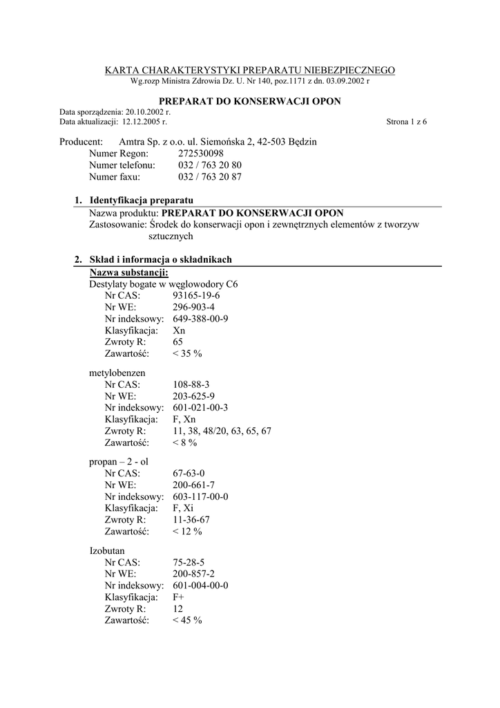 KARTA CHARAKTERYSTYKI PREPARATU NIEBEZPIECZNEGO Wg.rozp Ministra Zdrowia Dz. U. Nr 140, poz.1171 z dn. 03.09.2002 r PREPARAT DO KONSERWACJI OPON Data sporządzenia: 20.10.2002 r. Data aktualizacji: 12.12.2005 r. Strona 1 z 6 Producent: Amtra Sp. z o.o. ul. Siemońska 2, 42-503 Będzin Numer Regon: 272530098 Numer telefonu: 032 / 763 20 80 Numer faxu: 032 / 763 20 87 1. Identyfikacja preparatu Nazwa produktu: PREPARAT DO KONSERWACJI OPON Zastosowanie: Środek do konserwacji opon i zewnętrznych elementów z tworzyw sztucznych 2. Skład i informacja o składnikach Nazwa substancji: Destylaty bogate w węglowodory C6 Nr CAS: 93165-19-6 Nr WE: 296-903-4 Nr indeksowy: 649-388-00-9 Klasyfikacja: Xn Zwroty R: 65 Zawartość: < 35 % metylobenzen Nr CAS: Nr WE: Nr indeksowy: Klasyfikacja: Zwroty R: Zawartość: 108-88-3 203-625-9 601-021-00-3 F, Xn 11, 38, 48/20, 63, 65, 67 <8% propan – 2 - ol Nr CAS: Nr WE: Nr indeksowy: Klasyfikacja: Zwroty R: Zawartość: 67-63-0 200-661-7 603-117-00-0 F, Xi 11-36-67 < 12 % Izobutan Nr CAS: Nr WE: Nr indeksowy: Klasyfikacja: Zwroty R: Zawartość: 75-28-5 200-857-2 601-004-00-0 F+ 12 < 45 % Strona 2 z 6 3. Identyfikacja zagroŜeń ZagroŜenie poŜarowe: Skrajnie łatwopalny. Pary tworzą mieszaniny wybuchowe z powietrzem Pary są cięŜsze od powietrza, gromadzą się przy powierzchni ziemi i w dolnych partiach pomieszczeń. Zapłon od otwartego płomienia, iskry, gorącej powierzchni. Produkt lŜejszy od wody, gromadzi się na jej powierzchni. Nie rozpuszcza się w wodzie. 4. Pierwsza pomoc Preparat stosowany zgodnie z przeznaczeniem nie stwarza zagroŜenia Zatrucie inhalacyjne: Poszkodowanego przytomnego wyprowadzić na świeŜe powietrze, nieprzytomnego ułoŜyć w stabilnej pozycji bocznej, przy braku oddechu stosować sztuczne oddychanie. Zatrucie doustne: Natychmiast wypłukać jamę ustną, podać do wypicia 150 ml płynnej parafiny. Nie powodować wymiotów. Nie podawać mleka, tłuszczów, alkoholu. SkaŜenie skóry: Zdjąć zanieczyszczoną odzieŜ, skaŜoną skórę zmyć mydłem z wodą SkaŜenie oczu: Natychmiast płukać skaŜone oczy przy podwiniętej górnej powiece przez około 15 minut. W razie potrzeby zapewnić poszkodowanemu pomoc lekarską 5. Postępowanie w przypadku poŜaru Produkt jest lŜejszy od wody i nie rozpuszcza się w niej. Pary są cięŜsze od powietrza, tworzą z nim mieszaniny wybuchowe. Zalecenia ogólne: Zawiadomić o poŜarze, wezwać ekipy ratownicze, StraŜ PoŜarną i Policję Państwową: udział w akcji ratowniczej wyłącznie osób przeszkolonych wyposaŜonych w odzieŜ i sprzęt ochronny. Środki gaśnicze: Dwutlenek węgla, proszki gaśnicze rozproszone prądy wodne, piany Gaszenie poŜaru: Małe poŜary gasić gaśnicą proszkową lub śniegową; DuŜe poŜary gasić pianą lub rozproszonymi prądami wody. Nie stosować zwartych strumieni wody na powierzchnię palącej się cieczy 6. Postępowanie w przypadku niezamierzonego uwolnienia do środowiska Ochrona ludzi: Usunąć wszystkie źródła zapłonu. Ewakuować pracowników i uruchomić wentylację. Ubrać odzieŜ ochronną. Ochrona Środowiska: Zamknąć wypływ o ile nie stanowi to dodatkowego ryzyka Zasypać rozlany produkt obojętnym materiałem chłonnym. Zapobiegać przeniknięciu do kanalizacji i wód powierzchniowych. 7. Postępowanie z preparatem i jego magazynowanie Podczas stosowania i przechowywania produktu przestrzegać obowiązujące przepisy bezpieczeństwa i higieny pracy. Postępowanie z preparatem: nie jeść, nie pić, unikać kontaktu z cieczą, przestrzegać zasad higieny osobistej, stosować odzieŜ i sprzęt ochronny, unikać wdychania par z aerozolu. Strona 3 z 6 Zapobieganie poŜarom i wybuchom: wyeliminować źródła zapłonu - nie uŜywać otwartego ognia, nie palić, nie uŜywać narzędzi iskrzących i odzieŜy z tkanin podatnych na elektryzację, zachować środki ostroŜności w celu uniknięcia wyładowań elektrostatycznych. Pojemniki pod ciśnieniem, chronić przed słońcem i temperaturą powyŜej 50°C. Nie przekłuwać ani nie spalać takŜe po zuŜyciu. Nie rozpylać nad otwartym płomieniem lub Ŝarzącymi się materiałami. Chronić przed źródłami zapłonu - nie palić w czasie rozpylania. Magazynowanie: przechowywać w oryginalnych fabrycznie zamkniętych pojemnikach Nie trzymać w pobliŜu źródeł ognia i ciepła. Na terenie magazynu przestrzegać zasad zakazu palenia, uŜywania otwartego ognia i narzędzi iskrzących. Pomieszczenie magazynowe powinno być suche i wyposaŜone w wentylację grawitacyjną Temperatura magazynowania -10 do +25°C 8. Kontrola naraŜenia i środki ochrony indywidualnej Parametry kontroli naraŜenia Wartości dopuszczalnych stęŜeń Heksanu izomery acykliczne nasycone NDS – 400 mg/m3, NDSCh – 3200 mg/m3, NDSP – nie określone Toluen NDS – 100 mg/m3, NDSCh – 350 mg/m3, NDSP – nie określone Propan – 2 - ol NDS – 900 mg/m3, NDSCh – 1200 mg/m3, NDSP – nie określone Izobutan NDS, NDSCh, NDSP – nie określone Metody oznaczenia PN – 84 / Z 04 / 36.02 Ochrona czystości powietrza Oznaczenie na stanowiskach pracy metodą chromatografii gazowej Środki ochrony osobistej Ochrona osobista: Układ oddechowy– wentylacja, maska przeciwgazowa Rąk – rękawice ochronne Oczu i twarzy – okulary ochronne Skóry i ciała – niekonieczne Zalecenia higieniczne: Przestrzegać podstawowych zasad wymaganych przy obchodzeniu się z substancjami chemicznymi. Unikać bezpośredniego kontaktu z preparatem oraz wdychania par. Przestrzegać zasad higieny: nie jeść i nie pić na stanowisku pracy, kaŜdorazowo po zakończeniu pracy myć ręce wodą z mydłem. Stosować krem ochronny do rąk. Strona 4 z 6 9. Właściwości fizykochemiczne Stan fizyczny: ciecz pod ciśnieniem gazu płynnego Barwa: bezbarwna Zapach: charakterystyczny Wartość pH nie dotyczy Temperatura topnienia: -95°C Temperatura wrzenia: 66°C Temperatura zapłonu: -23°C Temperatura samozapłonu: 310°C Granice 