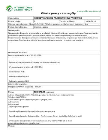 Oferta pracy - szczegóły www.gielda.wup.kielce.pl Stanowisko: KOORDYNATOR DS PRACOWNIKÓW PRODUKCJI Liczba miejsc: 1 Termin aplikacji: 10.10.2016 Miejsce zatrudnienia: Okrzei 2/5, 25-017 Kielce, powiat: m. Kielce, woj: świętokrzyskie Forma zatrudnienia: Umowa o pracę Wymagania: Wymagania: Kontrola pracowników produkcji /obecność,zaliczki, wynagrodzenia/.Rozwiązywanie problemów pracowników- poszukiwanie miejsc do zakwaterowania pracowników oraz kwaterowanie delegowanych pracowników,kontakt z klientem, organizacja zamówień,stała praca wyjazdowa.Pracodawca oferuje bezpłatne zakwaterowanie i transport na miejscu. Oferowane warunki: Data rozpoczęcia pracy: 10.06.2016 System wynagradzania: Czasowy ze stawką miesięczną Wynagrodzenie brutto: od 4 000 PLN Wyżywienie: NIE Zakwaterowanie: NIE Zakwaterowanie: NIE Zakres obowiązków: MIEJSCE PRACY; CZECHY - KOLIN Firma: SK EXPRES sp zo.o. Adres: Okrzei 2/5, 25-017 Kielce, powiat: m. Kielce, woj: świętokrzyskie Telefon: 665777031 Adres email: [email protected] Adres www: Adres www: Język aplikacji: polski Sposób aplikowania: bezpośrednio do pracodawcy Sposób przekazania dokumentów: Preferowane formy kontaktu: telefon, e-mail Wymagane dokumenty: wskazany kontakt tel; 665777031 lub e-mail [email protected] Uwagi: Identyfikator oferty: StPr/16/2525 Instytucja koordynująca ofertę: Miejski Urząd Pracy w Kielcach Urząd Pracy dokłada wszelkich starań, aby oferty pracy będące w zasobach urzędu, były rzetelne i wiarygodne. Ponieważ wszystkie oferty pracy pochodzą od osób trzecich Urząd Pracy zastrzega, że odpowiedzialność za ewentualne rozbieżności pomiędzy warunkami pracy zaprezentowanymi w niniejszej ofercie a warunkami zaproponowanymi przez potencjalnego pracodawcę ponosi pracodawca.