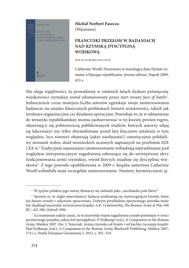STUDIA EUROPAEA GNESNENSIA 10/2014 · RECENZJE Michał Norbert Faszcza (Warszawa) FRANCUSKI PRZEŁOM W BADANIACH NAD RZYMSKĄ DYSCYPLINĄ WOJSKOWĄ DOI 10.14746/SEG.2014.10.18 Catherine Woolf, Déserteurs et transfuges dans l’armée romaine à l’époque républicaine, Jovene editore, Napoli 2009, 453 s. Nie ulega wątpliwości, że prowadzony w ostatnich latach dyskurs poświęcony wojskowości rzymskiej został zdominowany przez nurt zwany face of battle1. Jednocześnie coraz mniejsza liczba autorów ogniskuje swoje zainteresowania badawcze na niejako klasycznych problemach historii wojskowości, takich jak struktura organizacyjna czy działania operacyjne. Powoduje to, że w odniesieniu do tematyki republikańskiej można zaobserwować w tej kwestii pewien regres, objawiający się pobieżnością publikowanych studiów, których autorzy zdają się lekceważyć nie tylko sformułowane przed laty kluczowe ustalenia w tym względzie, lecz również objawiają (jakże niesłusznie!) ostentacyjnie pobłażliwy stosunek wobec dzieł niemieckich uczonych napisanych na przełomie XIX i XX w.2 Tradycyjnie najmniejsze zainteresowanie wzbudzają najtrudniejsze pod względem interpretacyjnym zagadnienia odnoszące się do wewnętrznej sfery funkcjonowania armii rzymskiej, wśród których znajduje się dyscyplina wojskowa3. Z tego powodu opublikowana w 2009 r. książka autorstwa Catherine Woolf wzbudziła moje szczególne zainteresowanie. Niestety, hermetyczność ję- 1 W języku polskim jego nazwę tłumaczy się niekiedy jako „mechanika pola bitwy”. 2 Sprawia to, że anglo-amerykańscy badacze podejmują się rozstrzygnięcia kwestii, które już dawno zostały z sukcesem opracowane. Dobrym przykładem opisywanego zjawiska może być skądinąd niezwykle wartościowa książka: A.K. Goldsworthy, The Roman Army at War 100 BC–AD 200, Oxford 1996. 3 Za znamienne należy uznać, że to niezwykle ważne zagadnienie zostało pominięte w treści prestiżowego projektu, jakim był niewątpliwie: P. Erdkamp (red.), A Companion to the Roman Army, Malden 2007. Por. J. Tomczak, Armia rzymska od frontu i od kuchni (recenzja książki: Paul Erdkamp (red.), A Companion to the Roman Army, Blackwell Publishing, Malden 2007, 574 s.), Studia Europaea Gnesnensia 5, 2012, s. 301–310. 374 MICHAŁ NORBERT FASZCZA, FRANCUSKI PRZEŁOM W BADANIACH zyka francuskiego spowodowała, że w świecie zdominowanym przez publikacje anglojęzyczne pozostała niemal niezauważona. Na pierwszy rzut oka wielu czytelnikom recenzowana książka może wydać się… nudna. Brakuje w niej bowiem modnych ostatnimi czasy rozważań antropologicznych, nie pojawiają się przypisy prowadzące do książek Johna Keegana4, a jeśli autorka czyni nawiązania do dorobku francuskiej myśli socjologicznej, to robi to w nienachalny sposób, typowy np. dla Paula Veyna5. Jest to zatem opracowanie napisane w sposób tradycyjny, z licznymi odwołaniami do źródeł i prac opublikowanych w językach innych niż angielski. Z mojego punktu widzenia stanowi to jej niezaprzeczalny atut, albowiem od publikacji naukowej nie oczekuję szczególnych wrażeń literackich, lecz rzetelnego opracowania podjętego tematu. W kontekście konstrukcji wychodzących w ostatnich latach książek poświęconych tematyce republikańskiej stanowi to podejście kultywowane głównie w krajach znajdujących się niejako poza głównym nurtem dyskursu (bez względu na zasługi położone przed laty przez ich przedstawicieli), takich jak Francja czy Włochy. Wobec pogłębiającej się jałowości anglo-amerykańskiej myśli historycznej być może warto byłoby więc ponownie zwrócić większą uwagę na to, co dzieje się po wschodniej stronie kanału La Manche? Recenzowana książka została poświęcona zjawiskom dezercji oraz przechodzenia na stronę wroga w latach 509–30 przed Chr. Autorka w pełni zdaje sobie sprawę, że podjęte przez nią zagadnienia nie zostały nigdy zbadane w sposób kompleksowy, przez co snucie mniej lub bardziej erudycyjnych rozważań nie ma większego sensu wobec braku ustaleń w tak podstawowych kwestiach, jak kwalifikacja prawna opisanych przestępstw, skala zjawisk czy charakter motywacji przyświecających żołnierzom (s. xi-xii). Pod tym względem opracowanie stanowi całkowite przeciwieństwo książki Sary E. Phang6, pokazując w sposób klarowny, ile zostało jeszcze do zrobienia, a jednocześnie przy użyciu jakich metod powinno się badać rzymską disciplina militaris. Świadomość szczątkowości prowadzonego do tej pory dyskursu jest zatem czynnikiem, który wpłynął bardzo pozytywnie na treść pracy, jaka wyszła spod ręki Woolf. Jest to bowiem książka o przełomowym znaczeniu, już choćby z uwagi na to, że wypełnia dojmującą lukę w nowożytnej historiografii. Jak wspomniałem po- J. Keegan, The Face of Battle, London 1976; idem, The Mask of Command, London 1987. 5 P. Veyne, Le Pain et le Cirque. Sociologie historique d’un pluralisme politique, Paris 1976. 6 S.E. Phang, Roman Military Service. Ideologies of Discipline in the Late Republic and Early Principate, Cambridge 2008. 4 375 STUDIA EUROPAEA GNESNENSIA 10/2014 · RECENZJE wyżej, zagadnienia dyscyplinarne nigdy nie cieszyły się szczególną popularnością, albowiem większość autorów milcząco zakładała, że rzymska disciplina militaris nosiła cechy daleko idącej surowości, co miałoby determinować wszystkie składające się na nią elementy. Taki sposób myślenia wynikał m.in. z wielowiekowej fascynacji dziełami Flaviusa Vegetiusa Renatusa7 oraz Polybiosa z Megalopolis. O ile jednak w przypadku pierwszego z wymienionych nie ulega już wątpliwości, że wartość wywodów jego autorstwa jest na ogół niska, o tyle w dalszym ciągu brakuje podobnej refleksji w odniesieniu do niektórych passusów pochodzących z dzieła Polybiosa8, z ewidentną szkodą dla pojmowania ówczesnej dyscypliny wojskowej. Książka Woolf stanowi 