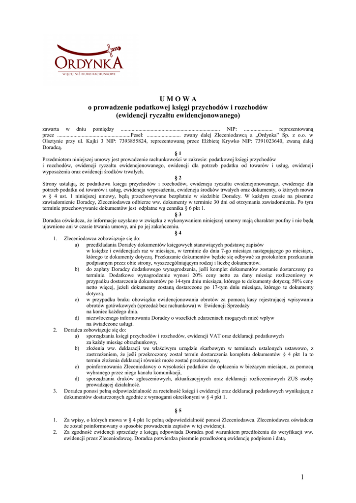 UMOWA o prowadzenie podatkowej księgi przychodów i rozchodów (ewidencji ryczałtu ewidencjonowanego) zawarta w dniu pomiędzy ......................................................................... NIP: ..................... reprezentowaną przez ......................................................Pesel: ......................... zwany dalej Zleceniodawcą a „Ordynka” Sp. z o.o. w Olsztynie przy ul. Kajki 3 NIP: 7393855824, reprezentowaną przez Elżbietę Krywko NIP: 7391023640, zwaną dalej Doradcą. §1 Przedmiotem niniejszej umowy jest prowadzenie rachunkowości w zakresie: podatkowej księgi przychodów i rozchodów, ewidencji ryczałtu ewidencjonowanego, ewidencji dla potrzeb podatku od towarów i usług, ewidencji wyposażenia oraz ewidencji środków trwałych. §2 Strony ustalają, że podatkowa księga przychodów i rozchodów, ewidencja ryczałtu ewidencjonowanego, ewidencje dla potrzeb podatku od towarów i usług, ewidencja wyposażenia, ewidencja środków trwałych oraz dokumenty, o których mowa w § 4 ust. 1 niniejszej umowy, będą przechowywane bezpłatnie w siedzibie Doradcy. W każdym czasie na pisemne zawiadomienie Doradcy, Zleceniodawca odbierze ww. dokumenty w terminie 30 dni od otrzymania zawiadomienia. Po tym terminie przechowywanie dokumentów jest odpłatne wg cennika § 6 pkt 1. §3 Doradca oświadcza, że informacje uzyskane w związku z wykonywaniem niniejszej umowy mają charakter poufny i nie będą ujawnione ani w czasie trwania umowy, ani po jej zakończeniu. §4 1. Zleceniodawca zobowiązuje się do: a) przedkładania Doradcy dokumentów księgowych stanowiących podstawę zapisów w księdze i ewidencjach raz w miesiącu, w terminie do dnia 7-go miesiąca następującego po miesiącu, którego te dokumenty dotyczą. Przekazanie dokumentów będzie się odbywać za protokołem przekazania podpisanym przez obie strony, wyszczególniającym rodzaj i liczbę dokumentów. b) do zapłaty Doradcy dodatkowego wynagrodzenia, jeśli komplet dokumentów zostanie dostarczony po terminie. Dodatkowe wynagrodzenie wynosi 20% ceny netto za dany miesiąc rozliczeniowy w przypadku dostarczenia dokumentów po 14-tym dniu miesiąca, którego te dokumenty dotyczą; 50% ceny netto więcej, jeżeli dokumenty zostaną dostarczone po 17-tym dniu miesiąca, którego te dokumenty dotyczą. c) w przypadku braku obowiązku ewidencjonowania obrotów za pomocą kasy rejestrującej wpisywania obrotów gotówkowych (sprzedaż bez rachunkowa) w Ewidencji Sprzedaży na koniec każdego dnia. d) niezwłocznego informowania Doradcy o wszelkich zdarzeniach mogących mieć wpływ na świadczone usługi. 2. Doradca zobowiązuje się do: a) sporządzania księgi przychodów i rozchodów, ewidencji VAT oraz deklaracji podatkowych za każdy miesiąc obrachunkowy, b) złożenia ww. deklaracji we właściwym urzędzie skarbowym w terminach ustalonych ustawowo, z zastrzeżeniem, że jeśli przekroczony został termin dostarczenia kompletu dokumentów § 4 pkt 1a to termin złożenia deklaracji również może zostać przekroczony, c) poinformowania Zleceniodawcy o wysokości podatków do opłacenia w bieżącym miesiącu, za pomocą wybranego przez niego kanału komunikacji, d) sporządzania druków zgłoszeniowych, aktualizacyjnych oraz deklaracji rozliczeniowych ZUS osoby prowadzącej działalność. 3. Doradca ponosi pełną odpowiedzialność za rzetelność księgi i ewidencji oraz deklaracji podatkowych wynikającą z dokumentów dostarczonych zgodnie z wymogami określonymi w § 4 pkt 1. §5 1. 2. Za wpisy, o których mowa w § 4 pkt 1c pełną odpowiedzialność ponosi Zleceniodawca. Zleceniodawca oświadcza że został poinformowany o sposobie prowadzenia zapisów w tej ewidencji. Za zgodność ewidencji sprzedaży z księgą odpowiada Doradca pod warunkiem przedłożenia do weryfikacji ww. ewidencji przez Zleceniodawcę. Doradca potwierdza pisemnie przedłożoną ewidencję podpisem i datą. 1 §6 1. 2. 3. 4. 5. 6. Wysokość wynagrodzenia za usługi objęte niniejszą umową ustala się w wysokości wynikającej z liczby dostarczanych dokumentów księgowych. Cennik usług znajduje się na stronie internetowej www.ordynka.pl Cena za usługę jest aktualizowana dwa razy w roku (za okresy I-VI i VII-XII). Podstawą aktualizacji jest średnia liczba wprowadzonych dokumentów w ciągu poprzedniego półrocza. Wynagrodzenie, w przypadkach uzasadnionych nakładem pracy poniesionym przez Doradcę przy realizacji umowy, może ulec zmianie za obopólną pisemną zgodą w każdym czasie. Zleceniodawca ma obowiązek uregulować należność za miesiąc poprzedni do dnia 7 każdego miesiąca (bez wezwania). Należność może być wniesiona gotówką w siedzibie Doradcy lub przelewem. Za zobowiązania nieuregulowane w terminie będą naliczane odsetki karne w wysokości ustawowej. Za pisemne zawiadomienie o braku zapłaty Doradca może naliczyć opłatę dodatkową w wysokości 20 zł netto. Zleceniodawca wyraża zgodę na doliczenie opłaty dodatkowej do należnego wynagrodzenia Doradcy za następny miesiąc rozliczeniowy. §7 Zleceniodawca umocowuje z prawem substytucji Doradcę do działania w swoim imieniu przed urzędami administracji państwowej i samorządowej, a w szczególności przed organami podatkowymi, do składania oświadczeń woli dotyczących zobowiązań podatkowych. §8 Umowa zostaje zawarta na czas nieokreślony. 1. Obowiązuje minimalny 3 miesięczny termin wypowiedzenia. Ostatni dzień trwania umowy musi przypadać na dzień zakończenia miesiąca obrachunkowego. 2. Strony obowiązuje pisemny tryb wypowiadania umowy pod rygorem nieważności. 3. Umowa może zostać wypowiedziana w trybie natychmiastowym w przypadku rażącego naruszenia postanowień w niej zawartych, a w szczególności § 3, 4 i 6. 4. Nie uregulowanie przez Zleceniodawcę zobowiązań wobec Doradcy w terminie 30 dni kalendarzowych od terminu wymagalności stanowi wystarczającą przesłankę do zaw