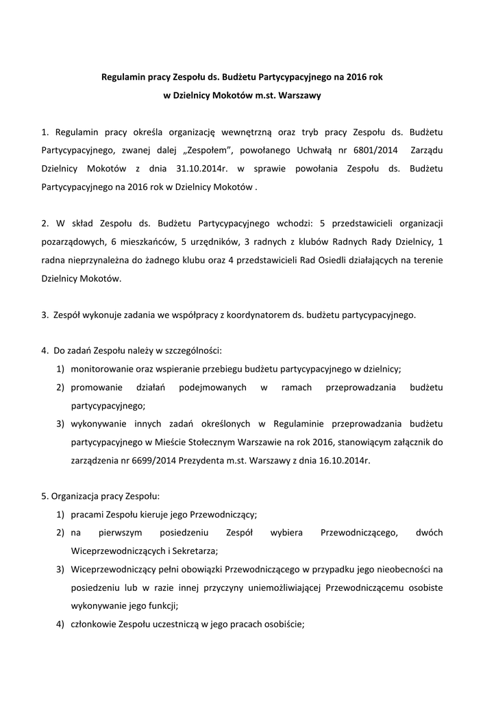 Regulamin pracy Zespołu ds. Budżetu Partycypacyjnego na 2016 rok w Dzielnicy Mokotów m.st. Warszawy 1. Regulamin pracy określa organizację wewnętrzną oraz tryb pracy Zespołu ds. Budżetu Partycypacyjnego, zwanej dalej „Zespołem”, powołanego Uchwałą nr 6801/2014 Zarządu Dzielnicy Mokotów z dnia 31.10.2014r. w sprawie powołania Zespołu ds. Budżetu Partycypacyjnego na 2016 rok w Dzielnicy Mokotów . 2. W skład Zespołu ds. Budżetu Partycypacyjnego wchodzi: 5 przedstawicieli organizacji pozarządowych, 6 mieszkańców, 5 urzędników, 3 radnych z klubów Radnych Rady Dzielnicy, 1 radna nieprzynależna do żadnego klubu oraz 4 przedstawicieli Rad Osiedli działających na terenie Dzielnicy Mokotów. 3. Zespół wykonuje zadania we współpracy z koordynatorem ds. budżetu partycypacyjnego. 4. Do zadań Zespołu należy w szczególności: 1) monitorowanie oraz wspieranie przebiegu budżetu partycypacyjnego w dzielnicy; 2) promowanie działań podejmowanych w ramach przeprowadzania budżetu partycypacyjnego; 3) wykonywanie innych zadań określonych w Regulaminie przeprowadzania budżetu partycypacyjnego w Mieście Stołecznym Warszawie na rok 2016, stanowiącym załącznik do zarządzenia nr 6699/2014 Prezydenta m.st. Warszawy z dnia 16.10.2014r. 5. Organizacja pracy Zespołu: 1) pracami Zespołu kieruje jego Przewodniczący; 2) na pierwszym posiedzeniu Zespół wybiera Przewodniczącego, dwóch Wiceprzewodniczących i Sekretarza; 3) Wiceprzewodniczący pełni obowiązki Przewodniczącego w przypadku jego nieobecności na posiedzeniu lub w razie innej przyczyny uniemożliwiającej Przewodniczącemu osobiste wykonywanie jego funkcji; 4) członkowie Zespołu uczestniczą w jego pracach osobiście; 5) nieusprawiedliwiona nieobecność członka Zespołu na 3 posiedzeniach skutkuje wykreśleniem go z zespołu, w takiej sytuacji skład zespołu uzupełnia się w trybie określonym w Regulaminie przeprowadzania budżetu partycypacyjnego w Mieście Stołecznym Warszawie na rok 2016, stanowiącym załącznik do zarządzenia nr 6699/2014 Prezydenta m.st. Warszawy z dnia 16.10.2014r. (§ 8 i § 11); 6) członkowie Zespołu mają możliwość składania projektów zlokalizowanych na terenie dzielnicy Mokotów, w takiej sytuacji są oni zobowiązani poinformować o tym fakcie Zespół i wyłączyć się z prac nad nimi; 7) gdy członek Zespołu pozostaje z projektodawcą w takim stosunku prawnym lub faktycznym, że może to budzić uzasadnione wątpliwości co do jego bezstronności jest on zobowiązany poinformować Zespół i wyłączyć się z prac nad tym projektem; 8) członkowie Zespołu ze strony społecznej nie pobierają wynagrodzenia za pracę, przedstawiciele urzędu i radni uczestniczą w posiedzeniach Zespołu w ramach wykonywanych obowiązków; 9) wszelkie informacje dla członków Zespołu będą przesyłane pocztą elektroniczną. 6. Posiedzenia Zespołu: 1) posiedzenia Zespołu odbywają się w miarę potrzeb, jednakże nie rzadziej niż raz na miesiąc; 2) posiedzenia Zespołu zwołuje Przewodniczący (termin kolejnego spotkania Zespołu ustalają jego Członkowie na swoim posiedzeniu); 3) w sytuacjach wyjątkowych istnieje możliwość wyznaczenia dodatkowego posiedzenia Zespołu z pominięciem terminów, o którym mowa w pkt 2 i 5. na wniosek Przewodniczącego lub co najmniej pięciu członków Zespołu; 4) w przypadku zgłoszenia wniosku, o którym mowa w pkt. 3, Przewodniczący lub w przypadku jego nieobecności Wiceprzewodniczący, w ciągu 3 dni od dnia złożenia wniosku wyznacza termin posiedzenia Zespołu; 5) o terminie oraz miejscu posiedzenia członków Zespołu zawiadamia się najpóźniej na 5 dni przed posiedzeniem Zespołu; 6) dopuszcza się powołanie spośród członków Zespołu, grup roboczych, które mogą obradować w dogodnych dla nich godzinach; 7) posiedzenia Zespołu są jawne. Mogą w nich uczestniczyć mieszkańcy bez prawa do udziału w głosowaniu. Informacja o posiedzeniach Zespołu będzie zamieszczana na stronie internetowej www.mokotow.waw.pl w zakładce poświęconej budżetowi partycypacyjnemu na 2016 rok. 7. Głosowanie: 1) Zespół podejmuje swoje decyzje zwykłą większością głosów, w głosowaniu jawnym. 8. Protokoły: 1) z przebiegu posiedzenia Zespołu sporządza się protokół; 2) członkowie Zespołu mogą wnosić uwagi do projektu protokołu na piśmie lub pocztą elektroniczną w terminie do 3 dni od jego otrzymania, o ich uwzględnieniu decyduje Przewodniczący; 3) protokoły z posiedzeń Zespołu podpisane przez Przewodniczącego oraz Sekretarza przechowuje się w Urzędzie Dzielnicy Mokotów m.st. Warszawy; 4) protokoły z posiedzeń Zespołu są jawne i publikowane na stronie internetowej Urzędu Dzielnicy Mokotów (www.mokotow.waw.pl) w zakładce poświęconej budżetowi partycypacyjnemu na 2016 rok. 9. Obsługę techniczno-organizacyjną Zespołu zapewnia Urząd Dzielnicy Mokotów m.st. Warszawy.