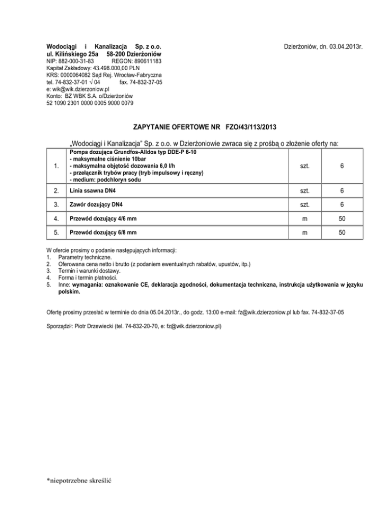 Wodociągi i Kanalizacja Sp. z o.o. ul. Kilińskiego 25a 58-200 Dzierżoniów Dzierżoniów, dn. 03.04.2013r. NIP: 882-000-31-83 REGON: 890611183 Kapitał Zakładowy: 43.498.000,00 PLN KRS: 0000064082 Sąd Rej. Wrocław-Fabryczna tel. 74-832-37-01 ÷ 04 fax. 74-832-37-05 e: [email protected] Konto: BZ WBK S.A. o/Dzierżoniów 52 1090 2301 0000 0005 9000 0079 ZAPYTANIE OFERTOWE NR FZO/43/113/2013 „Wodociągi i Kanalizacja” Sp. z o.o. w Dzierżoniowie zwraca się z prośbą o złożenie oferty na: 1. Pompa dozująca Grundfos-Alldos typ DDE-P 6-10 - maksymalne ciśnienie 10bar - maksymalna objętość dozowania 6,0 l/h - przełącznik trybów pracy (tryb impulsowy i ręczny) - medium: podchloryn sodu szt. 6 2. Linia ssawna DN4 szt. 6 3. Zawór dozujący DN4 szt. 6 4. Przewód dozujący 4/6 mm m 50 5. Przewód dozujący 6/8 mm m 50 W ofercie prosimy o podanie następujących informacji: 1. Parametry techniczne. 2. Oferowana cena netto i brutto (z podaniem ewentualnych rabatów, upustów, itp.) 3. Termin i warunki dostawy. 4. Forma i termin płatności. 5. Inne: wymagania: oznakowanie CE, deklaracja zgodności, dokumentacja techniczna, instrukcja użytkowania w języku polskim. Ofertę prosimy przesłać w terminie do dnia 05.04.2013r., do godz. 13:00 e-mail: [email protected] lub fax. 74-832-37-05 Sporządził: Piotr Drzewiecki (tel. 74-832-20-70, e: [email protected]) *niepotrzebne skreślić