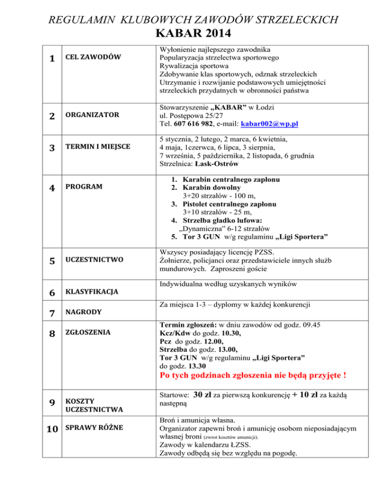 REGULAMIN KLUBOWYCH ZAWODÓW STRZELECKICH KABAR 2014 1 CEL ZAWODÓW 2 ORGANIZATOR 3 TERMIN I MIEJSCE 4 PROGRAM 5 UCZESTNICTWO 6 KLASYFIKACJA 7 NAGRODY 8 ZGŁOSZENIA Wyłonienie najlepszego zawodnika Popularyzacja strzelectwa sportowego Rywalizacja sportowa Zdobywanie klas sportowych, odznak strzeleckich Utrzymanie i rozwijanie podstawowych umiejętności strzeleckich przydatnych w obronności państwa Stowarzyszenie „KABAR” w Łodzi ul. Postępowa 25/27 Tel. 607 616 982, e-mail: [email protected] 5 stycznia, 2 lutego, 2 marca, 6 kwietnia, 4 maja, 1czerwca, 6 lipca, 3 sierpnia, 7 września, 5 października, 2 listopada, 6 grudnia Strzelnica: Łask-Ostrów 1. Karabin centralnego zapłonu 2. Karabin dowolny 3+20 strzałów - 100 m, 3. Pistolet centralnego zapłonu 3+10 strzałów - 25 m, 4. Strzelba gładko lufowa: „Dynamiczna” 6-12 strzałów 5. Tor 3 GUN w/g regulaminu „Ligi Sportera” Wszyscy posiadający licencję PZSS. Żołnierze, policjanci oraz przedstawiciele innych służb mundurowych. Zaproszeni goście Indywidualna według uzyskanych wyników Za miejsca 1-3 – dyplomy w każdej konkurencji Termin zgłoszeń: w dniu zawodów od godz. 09.45 Kcz/Kdw do godz. 10.30, Pcz do godz. 12.00, Strzelba do godz. 13.00, Tor 3 GUN w/g regulaminu „Ligi Sportera” do godz. 13.30 Po tych godzinach zgłoszenia nie będą przyjęte ! 9 KOSZTY UCZESTNICTWA 10 SPRAWY RÓŻNE Startowe: 30 zł za pierwszą konkurencję + 10 zł za każdą następną Broń i amunicja własna. Organizator zapewni broń i amunicję osobom nieposiadającym własnej broni (zwrot kosztów amunicji). Zawody w kalendarzu ŁZSS. Zawody odbędą się bez względu na pogodę. Regulamin konkurencji: Karabin centralnego zapłonu: Odległość do tarcz 100m, 20 strzałów - strzelanie dokładne w ograniczonym czasie. 1. Broń - Karabin samopowtarzalny lub powtarzalny w kalibrze od 5,56 mm (.222) do 11,43 mm (.45), wyłącznie centralnego zapłonu. Karabiny posiadające wyłącznie mechaniczne przyrządy celownicze, nie ma ograniczeń co do siły spustu (jednak musi on bezpiecznie funkcjonować), rodzaju kolby, kompensator max fi 26 dł.90mm. Karabin dowolny: Odległość do tarcz 100m, 20 strzałów - strzelanie dokładne w ograniczonym czasie. 1. Broń - Karabin samopowtarzalny lub powtarzalny w kalibrze od 5,56 mm (.22) do 11,43 mm (.45) (dowolny rodzaj amunicji i ładowania). Karabiny posiadające dowolne przyrządy celownicze (kolimator, luneta z dowolnym powiększeniem), nie ma ograniczeń co do siły spustu (jednak musi on bezpiecznie funkcjonować), rodzaju kolby i kompensatorów. W trakcie trwania konkurencji nie wolno zmieniać broni ani jej zasadniczych części. 2. Amunicja 23 sztuki amunicji w kalibrze według punktu 1. Amunicja ładowana 1x3 szt. (strzały próbne) oraz 2x10 szt. 3. Sprzęt dodatkowy Nie wolno używać optycznych urządzeń obserwacyjnych. 4. Przebieg konkurencji i warunki strzelania a) odległość 100 m b) tarcza TS-2 c) ilość strzałów 3 + 2 x 10 d) pozycja strzelecka 10 stojąc + 10 klęcząc, nie wolno używać pasa nośnego itp. e) czas strzelania 1 min 30 s (3 strzały próbne), 10 min (strzały oceniane) 5. Komendy Wszelkie komendy w trakcie trwania konkurencji wydaje sędzia nadzorujący jej przebieg Komendy występujące na linii ognia są następujące: b) ŁADUJ /zawodnik ładuje amunicję do magazynka, podłącza magazynek do broni i przeładowuje/ c) START /można strzelać/ d) STOP /przerywamy strzelanie, zdejmujemy palec z języka spustowego/ e) ROZŁADUJ, DO PRZEJRZENIA BROŃ/ odłączamy magazynek, pokazujemy sędziemu pusty magazynek oraz pustą komorę nabojową, oddajemy strzał kontrolny, chowamy lub odkładamy broń i schodzimy ze stanowiska/ W przypadku gdy zawodnik ukończy konkurencję przed upływem przewidzianego czasu, odłącza magazynek i czeka na kontrolę rozładowania broni. 6. Strzały próbne. 3 strzały z postawy klęcząc lub stojąc 7. Punktacja i wyniki Wynikiem jest suma wartości 20 przestrzelin w tarczy. Ocena tarczy odbywa się w obecności zawodnika. 8. Bezpieczeństwo Podczas trwania konkurencji należy zwrócić szczególną uwagę na: a) przenoszenie broni długiej (karabin, strzelba) na terenie strzelnicy tylko lufą do góry lub do dołu, rozładowaną, zabezpieczoną, bez podłączonego magazynka; b) ładowanie broni tylko na stanowisku strzeleckim i na komendę sędziego; c) zachowanie bezpiecznego kierunku wylotu lufy broni; d) niewysuwanie żadnej części ciała przed płaszczyznę wylotu lufy w momencie oddawania strzału; e) kładzenie palca na języku spustowym tylko po skierowaniu broni w stronę celu; f) zabrania się wychodzenia zawodnikom lub innym osobom za linię ognia w czasie trwania konkurencji; g) zabrania się ładowania do magazynka więcej niż 10 szt. amunicji h) na terenie strzelnicy poza „Strefami Bezpieczeństwa” można dowolnie manipulować amunicja i środkami do jej przenoszenia. Wyznacza się na strzelnicy „Strefę Bezpieczeństwa”, w której zawodnicy mogą składać się do strzału, czyścić, rozbierać, manipulować, wymieniać magazynki, dobywać z futerałów, przygotowywać się do strzelania, itp. Broń w „Strefie Bezpieczeństwa” nie może być załadowana. W „Strefie Bezpieczeństwa” nie można wyjmować żadnego rodzaju amunicji, nawet ćwiczebnej. Manipulowanie bronią w innych miejscach jest zabronione. 9. Kary Od końcowego wyniku odjęte zostaną 2 punkty: a) za każdy strzał oddany po podpowiedzi udzielonej przez inną osobę; b) za każdy strzał oddany ponad przewidzianą w konkurencji ilość, przy czym odejmowana jest wartość najlepszej przestrzeliny uzyskanej w ostrzelanej tarczy; c) za każdy strzał oddany po komendzie STOP, jeżeli nie stanowił zagrożenia bezpieczeństwa. Odejmowana jest wartość najlepszej przestrzeliny uzyskanej w ostrzelanej tarczy; d) przy pierwszym przewinieniu polegającym na stosowaniu podpórki w trakcie konkurencji. Następną karą za 