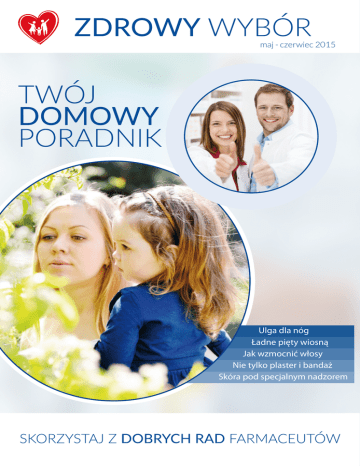 maj - czerwiec 2015 Ulga dla nóg Ładne pięty wiosną Jak wzmocnić włosy Nie tylko plaster i bandaż Skóra pod specjalnym nadzorem 2 ZDROWY WYBÓR ZDROWY WYBÓR 3 Drodzy czytelnicy, Dla wielu z nas wiosna to ulubiony okres w roku, kiedy znów możemy wrócić do pełnej aktywności fizycznej i cieszyć się piękną pogodą. W naszej ofercie chcemy zapewnić Państwu kompleksowe wsparcie w tym wyjątkowym czasie. Proponujemy szereg suplementów diety, które wzmocnią Państwa zdrowie, w tym witaminy i preparaty pomagające w odchudzaniu. Jednym z największych problemów tego okresu są alergie i uczulenia, które dotykają coraz większą część społeczeństwa, dlatego w naszej ofercie znalazł się również asortyment z tej kategorii. Pamiętamy także o dzieciach, dla których jest to niezwykle aktywna pora roku i które potrzebują w tym czasie odpowiedniej ochrony. Ponadto zachęcamy także do wypełnienia krzyżówki, w której można wygrać atrakcyjne nagrody. Zespół Zdrowego Wyboru BESTSELLER CLARITINE SPE* 10 mg, tabl., 7 szt,blister. Produkt leczniczy. Nazwa powszechnie stosowana i dawka substancji czynnej: Loratadinum. Każda tabletka zawiera 10 mg Loratadinum (loratadyny). Substancje pomocnicze, m.in. laktoza jednowodna. Postać farmaceutyczna: Tabletki. Wskazanie: objawowe leczenie alergicznego zapalenia błony śluzowej nosa i przewlekłej pokrzywki idiopatycznej. Przeciwwskazania: Nadwrażliwość na substancję czynną (loratadynę) lub na którąkolwiek substancję pomocniczą. Nie stosować Claritine® SPE w okresie ciąży. Podmiot odpowiedzialny: MSD Polska Sp. z o.o., ul. Chłodna 51, 00-867 Warszawa, Polska. * Przed użyciem zapoznaj się z ulotką, która zawiera wskazania, przeciwwskazania, dane dotyczące działań niepożądanych i dawkowanie oraz informacje dotyczące stosowania produktu leczniczego, bądź skonsultuj się z lekarzem lub farmaceutą, gdyż każdy lek niewłaściwie stosowany zagraża Twojemu życiu lub zdrowiu. POMÓŻ SWOIM NOGOM 4 MULTIFLAV AESCIN* Tabletki powlekane, 30 szt./60 szt., Suplement diety. 20 mg, tabletki powlekane, 30 szt./90 szt. Produkt leczniczy. Działa przeciwobrzękowo i przeciwzapalnie. Poprawia stan napięcia naczyń krwionośnych i zmniejsza przepuszczalność ich ścian. MULTIFLAV to preparat zawierający aż 5 składników aktywnych tworzących unikalny Mlcro Flavo 5 Complex. Składniki aktywne preparatu MULTIFLAV wspomagają prawidłową produkcję kolagenu, przez co pozwalają zachować właściwe funkcjonowanie naczyń krwionośnych, w tym również żył kończyn dolnych. Właściwy przepływ krwi w naczyniach kończyn dolnych wpływa na zmniejszenie uczucia „ciężkich nóg". Skład jakościowy i ilościowy: 1 tabletka powlekana zawiera 20 mg alfa-escyny (Escinum). Laktoza jednowodna. Wskazania do stosowania: Leczenie przewlekłej niewydolności żylnej, żylaków kończyn dolnych, żylaków odbytu. Leczenie zapalenia żył kończyn dolnych. Profilaktyka i leczenie krwiaków i obrzęków pooperacyjnych i pourazowych. Przeciwwskazania: Nadwrażliwość na substancję czynnq lub na którakolwiek substancję pomocniczq. Bezwzględnym przeciw-wskazaniem do stosowania jest ciężka niewydolność nerek. Alfa-escyny nie należy stosować u kobiet w ciqży oraz w okresie karmienia piersiq. Podmiot odpowiedzialny: Teva Pharmaceuticals Polska Sp. z o.o., ul. E. Plater 53, 00-113 Warszawa, Polska. LEARGIN HS ŻEL KASZTANOWY żel z HEPARYNĄ SODU poprawiający kondycję zmęczonych nóg, 45g Kosmetyk. Z ARNIKĄ DR. NATURY 350g + 150g Gratis! Kosmetyk. Zalecany dla osób ze skórą skłonną do pajączków naczyniowych wykonujących stojącą i siedzącą pracę. Poprawia ich estetykę i wygląd. Działa łagodząco i odprężająco. Do masażu nóg i stóp. TESTOWANY DERMATOLOGICZNIE, ZAWIERA PARABENÓW Sposób użycia: nanieść żel na skórę i wmasować . W miarę potrzeb można stosować kilka razy dziennie. Po użyciu umyć ręce. Leargin HS to żel na zmęczone nogi z unikalnym bogatym składem, który dzięki bardzo wysokiej zawartości substancji aktywnych: • HEPARYNY SODU, • Mentolu, • wyciągu z nasion Kasztanowca Zwyczajnego, • wyciągu z Oczaru Wirginijskiego, • wyciągu z Arniki Górskiej, • oraz Argininy, Przeciwwskazania: Produkt przeznaczony do użytku zewnętrznego. Nie stosować na otwarte rany oraz w okolicach oczu, nosa i ust. ASPARAGINIAN EXTRA Magnez Potas, tabletki, 50 szt. Suplement diety. ceniony jest za swoją wysoką skuteczność i jakość. Magnez i potas wspomagają: pracę serca i układu krążenia, prawidłowe ciśnienie krwi, pracę mięśni, system nerwowy. Ulga dla nóg Pionowa pozycja ciała sprawia, że krew, płynąca żyłami w nogach w kierunku serca, wykonuje ogromną pracę. Jeśli długo się nie ruszamy, w żyłach znacznie zwiększa się ciśnienie, które może je uszkodzić. Wtedy zawarta we krwi woda przenika przez ścianki naczyń do tkanek, ciśnienie zmniejsza się, ale nogi stają się opuchnięte. Kiedy stoimy, przepływ krwi może ułatwić prosta gimnastyka: dreptanie, uginanie kolan czy stawanie na palcach. Ćwiczmy również, jeśli mamy pracę siedzącą: poruszajmy palcami, czy napinajmy mięśnie łydek. W domu na kilkanaście minut owińmy kostki zmoczonym i schłodzonym w lodówce bandażem, a potem ułóżmy nogi powyżej ciała. Stosujmy preparaty uszczelniające i poprawiające elastyczność naczynek, takie jak rutyna lub wyciąg z kasztanowca, a także żele i kremy z heparyną i arniką, chroniące przed obrzękami i poprawiające krążenie. NIE Składniki preparatu wykazują następujące działania: • Magnez: wspomaga prawidłowe funkcjonowanie mięśni, w tym mięśnia sercowego, wspiera prawidłowe działanie układu nerwowego i psychicznego czym przyczynia się do zmniejszenia uczucia zmęczenia i znużenia, pomaga w utrzymaniu prawidłowej równowagi elektrolitycznej, pomaga w utrzymaniu zdrowych kości i zębów. • Po