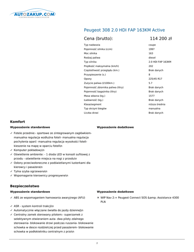 Peugeot 308 2.0 HDI FAP 163KM Active Cena (brutto): 114 200 zł Typ nadwozia coupe Pojemność silnika (ccm) 1997 Moc silnika 163 Rodzaj paliwa diesel Typ silnika 2.0 HDI FAP 163KM Prędkość maksymalna (km/h) 202 Częstotliwość przeglądu (km.) Brak danych Przyspieszenie (s.) 8 Opony 225/45 R17 Zużycie paliwa (l/100km.) 5.7 Pojemność zbiornika paliwa (litry) Brak danych Pojemność bagażnika (litry) Brak danych Masa własna (kg.) 1577 Ładowność (kg.) Brak danych Klasa/segment niższa średnia Typ skrzyni biegów manualna Liczba drzwi Brak danych Komfort Wyposażenie standardowe Wyposażenie dodatkowe ✓ Fotele przednie:- sportowe ze zintegrowanym zagłówkiemmanualna regulacja wzdłużna foteli- manualna regulacja pochylenia oparć- manualna regulacja wysokości fotelikieszenie na mapę w oparciu foteli\n ✓ Komputer pokładowy\n ✓ Oświetlenie ambiente: - 1 dioda LED w konsoli sufitowej z przodu - oświetlenie miejsca na nogi z przodu\n ✓ Osłony przeciwsłoneczne z podświetlanymi lusterkami dla kierowcy i pasażera\n ✓ Tylna szyba ogrzewana\n ✓ Wspomaganie kierownicy progresywne\n Bezpieczeństwo Wyposażenie standardowe Wyposażenie dodatkowe ✓ ABS ze wspomaganiem hamowania awaryjnego (AFU) ✕ WIP Nav 2:+ Peugeot Connect SOS & Assistance 4300 PLN ✓ ASR - system kontroli trakcji\n ✓ Automatycznie włączane światła do jazdy dziennej\n ✓ Centralny zamek sterowany pilotem:- superzamek z selektywnym otwieraniem auta- dwa piloty zdalnego sterowania- blokowanie drzwi podczas ruszania- blokowanie schowka w desce rozdzielczej przed pasażerem- blokowanie schowka w podłokietniku centralnym z przo\n 1 ✓ ESP - system stabilizacji toru jazdy\n ✓ Kontrolki niezapiętych pasów w pierwszym i drugim rzędzie z funkcją ostrzegania o wypięciu pasów\n ✓ Mocowania fotelika dziecięcego Isofix (x2) w drugim rzędzie siedzeń\n ✓ Pasy bezpieczeństwa w drugim rzędzie z ogranicznikami siły napięcia\n ✓ Pasy bezpieczeństwa w pierwszym rzędzie z napinaczami i ogranicznikami siły napięcia\n ✓ Poduszki boczne chroniące głowę kierowcy i pasażera\n ✓ Poduszki boczne chroniące klatkę piersiową oraz miednicę kierowcy i pasażera\n ✓ Poduszki czołowe dla kierowcy i pasażera (pasażera z możliwością dezaktywacji)\n ✓ Przednie światła LED do jazdy dziennej\n ✓ REF - elektroniczny rozdzielacz siły hamowania oś przednia/tylna\n ✓ Reflektory przednie halogenowe\n ✓ Regulator i ogranicznik prędkości ze sterowaniem z kolumny kierownicy\n ✓ System tylnego oświetlenia z funkcją ostrzegania innych użytkowników drogi przy nagłym hamowaniu pojazdu\n ✓ Tylne światła z diodami LED\n Dodatki Wyposażenie standardowe Wyposażenie dodatkowe ✓ Aluminiowe listwy progowe ✕ Alarm 1500 PLN ✓ Aluminiowe nakładki na pedały ✕ Felgi aluminiowe 18" Lincancabur i opony 225/40 R18 + czujnik ciśnienia w oponach DSGKoło zapasowe pełnowymiarowe aluminiowe 18" 1600 PLN ✓ Chromowane listwy podokienne ✕ Lakier metalizowany 1950 PLN ✓ Deska rozdzielcza z konsolą w kolorze czarnym Nacre ✕ Lakier perłowy Biały Nacre 2250 PLN ✓ Elektrycznie składany i rozkładany metalowy dach sterowany ✕ Podgrzewane przednie fotele(dla Active również jako przyciskiem na konsoli środkowej ✓ Elektrycznie sterowane szyby boczne:- przednie sterowane element opcji Pakiet Skórzany lub Pakiet Skórzany Integral) ✕ System 650 PLNHi-Fi JBL:- 6 głośników JBL: 4 przód + 2 tył- sekwencyjnie z blokadą przycięcia- tylne opuszczane amplituner 240W JBL- automatyczna regulacja głośności w sekwencyjnie- elektryczna blokada otwarcia tylnych okien konfiguracji coupe / kabriolet 1900 PLN przez dzieci- możliwość sterowania wszystkimi szybami jednym przyciskiem na konsoli środk ✓ Gałka dźwigni zmiany biegów skórzana z chromowanym ✕ Windstop montowany za pierwszym rzędem siedzeń(dla wykończeniem ✓ Immobiliser Active również jako element opcji Pakiet Airwave) 1050 PLN ✕ WIP Nav 2:- WIP Bluetooth- nawigacja satelitarna z mapą Europy na dysku twardym- kolorowy wyświetlacz LCD 7" na desce rozdzielczej- radio CD z MP3 + 6 głośników (4 przód + 2 tył)- sterowanie z kolumny kierownicy- gniazdo RCA audio w zamykanym schowku prze 3300 PLN ✓ Kierownica 3-ramienna skórzana sportowa z chromowanym wykończeniem\n 2 ✓ Kieszenie w drzwiach bocznych z przodu\n ✓ Klamki wewnętrzne chromowane\n ✓ Klamki zewnętrzne w kolorze nadwozia\n ✓ Klimatyzacja automatyczna dwustrefowa + filtr przeciwpyłkowy z węglem aktywnym\n ✓ Lakier niemetalizowany\n ✓ Lusterka boczne sterowane, podgrzewane i składane elektrycznie z oświetleniem podłoża przydrzwiach auta + zintegrowane migacze\n ✓ Lusterka boczne w kolorze nadwozia\n ✓ Monochromatyczny wyświetlacz graficzny C- na desce rozdzielczej (brak przy wyborze WIP Nav 2)\n ✓ Oświetlenie wnętrza:- 1 lampka centralna + 2 lampki do czytania w konsoli sufitowej z przodu- 1 lampka centralna w drugim rzędzie foteli- oświetlenie progów drzwi- oświetlenie bagażnika\n ✓ Podłokietnik centralny z przodu z regulacją położenia + schowek blokowany centralnym zamkiem\n ✓ Przedni zderzak z czarnym błyszczącym wlotem powietrza do silnika + chromowane wykończenie\n ✓ Przednia szyba akustyczna\n ✓ Reflektory przednie przeciwmgielne\n ✓ Regulacja kolumny kierownicy manualna w dwóch płaszczyznach\n ✓ Roleta oddzielająca przestrzeń bagażową od złożonego dachu\n ✓ Schowek w desce rozdzielczej przed pasażerem, zamykany, podświetlany, klimatyzowany, blokowany centralnym zamkiem\n ✓ Schowek zamykany w tylnej części konsoli środkowej\n ✓ Schowki otwarte:- po stronie kierowcy w desce rozdzielczejna desce rozdzielczej poniżej radia- wnęka poniżej popielniczki- dodatkowy schowek na konsoli środkowej (brak przy wyborze opcji Pakiet Airwave)\n ✓ Siatka mocująca bagaże w bagażniku\n ✓ Składany haczyk na torbę po stronie pasażera z przodu (na boku konsoli