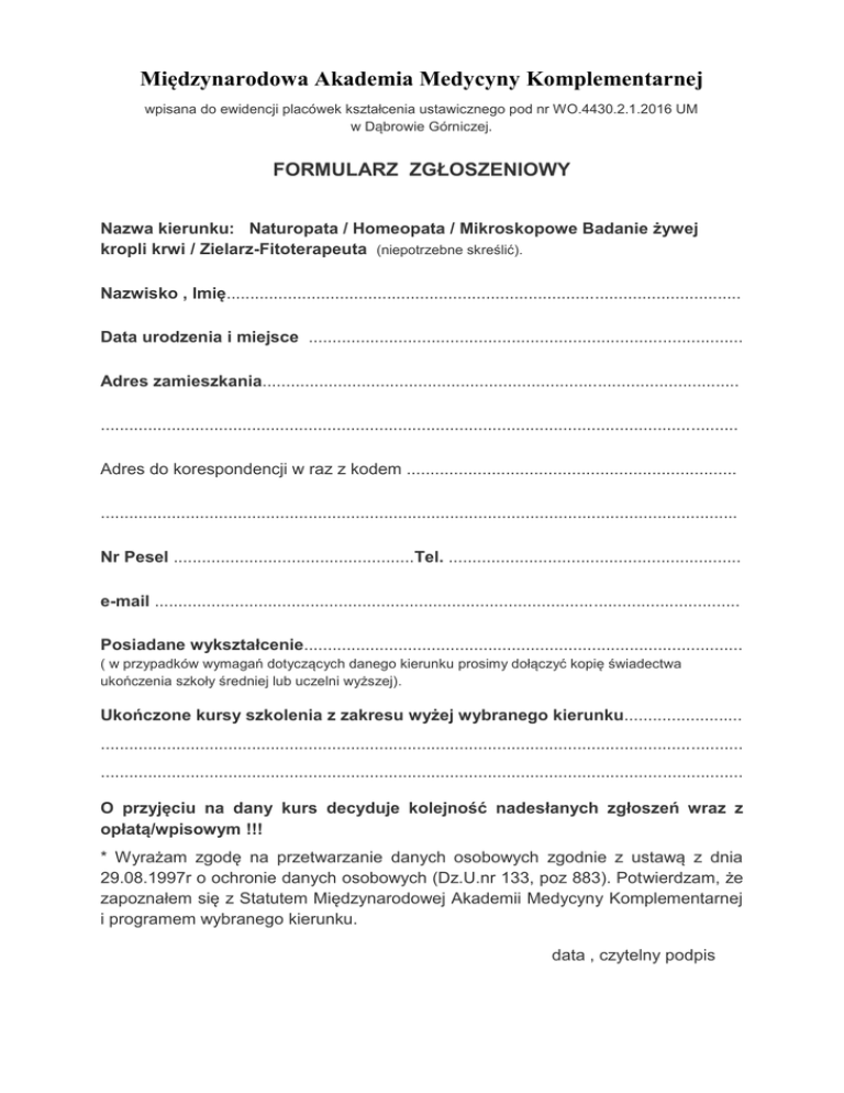 Międzynarodowa Akademia Medycyny Komplementarnej wpisana do ewidencji placówek kształcenia ustawicznego pod nr WO.4430.2.1.2016 UM w Dąbrowie Górniczej. FORMULARZ ZGŁOSZENIOWY Nazwa kierunku: Naturopata / Homeopata / Mikroskopowe Badanie żywej kropli krwi / Zielarz-Fitoterapeuta (niepotrzebne skreślić). Nazwisko , Imię............................................................................................................. Data urodzenia i miejsce ............................................................................................ Adres zamieszkania..................................................................................................... ....................................................................................................................................... Adres do korespondencji w raz z kodem ...................................................................... ....................................................................................................................................... Nr Pesel ...................................................Tel. .............................................................. e-mail ............................................................................................................................ Posiadane wykształcenie............................................................................................. ( w przypadków wymagań dotyczących danego kierunku prosimy dołączyć kopię świadectwa ukończenia szkoły średniej lub uczelni wyższej). Ukończone kursy szkolenia z zakresu wyżej wybranego kierunku......................... ........................................................................................................................................ ........................................................................................................................................ O przyjęciu na dany kurs decyduje kolejność nadesłanych zgłoszeń wraz z opłatą/wpisowym !!! * Wyrażam zgodę na przetwarzanie danych osobowych zgodnie z ustawą z dnia 29.08.1997r o ochronie danych osobowych (Dz.U.nr 133, poz 883). Potwierdzam, że zapoznałem się z Statutem Międzynarodowej Akademii Medycyny Komplementarnej i programem wybranego kierunku. data , czytelny podpis