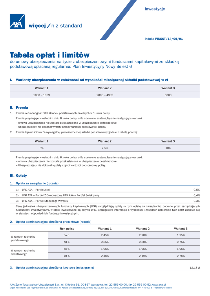 inwestycje indeks PINS6T/14/09/01 Tabela opłat i limitów do umowy ubezpieczenia na życie z ubezpieczeniowymi funduszami kapitałowymi ze składką podstawową opłacaną regularnie: Plan Inwestycyjny Nowy Selekt 6 I. Warianty ubezpieczenia w zależności od wysokości miesięcznej składki podstawowej w zł Wariant 1 Wariant 2 Wariant 3 1000 – 1999 2000 – 4999 5000 II. Premia 1. Premia refundacyjna: 50% składek podstawowych należnych w 1. roku polisy. Premia przysługuje w ostatnim dniu 6. roku polisy, o ile spełnione zostaną łącznie następujące warunki: – umowa ubezpieczenia nie została przekształcona w ubezpieczenie bezskładkowe, – Ubezpieczający nie dokonał wypłaty części wartości podstawowej polisy. 2. Premia lojalnościowa: % wymagalnej pierwszorocznej składki podstawowej zgodnie z tabelą poniżej: Wariant 1 Wariant 2 Wariant 3 5% 7,5% 10% Premia przysługuje w ostatnim dniu 6. roku polisy, o ile spełnione zostaną łącznie następujące warunki: – umowa ubezpieczenia nie została przekształcona w ubezpieczenie bezskładkowe, – Ubezpieczający nie dokonał wypłaty części wartości podstawowej polisy. III. Opłaty 1. Opłata za zarządzanie (rocznie) 1) UFK AXA – Portfel Akcji 0,5% 2) UFK AXA – Portfel Zrównoważony, UFK AXA – Portfel Selektywny 0,4% 3) UFK AXA – Portfel Stabilnego Wzrostu 0,3% Ceny jednostek ubezpieczeniowych funduszy kapitałowych (UFK) uwzględniają opłaty (w tym opłatę za zarządzanie) pobrane przez zarządzających funduszami inwestycyjnymi, w które inwestowane są aktywa UFK. Szczegółowe informacje o wysokości i zasadach pobierania tych opłat znajdują się w statutach odpowiednich funduszy inwestycyjnych. 2. Opłata administracyjna określona procentowo (rocznie) W ramach rachunku podstawowego W ramach rachunku dodatkowego 3. Rok polisy Wariant 1 Wariant 2 Wariant 3 do 6. 2,45% 2,20% 1,95% od 7. 0,85% 0,80% 0,75% do 6. 1,95% 1,95% 1,95% od 7. 0,85% 0,80% 0,75% Opłata administracyjna określona kwotowo (miesięcznie) AXA Życie Towarzystwo Ubezpieczeń S.A., ul. Chłodna 51, 00-867 Warszawa, tel. 22 555 00 00, fax 22 555 00 52, www.axa.pl Organ rejestrowy: Sąd Rejonowy dla m.st. Warszawy, XII Wydział Gospodarczy KRS, Nr KRS 41216, NIP 521-10-36-859, Kapitał zakładowy: 444 440 000 zł – wpłacony w całości 12,18 zł 4. Opłata dystrybucyjna określona procentowo 50% składki podstawowej należnej w 1. roku polisy Opłata jest pobierana sukcesywnie w równych częściach w ramach roku polisy, za który należne są składki podstawowe. 5. Opłata dystrybucyjna określona kwotowo 500 zł Opłata pobierana w przypadku rozwiązania umowy w pierwszych 6 latach polisy. 6. Opłata transakcyjna 1) z tytułu wypłaty części wartości podstawowej polisy i części wartości dodatkowej polisy: – w formie okresowej 3 zł za każdą wypłatę – w formie jednorazowej 3 zł za 6. i każdą kolejną wypłatę w danym miesiącu polisy 2) z tytułu realizacji pisemnej dyspozycji konwersji 20 zł 3) z tytułu realizacji pisemnej dyspozycji zmiany alokacji 20 zł 4) z tytułu pisemnego przypomnienia o płatności składki podstawowej Opłata nie jest pobierana w przypadku, gdy Ubezpieczający wyrazi zgodę na przesyłanie tej informacji w innej formie, uzgodnionej przez Strony. 5) z tytułu udzielenia na wniosek Ubezpieczającego dodatkowych informacji w formie pisemnej: ponownego przekazania listu rocznicowego, informacji o stanie rachunku, potwierdzenia złożonej dyspozycji 6) 5 zł za każde wysłane przypomnienie z tytułu zapisania jednostek uczestnictwa funduszu zagranicznego 20 zł 0,15% wartości jednostek uczestnictwa Wszystkie dyspozycje konwersji lub zmiany alokacji składane za pośrednictwem serwisu transakcyjnego Towarzystwa są bezpłatne. 7. Opłata za ryzyko ubezpieczeniowe (miesięcznie) 1) do dnia poprzedzającego 6. rocznicę polisy: 2) od 6. rocznicy polisy: 0,025% sumy ubezpieczenia obowiązującej do dnia poprzedzającego 6. rocznicę polisy a) dla Ubezpieczonych w wieku 0 – 17 lat 0,01 zł b) dla Ubezpieczonych w wieku 18 – 40 lat 0,05 zł c) dla Ubezpieczonych w wieku 41 – 60 lat 0,25 zł d) dla Ubezpieczonych w wieku 61 – 80 lat 1,15 zł e) dla Ubezpieczonych w wieku od 81 lat 5,00 zł IV. Limity 1. Suma ubezpieczenia z tytułu śmierci Ubezpieczonego 1) do dnia poprzedzającego 6. rocznicę polisy 2) od 6. rocznicy polisy 55% wpłaconych składek podstawowych należnych w 1. roku polisy 100 zł 2. Minimalna wysokość składki dodatkowej bez ograniczeń 3. Minimalna kwota wypłaty części wartości podstawowej polisy i części wartości dodatkowej polisy bez ograniczeń 4. Minimalna kwota, o którą może zostać podwyższona składka podstawowa 10 zł V. Pozostałe informacje Niniejsza Tabela opłat i limitów została zatwierdzona uchwałą Zarządu Towarzystwa nr 1/04/09/2014 z dnia 4 września 2014 r. Prezes Zarządu Członek Zarządu Jarosław Bartkiewicz Janusz Arczewski 13350814 Niniejsza Tabela opłat i limitów wchodzi w życie z dniem 8 września 2014 r. i ma zastosowanie do umów zawieranych po tej dacie.