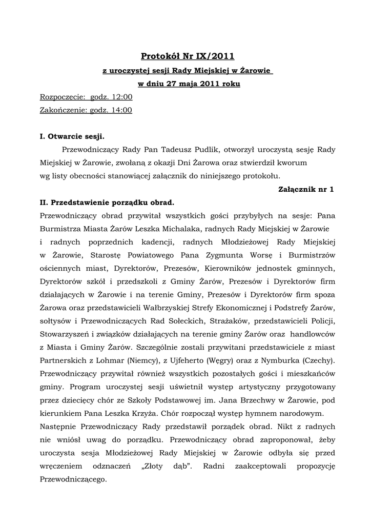 Protokół Nr IX/2011 z uroczystej sesji Rady Miejskiej w Żarowie w dniu 27 maja 2011 roku Rozpoczęcie: godz. 12:00 Zakończenie: godz. 14:00 I. Otwarcie sesji. Przewodniczący Rady Pan Tadeusz Pudlik, otworzył uroczystą sesję Rady Miejskiej w Żarowie, zwołaną z okazji Dni Żarowa oraz stwierdził kworum wg listy obecności stanowiącej załącznik do niniejszego protokołu. Załącznik nr 1 II. Przedstawienie porządku obrad. Przewodniczący obrad przywitał wszystkich gości przybyłych na sesje: Pana Burmistrza Miasta Żarów Leszka Michalaka, radnych Rady Miejskiej w Żarowie i radnych poprzednich kadencji, radnych Młodzieżowej Rady Miejskiej w Żarowie, Starostę Powiatowego Pana Zygmunta Worsę i Burmistrzów ościennych miast, Dyrektorów, Prezesów, Kierowników jednostek gminnych, Dyrektorów szkół i przedszkoli z Gminy Żarów, Prezesów i Dyrektorów firm działających w Żarowie i na terenie Gminy, Prezesów i Dyrektorów firm spoza Żarowa oraz przedstawicieli Wałbrzyskiej Strefy Ekonomicznej i Podstrefy Żarów, sołtysów i Przewodniczących Rad Sołeckich, Strażaków, przedstawicieli Policji, Stowarzyszeń i związków działających na terenie gminy Żarów oraz handlowców z Miasta i Gminy Żarów. Szczególnie zostali przywitani przedstawiciele z miast Partnerskich z Lohmar (Niemcy), z Ujfeherto (Węgry) oraz z Nymburka (Czechy). Przewodniczący przywitał również wszystkich pozostałych gości i mieszkańców gminy. Program uroczystej sesji uświetnił występ artystyczny przygotowany przez dziecięcy chór ze Szkoły Podstawowej im. Jana Brzechwy w Żarowie, pod kierunkiem Pana Leszka Krzyża. Chór rozpoczął występ hymnem narodowym. Następnie Przewodniczący Rady przedstawił porządek obrad. Nikt z radnych nie wniósł uwag do porządku. Przewodniczący obrad zaproponował, żeby uroczysta sesja Młodzieżowej Rady Miejskiej w Żarowie odbyła się przed wręczeniem odznaczeń Przewodniczącego. „Złoty dąb”. Radni zaakceptowali propozycję III. Uroczysta sesja Młodzieżowej Rady Miejskiej w Żarowie: Uroczystą sesję Młodzieżowej Rady Miejskiej w Żarowie otworzył i poprowadził jej Przewodniczący Mateusz Michalak. Przywitał wszystkich gości i wraz z Burmistrzem Młodzieżowej Rady Miejskiej wręczył nagrodę „Maciusia” Pani Jolancie Papińskiej oraz firmie Daicel Safety Systems Europe Sp. z o.o. Przedstawicielce firmy Pani Dominice Ciara. W uzasadnieniu podkreślili ich zaangażowanie w pracy z młodzieżą oraz wkład i pomoc w funkcjonowanie Młodzieżowej Rady Miejskiej w Żarowie. Po wręczeniu statuetek „Maciuś” Przewodniczący Młodzieżowej Rady Miejskiej w Żarowie zamknął obrady i oddał głos Przewodniczącemu Rady Miejskiej w Żarowie Tadeuszowi Pudlikowi, który zaczął od uczczenia minutą ciszy osób zmarłych odznaczonych odznaczeniem „Złoty Dąb” w poprzednich latach. IV. Wręczenie odznaczeń „Złoty Dąb”. Przewodniczący Rady Tadeusz Pudlik wprowadził wszystkich obecnych w tematykę mówiąc, że zgodnie z uchwałą Rady Miejskiej w Żarowie w sprawie zasad i trybu przyznawania odznaczenia „Złoty dąb” Kapituła Odznaczenia nadaje odznaczenie „Złoty dąb” osobom zasłużonym dla Gminy Żarów. W tym roku tym najwyższym gminnym odznaczeniem wyróżniono: 1. Panią Lillę Gruntkowską, 2. Pana Walentego Styrcza, 3. Pana Kazimierza Skwierczyńskiego, 4. Panią Bronisławę Danutę Chrebelę, 5. Pana Tadeusza Skoczyńskiego, 6. Pana Janusza Przybyłowicza, 7. Panią Józefę Jasińską, 8. Pana Stanisława Legiejewa, 9. Pana Michała Bieszczada. Laudacje są w załączeniu do niniejszego protokołu. Po wręczeniu odznaczeń głos w imieniu wszystkich odznaczonych zabrała Pani Lilla Gruntkowska, która podziękowała za wyróżnienie, jakie ich spotkało. Po ceremonii wręczenia odznaczeń, Przewodniczący Rady pogratulował jeszcze raz wszystkim odznaczonym i przeszedł do kolejnego punktu porządku obrad. V. Wystąpienia gości. Przewodniczący obrad oddał głos Burmistrzowi Miasta Żarów Leszkowi Michalakowi, który podziękował wszystkim za przybycie a szczególnie gościom z miast partnerskich, przybliżył historię nawiązania stosunków międzynarodowych, a następnie oddał głos przedstawicielom: Burmistrzowi Ujfeherto Matyasowi B. Szabolcs oraz szefowi biura burmistrza z Nymburka Strnadova Vlasta. Następnie głos zabrał Przewodniczący obrad, który po wyczerpaniu tego punktu porządku obrad przeszedł do następnego. Ad VI. Wręczenie Dyplomów ukończenia szkolenia strażaków-ratowników Ochotniczej Straży Pożarnej z terenu Gminy Żarów. Wręczenia Dyplomów dokonał Burmistrz Miasta Żarów Leszek Michalak gratulując wszystkim strażakom- ratowników ukończenia szkolenia z wynikami dobrymi lub bardzo dobrymi i życząc sukcesów w ich trudnej i ciężkiej pracy. Ad VII. Prezentacja Multimedialna „Alei Złotych Dębów” w Żarowie. Prezentacje omówił Burmistrz Miasta Żarów Leszek Michalak, który powiedział, że będzie miał niebywałą przyjemność przedstawić radnym Rady Miejskiej w Żarowie na jednej z następnych sesji projekt uchwały dotyczący nadania nazwy „Alei Złotych Dębów” w Żarowie. Po prezentacji oddał głos Przewodniczącemu obrad, który przeszedł do następnego punktu porządku obrad. VIII. Zamknięcie obrad uroczystej sesji Rady Miejskiej w Żarowie. Po wyczerpaniu porządku obrad Przewodniczący Rady pan Tadeusz Pudlik zamknął obrady uroczystej sesji Rady Miejskiej w Żarowie w dniu 27 maja 2011 roku i zaprosił wszystkich zebranych na poczęstunek oraz do obejrzenia wystawy przygotowanej z okazji Dni Żarowa. …................................................ …..................................................... Protokołowała Przewodniczący obrad