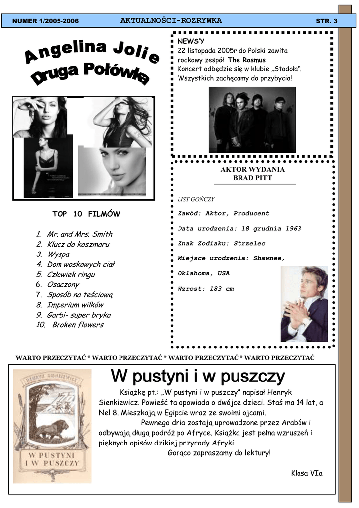 NUMER 1/2005-2006 STR. 3 NEWS’Y 22 listopada 2005r do Polski zawita rockowy zespół The Rasmus Koncert odbędzie się w klubie „Stodoła”. Wszystkich zachęcamy do przybycia! AKTOR WYDANIA BRAD PITT LIST GOŃCZY TOP 10 FILMÓW 1. 2. 3. 4. 5. Mr. and Mrs. Smith Klucz do koszmaru Wyspa Dom woskowych ciał Człowiek ringu 6. Osaczony 7. Sposób na teściową 8. Imperium wilków 9. Garbi- super bryka 10. Broken flowers Zawód: Aktor, Producent Data urodzenia: 18 grudnia 1963 Znak Zodiaku: Strzelec Miejsce urodzenia: Shawnee, O Oklahoma, USA Wzrost: 183 cm WARTO PRZECZYTAĆ * WARTO PRZECZYTAĆ * WARTO PRZECZYTAĆ * WARTO PRZECZYTAĆ Książkę pt.: „W pustyni i w puszczy” napisał Henryk Sienkiewicz. Powieść ta opowiada o dwójce dzieci. Staś ma 14 lat, a Nel 8. Mieszkają w Egipcie wraz ze swoimi ojcami. Pewnego dnia zostają uprowadzone przez Arabów i odbywają długą podróż po Afryce. Książka jest pełna wzruszeń i pięknych opisów dzikiej przyrody Afryki. Gorąco zapraszamy do lektury! Klasa VIa