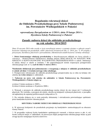 Regulamin rekrutacji dzieci do Oddziału Przedszkolnego przy Szkole Podstawowej im. Powstańców Wielkopolskich w Pakości wprowadzony Zarządzeniem nr 1/2014 z dnia 19 lutego 2014 r. Dyrektora Szkoły Podstawowej w Pakości Zasady naboru dzieci do oddziału przedszkolnego na rok szkolny 2014/2015 Dnia 18 stycznia 2014 roku weszła w życie nowelizacja ustawy o systemie oświaty w zakresie zasad i kryteriów rekrutacji do przedszkoli, szkół i placówek oświatowych (Dz. U. 2014, poz. 7). W związku z powyższym, Dyrektorzy placówek w porozumieniu z Burmistrzem ustalili kryteria i terminy rekrutacji. 1. Dzieci kontynuujące edukację przedszkolną w dotychczasowym oddziale nie biorą udziału w rekrutacji – Rodzice/Prawni Opiekunowie składają jedynie DEKLARACJĘ NA KOLEJNY ROK SZKOLNY O KONTYNUOWANIU WYCHOWANIA PRZEDSZKOLNEGO w szkole. Deklaracje te należy złożyć w szkole w terminie 7 dni poprzedzających termin rozpoczęcia postępowania rekrutacyjnego (zał. nr 1), czyli do dnia 11 marca 2014 r. Niezłożenie deklaracji jest jednoznaczne z rezygnacją z miejsca w oddziale przedszkolnym w szkole od dnia 1 września nowego roku szkolnego. 2. Postępowanie rekrutacyjne do oddziału przedszkolnego przeprowadza się co roku na kolejny rok szkolny na wolne miejsca w oddziałach. 3. Naborem na nowy rok szkolny do oddziałów w Szkole Podstawowej im. Powstańców Wielkopolskich w Pakości objęte są: a) dzieci 5-letnie urodzone w 2009 r., b) dzieci 6-letnie urodzone w II połowie 2008 r. 4. Wniosek o przyjęcie do oddziału przedszkolnego można złożyć do nie więcej niż 3 wybranych placówek. We wniosku, o przyjęcie do szkoły, określa się kolejność wybranych placówek, w porządku od najbardziej do najmniej preferowanych (załącznik nr 2). 5. Do wniosku dołącza się w razie potrzeby dokumenty i oświadczenia potwierdzające spełnianie przez kandydata kryteriów rekrutacyjnych. KRYTERIA NABORU DZIECI DO ODDZIAŁU PRZEDSZKOLNEGO 6. W pierwszej kolejności do przedszkola przyjmuje się kandydatów zamieszkujących na obszarze Gminy Pakość. 7. W przypadku większej liczby kandydatów spełniających warunek, o którym mowa w pkt. 6, niż liczba wolnych miejsc w oddziałach, na pierwszym etapie postępowania rekrutacyjnego brane są pod uwagę łącznie następujące kryteria ustawowe: 1 I ETAP REKRUTACJI 8. W pierwszym etapie postępowania rekrutacyjnego brane są pod uwagę łącznie następujące kryteria: 1) wielodzietność rodziny kandydata (oznacza to rodzinę wychowującą troje i więcej dzieci); (załącznik nr 3) 2) niepełnosprawność kandydata; 3) niepełnosprawność jednego z rodziców kandydata; 4) niepełnosprawność obojga rodziców kandydata; 5) niepełnosprawność rodzeństwa kandydata; 6) samotne wychowywanie kandydata w rodzinie (oznacza to wychowywanie dziecka przez pannę, kawalera, wdowę, wdowca, osobę pozostającą w separacji orzeczonej prawomocnym wyrokiem sądu, osobę rozwiedzioną, chyba że osoba taka wychowuje wspólnie co najmniej jedno dziecko z jego rodzicem); (załącznik nr 4) 7) objęcie kandydata pieczą zastępczą. Kryteria te mają jednakową wartość - po 5 punktów. II ETAP REKRUTACJI 9. W przypadku równorzędnych wyników uzyskanych na pierwszym etapie postępowania rekrutacyjnego lub jeżeli po zakończeniu tego etapu szkoła nadal dysponuje wolnymi miejscami, na drugim etapie postępowania rekrutacyjnego są brane pod uwagę kryteria naboru wraz z liczbą punktów za poszczególne kryteria, określone przez Dyrektora szkoły w uzgodnieniu z Burmistrzem. 10. W drugim etapie postępowania rekrutacyjnego brane są pod uwagę łącznie następujące kryteria: L.p. 1. 2. 3. 4. Kryterium Dziecko realizujące roczne przygotowanie przedszkolne (dotyczy dzieci 6-letnich urodzonych w okresie od 01.07.2008r. do 31.12.2008r.). Dziecko zamieszkujące na terenie wsi w Gminie Pakość (dotyczy dzieci 5-letnich, dzieci 6-letnich urodzonych w okresie od 01.07.2008r. do 31.12.2008r.). Dziecko realizujące roczne przygotowanie przedszkolne (dotyczy dzieci 5-letnich zamieszkałych na terenie miasta Pakość). Dziecko, którego rodzeństwo kontynuuje edukację w Szkole Podstawowej w Pakości. Maksymalna liczba punktów możliwa do uzyskania Wartość kryteriów punktach 3 3 2 1 9 DOKUMENTY I OŚWIADCZENIA POTWIERDZAJĄCE SPEŁNIANIE PRZEZ KANDYDATA KRYTERIÓW REKRUTACYJNYCH, DOŁĄCZONE DO WNIOSKU 11. W celu potwierdzenia kryteriów rekrutacyjnych w miarę potrzeb niezbędne będzie złożenie przez wnioskodawców stosownych dokumentów. KRYTERIA I ETAPU: 1) oświadczenie o wielodzietności rodziny kandydata – składający oświadczenie jest obowiązany do zawarcia w nim klauzuli następującej treści: „Jestem świadomy odpowiedzialności karnej za złożenie fałszywego oświadczenia”; (załącznik nr 3) 2 2) orzeczenie o potrzebie kształcenia specjalnego wydane ze względu na niepełnosprawność, orzeczenie o niepełnosprawności lub o stopniu niepełnosprawności lub orzeczenie równoważne w rozumieniu przepisów ustawy z dnia 27 sierpnia 1997 r. o rehabilitacji zawodowej i społecznej oraz zatrudnianiu osób niepełnosprawnych (Dz. U. z 2011 r. Nr 127, poz. 721, z późn. zm.); 3) prawomocny wyrok sądu rodzinnego orzekający rozwód lub separację lub akt zgonu oraz oświadczenie o samotnym wychowywaniu dziecka oraz niewychowywaniu żadnego dziecka wspólnie z jego rodzicem; (załącznik nr 4) 4) dokument poświadczający objęcie dziecka pieczą zastępczą zgodnie z ustawą z dnia 9 czerwca 2011 r. o wspieraniu rodziny i systemie pieczy zastępczej (Dz.U. z 2013 r. poz. 135, ze zm.); Dokumenty te w razie potrzeby składane będą w oryginale, notarialnie poświadczonej kopii albo w postaci urzędowo poświadczonego zgodnie z art. 76a § 1 Kodeksu postępowania administracyjnego odpisu lub wyciągu z dokumentu. Dokumenty mogą być również składane w postaci kopii poświadczanej za zgodność z oryginałem przez rodzic