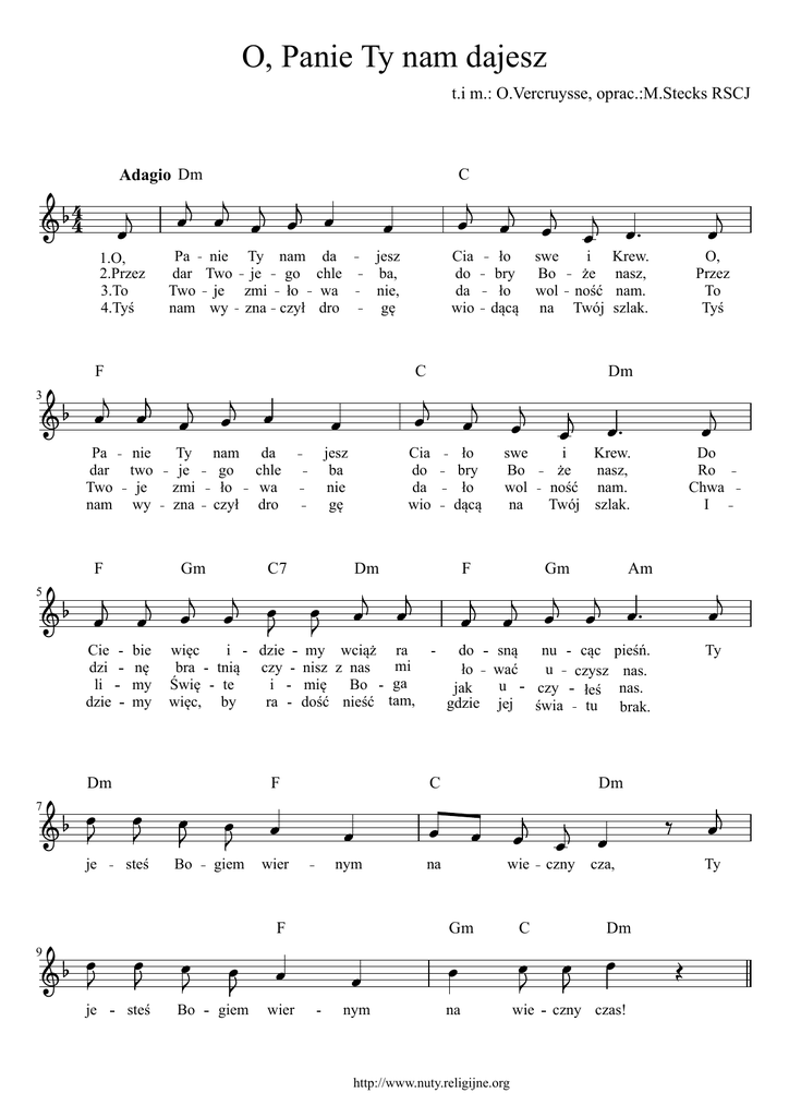 O, Panie Ty nam dajesz t.i m.: O.Vercruysse, oprac.:M.Stecks RSCJ Adagio Dm C 4 4 1.O, 2.Przez 3.To 4.Tyś Pa nie Ty nam dar Two je go Two je zmi ło nam wy zna czył da chle wa dro jesz ba, nie, gę F 3 C nie two je wy F Ty je zmi zna Gm Cie dzi li dzie bie nę my my nam da go chle ło wa czył dro C7 jesz ba nie gę Cia do da wio ło bry ło dącą Dm swe Bo wol na F i Krew. że nasz, ność nam. Twój szlak. Gm Do Ro Chwa I Am więc i bra tnią Świę te więc, by dzie my wciąż ra czy nisz z nas mi i mię Bo ga ra dość nieść tam, F do sną ło wać u jak gdzie jej nu cąc pieśń. u czysz nas. czy łeś nas. świa tu brak. C Ty Dm je steś Bo giem wier nym F 9 Dm Dm 7 O, Przez To Tyś Pa dar Two nam 5 Cia ło swe i Krew. do bry Bo że nasz, da ło wol ność nam. wio dącą na Twój szlak. steś Bo giem wier wie czny cza, Gm je na nym C Dm na http://www.nuty.religijne.org wie czny czas! Ty