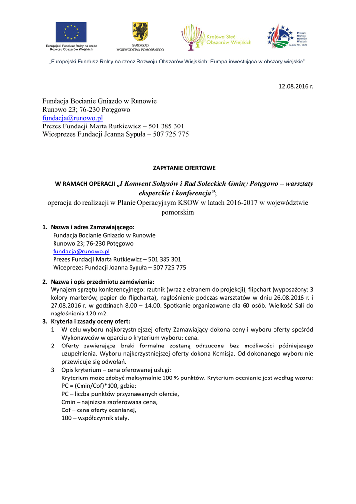 „Europejski Fundusz Rolny na rzecz Rozwoju Obszarów Wiejskich: Europa inwestująca w obszary wiejskie”. 12.08.2016 r. Fundacja Bocianie Gniazdo w Runowie Runowo 23; 76-230 Potęgowo [email protected] Prezes Fundacji Marta Rutkiewicz – 501 385 301 Wiceprezes Fundacji Joanna Sypuła – 507 725 775 ZAPYTANIE OFERTOWE W RAMACH OPERACJI „I Konwent Sołtysów i Rad Sołeckich Gminy Potęgowo – warsztaty eksperckie i konferencja”; operacja do realizacji w Planie Operacyjnym KSOW w latach 2016-2017 w województwie pomorskim 1. Nazwa i adres Zamawiającego: Fundacja Bocianie Gniazdo w Runowie Runowo 23; 76-230 Potęgowo [email protected] Prezes Fundacji Marta Rutkiewicz – 501 385 301 Wiceprezes Fundacji Joanna Sypuła – 507 725 775 2. Nazwa i opis przedmiotu zamówienia: Wynajem sprzętu konferencyjnego: rzutnik (wraz z ekranem do projekcji), flipchart (wyposażony: 3 kolory markerów, papier do flipcharta), nagłośnienie podczas warsztatów w dniu 26.08.2016 r. i 27.08.2016 r. w godzinach 8.00 – 14.00. Spotkanie organizowane dla 60 osób. Wielkość Sali do nagłośnienia 120 m2. 3. Kryteria i zasady oceny ofert: 1. W celu wyboru najkorzystniejszej oferty Zamawiający dokona ceny i wyboru oferty spośród Wykonawców w oparciu o kryterium wyboru: cena. 2. Oferty zawierające braki formalne zostaną odrzucone bez możliwości późniejszego uzupełnienia. Wyboru najkorzystniejszej oferty dokona Komisja. Od dokonanego wyboru nie przewiduje się odwołań. 3. Opis kryterium – cena oferowanej usługi: Kryterium może zdobyć maksymalnie 100 % punktów. Kryterium ocenianie jest według wzoru: PC = (Cmin/Cof)*100, gdzie: PC – liczba punktów przyznawanych ofercie, Cmin – najniższa zaoferowana cena, Cof – cena oferty ocenianej, 100 – współczynnik stały. „Europejski Fundusz Rolny na rzecz Rozwoju Obszarów Wiejskich: Europa inwestująca w obszary wiejskie”. 4. Termin składania odpowiedzi: 1. Do 17 sierpnia 2016 (środa) drogą elektroniczną na adres: [email protected] 2. Tytułem: Oferta w ramach operacji „I Konwent Sołtysów i Rad Sołeckich Gminy Potęgowo – wynajem sprzętu konferencyjnego”. 3. W odpowiedzi należy podać dokładne dane oferenta, kwotę brutto, netto oraz stawkę podatku VAT. 4. Dopuszcza się w ramach realizacji operacji zawieranie umów cywilno-prawnych. 5. Informacje dodatkowe: 1. Miejsce dostarczenia usługi: Runowo 23; 76-230 Potęgowo 26-27.08.2016 r. 2. Terminy: 26 – 27.08.2016 r. w godzinach 10.00 – 18.00. „Europejski Fundusz Rolny na rzecz Rozwoju Obszarów Wiejskich: Europa inwestująca w obszary wiejskie”. Załącznik nr 1 do zapytania ofertowego …………………………………………………. miejscowość, data ………………………………………………………… pieczęć firmowa (jeśli dotyczy) OFERTA WYKONAWCY w postępowaniu zgodnym z zasadą konkurencyjności Postępowanie w ramach operacji „I Konwent Sołtysów i Rad Sołeckich Gminy Potęgowo – warsztaty eksperckie i konferencja” – wynajem sprzętu konferencyjnego Nazwa oferenta (imię i nazwisko) Adres Telefon Adres e-mail W odpowiedzi na zapytanie ofertowe dotyczące wynajęcia sprzętu konferencyjnego w ramach projektu pn. „I Konwent Sołtysów i Rad Sołeckich Gminy Potęgowo – warsztaty eksperckie i konferencja” składam ofertę na wynajem sprzętu konferencyjnego: rzutnik, flipchart, nagłośnienie podczas warsztatów w dniu 26 27.08.2016 r. (zgodnie ze specyfikacją zawartą w pkt. 2 zapytania ofertowego z dnia 12.08.2016r.): Cena [brutto] …………………..…………….................... PLN Cena [netto] ………………..…………………………………. PLN Stawka podatku VAT ………………..…………………………………. PLN Specyfikacja dot. usługi: zgodnie z przedmiotem zapytania 1. 2. 3. 4. Oświadczam, że zapoznałem/-am się z warunkami niniejszego zapytania i nie wnoszę do niego żadnych zastrzeżeń oraz zdobyłem/-am informacje konieczne do przygotowania oferty. Oświadczam, że termin związania z ofertą wynosi 30 dni kalendarzowych od dnia upływu terminu składania ofert. W przypadku uznania oferty za najkorzystniejszą zobowiązuję się do podpisania umowy w terminie i miejscu wskazanym przez Zamawiającego. Ofertę niniejszą składam na ........... kolejno ponumerowanych stronach. ……………………………………………………………………………….. Podpis Wykonawcy