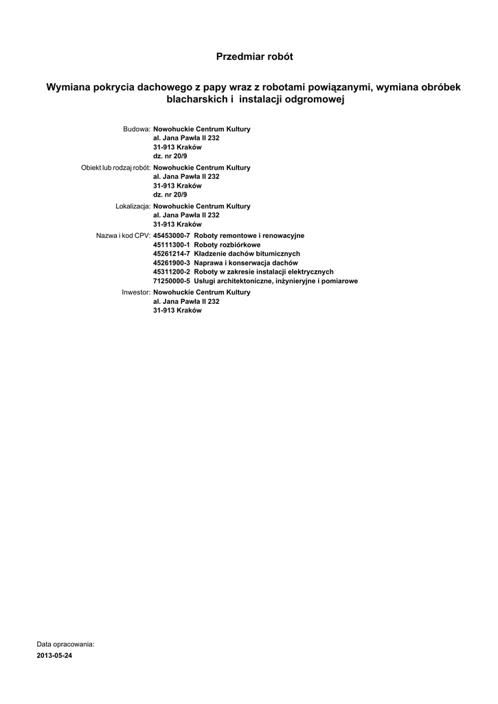 Przedmiar robót Wymiana pokrycia dachowego z papy wraz z