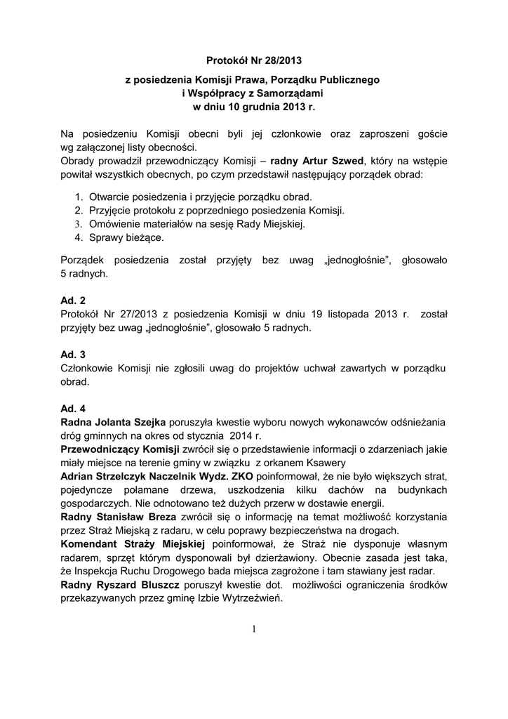 Protokół Nr 28/2013 z posiedzenia Komisji Prawa, Porządku Publicznego i Współpracy z Samorządami w dniu 10 grudnia 2013 r. Na posiedzeniu Komisji obecni byli jej członkowie oraz zaproszeni goście wg załączonej listy obecności. Obrady prowadził przewodniczący Komisji – radny Artur Szwed, który na wstępie powitał wszystkich obecnych, po czym przedstawił następujący porządek obrad: 1. 2. 3. 4. Otwarcie posiedzenia i przyjęcie porządku obrad. Przyjęcie protokołu z poprzedniego posiedzenia Komisji. Omówienie materiałów na sesję Rady Miejskiej. Sprawy bieżące. Porządek posiedzenia 5 radnych. został przyjęty bez uwag „jednogłośnie”, głosowało Ad. 2 Protokół Nr 27/2013 z posiedzenia Komisji w dniu 19 listopada 2013 r. przyjęty bez uwag „jednogłośnie”, głosowało 5 radnych. został Ad. 3 Członkowie Komisji nie zgłosili uwag do projektów uchwał zawartych w porządku obrad. Ad. 4 Radna Jolanta Szejka poruszyła kwestie wyboru nowych wykonawców odśnieżania dróg gminnych na okres od stycznia 2014 r. Przewodniczący Komisji zwrócił się o przedstawienie informacji o zdarzeniach jakie miały miejsce na terenie gminy w związku z orkanem Ksawery Adrian Strzelczyk Naczelnik Wydz. ZKO poinformował, że nie było większych strat, pojedyncze połamane drzewa, uszkodzenia kilku dachów na budynkach gospodarczych. Nie odnotowano też dużych przerw w dostawie energii. Radny Stanisław Breza zwrócił się o informację na temat możliwość korzystania przez Straż Miejską z radaru, w celu poprawy bezpieczeństwa na drogach. Komendant Straży Miejskiej poinformował, że Straż nie dysponuje własnym radarem, sprzęt którym dysponowali był dzierżawiony. Obecnie zasada jest taka, że Inspekcja Ruchu Drogowego bada miejsca zagrożone i tam stawiany jest radar. Radny Ryszard Bluszcz poruszył kwestie dot. możliwości ograniczenia środków przekazywanych przez gminę Izbie Wytrzeźwień. 1 Komendant Straży Miejskiej poinformował, że jest to zadanie gminy i trzeba je finansować. Przewodniczący Komisji poinformował, że na kolejne posiedzenie zaproszony zostanie Komendant Komisariatu Policji w Czerwionce-Leszczynach. Na tym posiedzenie zakończono. Protokołowała: Alina Kuśka Przewodniczący Komisji radny Artur Szwed 2
