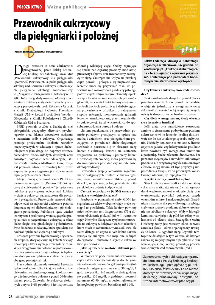 położnictwo Waż na p u b lik ac ja Przewodnik cukrzycowy dla pielęgniarki i położnej D ruga broszura z serii edukacyjnej przygotowanej przez Polską Federację Edukacji w Diabetologii nosi tytuł „Przewodnik cukrzycowy dla pielęgniarki i położnej”. Pierwszą pt. „Opieka pielęgniarki szkolnej nad uczniem z cukrzycą (informacje dla pielęgniarki szkolnej)” anonsowaliśmy w „Magazynie Pielęgniarki i Położnej”w nr 9/08. Informację dedykowaną położnej i pielęgniarce opiekującej się ciężarną kobietą z cukrzycą przygotowały prof. Katarzyna Cypryk z Kliniki Diabetologii i Chorób Przemiany Materii UM w Łodzi i prof. Ewa WenderOżegowska z Kliniki Położnictwa i Chorób Kobiecych UM w Poznaniu. PFED powstała w 2006 r. Należą do niej pielęgniarki, pedagodzy, dietetycy, psychologowie oraz lekarze zawodowo związani z leczeniem osób z cukrzycą. Organizacja promuje profesjonalne działanie zespołów terapeutycznych w edukacji i opiece diabetologicznej jako drogę do poprawy zdrowia diabetyków: dzieci, młodych dorosłych oraz dorosłych. Wydanie serii edukacyjnej sfinansowała fundacja Medtronic, której misją jest poprawa sytuacji zdrowotnej ludzi przez wspieranie pracy organizacji i stowarzyszeń zajmujących się diabetologią. Alicja Szewczyk, przewodnicząca PFED, informuje we wstępie, że: „Przewodnik cukrzycowy dla pielęgniarki i położnej” jest pierwszą publikacją poświęconą opiece nad kobietą w ciąży z cukrzycą, przeznaczoną dla położnej i pielęgniarki. Praktycznie stanowi zbiór odpowiedzi na najczęściej zadawane pytania dotyczące opieki diabetologicznej i ginekologiczno-położniczej. Publikacja łączy wiedzę teoretyczną i praktyczną, wynikającą z lat pracy autorek z pacjentkami z cukrzycą, a także diabetologię oraz ginekologię i położnictwo, dwie dziedziny medycyny, które spotykają się podczas opieki nad ciężarną z cukrzycą. Broszura powinna być naprawdę użyteczna dla zespołu, który opiekuje się kobietą w ciąży z cukrzycą – która wymaga szczególnej troski. W jej przygotowaniu położne współpracowały z pielęgniarkami, co daje nadzieję, że będzie ona dobrym narzędziem w codziennej pracy obu grup profesjonalistek. Przewodnik rekomenduje również Leokadia Jędrzejewska, konsultant krajowy w dziedzinie pielęgniarstwa ginekologicznego i położniczego, a jednocześnie położna z ponad 30-letnim stażem pracy. Zauważa, że cukrzyca ciężarnych dotyka 2-4% populacji i jest najczęstszą 28 MAGAZYN PIELĘGNIARKI i POŁOŻNEJ chorobą wikłającą ciążę. Osoby zajmujące się opieką nad ciężarną powinny znać istotę, przyczyny i objawy oraz mechanizmy cukrzycy w ciąży. Cukrzyca ma wpływ na przebieg ciąży, porodu i połogu, a jej nieprawidłowe leczenie może się przyczynić m.in. do powstania wad rozwojowych płodu czy patologii położniczych. Najważniejsze elementy opieki w ciąży to: utrzymanie zalecanych poziomów glikemii, nauczenie kobiet intensywnej samokontroli, kontrola położnicza i diabetologiczna prowadzona w ośrodkach o najwyższym stopniu referencji, monitorowanie glikemii, leczenie farmakologiczne, przestrzeganie diety cukrzycowej. Są też wskazówki co do sposobu prowadzenia porodu i połogu. „Jestem przekonana, że przewodnik pomoże położnym pracującym w opiece nad matką i dzieckiem oraz pielęgniarkom pracującym w poradniach diabetologicznych swobodnie poruszać się w obszarze ciąży kobiet z cukrzycą. Pozwoli na skuteczne reagowanie na problemy i potrzeby kobiet i właściwą interwencję, która przyczyni się do zmniejszenia powikłań czy śmiertelności okołoporodowej”. Przewodnik grupuje omawiane zagadnienia w następujących działach: cukrzyca ogólnie, ciąża, monitorowanie glikemii, poród, dziecko, odżywianie, połóg, powikłania. Oto przykładowe pytania i odpowiedzi. Czy cukrzyca ciążowa (GDM) zawsze pojawia się w kolejnych ciążach? Przebycie w poprzedniej ciąży GDM jest sygnałem, że także w obecnej ciąży może wystąpić to powikłanie. Takie kobiety powinny mieć wykonany test diagnostyczny (75 g doustne obciążenie glukozą) już w I trymestrze ciąży. Nie tylko dlatego, że ryzyko zachorowania na cukrzycę w kolejnych ciążach u kobiety, która miała to zaburzenie, wynosi ok. 30%, ale także dlatego, że często u tych kobiet skrycie rozwija się cukrzyca. Nie mają one żadnych dolegliwości i objawów, a stężenie cukru we krwi jest wysokie. Jakie są zalecane wartości glikemii podczas ciąży? W momencie podejrzenia lub rozpoznania ciąży należy bezwzględnie dążyć do utrzymania zalecanych poziomów glikemii poniżej lub równych następującym: na czczo 90 mg/dl, 1 godz. po posiłku 140 mg/dl, w dwie godziny po posiłku 120 mg/dl, w godzinach nocnych natomiast 60-90 mg/dl, a poziom glikowanej hemoglobiny powinien być niższy niż 6,3%. Polska Federacja Edukacji w Diabetologii organizuje w Warszawie 5-6 grudnia br. konferencję pt. „Edukacja diabetologiczna – teraźniejszość a wyzwania przyszłości”. Konferencja pod patronatem honorowym minister zdrowia Ewy Kopacz. Czy kobieta z cukrzycą może rodzić w wodzie? Brak ewidentnych danych o jakichkolwiek przeciwwskazaniach do porodu w wodzie; wydaje się jednak, że z uwagi na większą skłonność do zakażeń w tej grupie ciężarnych, należy tę drogę rozważać bardzo ostrożnie. Czy dieta wymaga zmian, kiedy wkracza się z leczeniem insuliną? Jeśli dieta była prawidłowo stosowana, a mimo to ciężarna ma podwyższone poziomy cukru we krwi, to leczenie insuliną dostosowuje się do już ustalonego sposobu odżywiania. Niekiedy konieczne są zmiany w liczbie, objętości, jakości czy kaloryczności posiłków, które powinny być szczegółowo omówione z pacjentką. Suche zalecenia dietetyczne, bez poznania zwyczajów i nawyków kulinarnych pacjentki nie przynoszą zwykle zamierzonych efektów, mogą natomiast być p