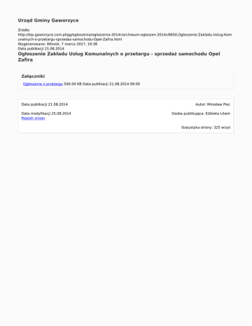Urząd Gminy Gaworzyce Źródło: http://bip.gaworzyce.com.pl/gg/ogloszenia/ogloszenia-2014r/archiwum-ogloszen-2014r/6650,Ogloszenie-Zakladu-Uslug-Kom unalnych-o-przetargu-sprzedaz-samochodu-Opel-Zafira.html Wygenerowano: Wtorek, 7 marca 2017, 19:38 Data publikacji 21.08.2014 Ogłoszenie Zakładu Usług Komunalnych o przetargu - sprzedaż samochodu Opel Zafira Załączniki Ogłoszenie o przetargu 500.04 KB Data publikacji 21.08.2014 09:00 Data publikacji 21.08.2014 Data modyfikacji 25.08.2014 Rejestr zmian Autor: Mirosław Piec Osoba publikująca: Elżbieta Litwin Statystyka strony: 325 wizyt
