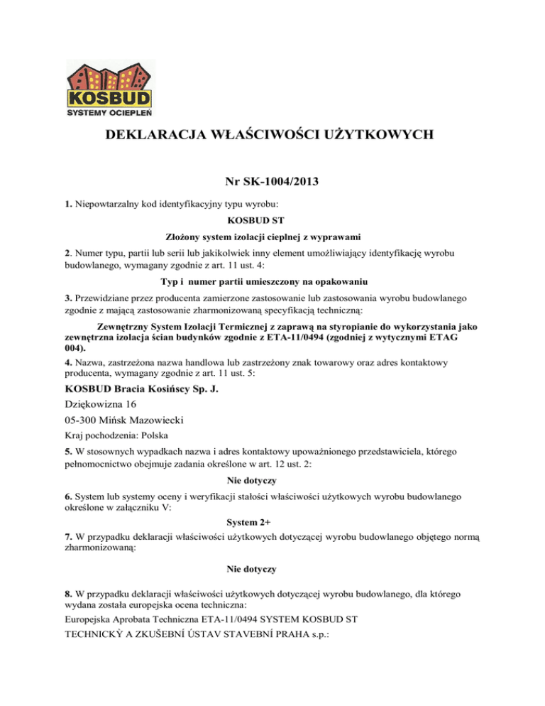 DEKLARACJA WŁAŚCIWOŚCI UŻYTKOWYCH Nr SK-1004/2013 1. Niepowtarzalny kod identyfikacyjny typu wyrobu: KOSBUD ST Złożony system izolacji cieplnej z wyprawami 2. Numer typu, partii lub serii lub jakikolwiek inny element umożliwiający identyfikację wyrobu budowlanego, wymagany zgodnie z art. 11 ust. 4: Typ i numer partii umieszczony na opakowaniu 3. Przewidziane przez producenta zamierzone zastosowanie lub zastosowania wyrobu budowlanego zgodnie z mającą zastosowanie zharmonizowaną specyfikacją techniczną: Zewnętrzny System Izolacji Termicznej z zaprawą na styropianie do wykorzystania jako zewnętrzna izolacja ścian budynków zgodnie z ETA-11/0494 (zgodniej z wytycznymi ETAG 004). 4. Nazwa, zastrzeżona nazwa handlowa lub zastrzeżony znak towarowy oraz adres kontaktowy producenta, wymagany zgodnie z art. 11 ust. 5: KOSBUD Bracia Kosińscy Sp. J. Dziękowizna 16 05-300 Mińsk Mazowiecki Kraj pochodzenia: Polska 5. W stosownych wypadkach nazwa i adres kontaktowy upoważnionego przedstawiciela, którego pełnomocnictwo obejmuje zadania określone w art. 12 ust. 2: Nie dotyczy 6. System lub systemy oceny i weryfikacji stałości właściwości użytkowych wyrobu budowlanego określone w załączniku V: System 2+ 7. W przypadku deklaracji właściwości użytkowych dotyczącej wyrobu budowlanego objętego normą zharmonizowaną: Nie dotyczy 8. W przypadku deklaracji właściwości użytkowych dotyczącej wyrobu budowlanego, dla którego wydana została europejska ocena techniczna: Europejska Aprobata Techniczna ETA-11/0494 SYSTEM KOSBUD ST TECHNICKỲ A ZKUŠEBNÍ ÚSTAV STAVEBNÍ PRAHA s.p.: Prosecká 811/76 a; CZ-190 00 Praha 9, notyfikacja nr 1020, wydał Europejską Aprobatę Techniczną ETA-11/0494 na podstawie ETAG 004 CERTBUD Sp. z o., ul. Mokotowska 46 lok. 8, 00-543 Warszawa przeprowadził certyfikację w systemie 2+ i wydała Certyfikat Zgodności WE Nr 2310 –CPD-Z169, notyfikacja nr 2310. 9. Deklarowane właściwości użytkowe: Klasyfikacja ogniowa: Współczynnik przepuszczalności pary wodnej, dyfuzyjnie równoważna grubość powietrza (Sd) Absorpcja wody (podciąganie kapilarne) po 24 h Przyczepność międzywarstwowa po starzeniu Przyczepność międzywarstwowa Przyczepność międzywarstwowa po cyklach mrozowych Przyczepność międzywarstwowa po cyklach termicznowilgotnościowych Przyczepność zaprawy klejącej do betonu Przyczepność zaprawy klejącej do betonu po kondycjonowaniu (2d/2h) Przyczepność zaprawy klejącej do styropianu Przyczepność zaprawy klejącej po kondycjonowaniu (2d/2h) Odporność na uderzenia Wytrzymałość na obciążenia wiatrem B-s2, d0 ≤1m < 0,5 / ≥ 0,5 kg/m2 ≥ 0,08 MPa ≥ 0,08 MPa ≥ 0,08 MPa ETAG 004 ≥ 0,08 MPa ≥ 0,25MPa ≥ 0,08 MPa ≥ 0,08 MPa ≥ 0,03 MPa Category I / II ≥ 150kPa 10.Właściwości użytkowe wyrobu określone w pkt 1 i 2 są zgodne z właściwościami użytkowymi deklarowanymi w pkt. 9. Niniejsza deklaracja właściwości użytkowych wydana zostaje na wyłączną odpowiedzialność producenta określonego w pkt. 4. W imieniu producenta podpisał: Dziękowizna, 1.07.2013 (Miejsce i data wydania) (podpis)