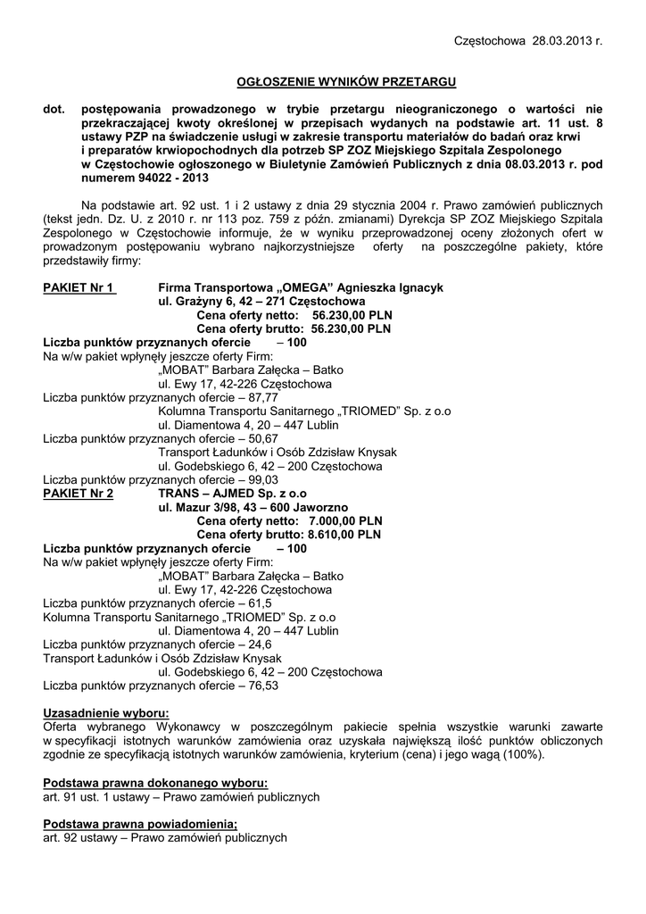 Częstochowa 28.03.2013 r. OGŁOSZENIE WYNIKÓW PRZETARGU dot. postępowania prowadzonego w trybie przetargu nieograniczonego o wartości nie przekraczającej kwoty określonej w przepisach wydanych na podstawie art. 11 ust. 8 ustawy PZP na świadczenie usługi w zakresie transportu materiałów do badań oraz krwi i preparatów krwiopochodnych dla potrzeb SP ZOZ Miejskiego Szpitala Zespolonego w Częstochowie ogłoszonego w Biuletynie Zamówień Publicznych z dnia 08.03.2013 r. pod numerem 94022 - 2013 Na podstawie art. 92 ust. 1 i 2 ustawy z dnia 29 stycznia 2004 r. Prawo zamówień publicznych (tekst jedn. Dz. U. z 2010 r. nr 113 poz. 759 z późn. zmianami) Dyrekcja SP ZOZ Miejskiego Szpitala Zespolonego w Częstochowie informuje, że w wyniku przeprowadzonej oceny złożonych ofert w prowadzonym postępowaniu wybrano najkorzystniejsze oferty na poszczególne pakiety, które przedstawiły firmy: Firma Transportowa „OMEGA” Agnieszka Ignacyk ul. Grażyny 6, 42 – 271 Częstochowa Cena oferty netto: 56.230,00 PLN Cena oferty brutto: 56.230,00 PLN Liczba punktów przyznanych ofercie – 100 Na w/w pakiet wpłynęły jeszcze oferty Firm: „MOBAT” Barbara Załęcka – Batko ul. Ewy 17, 42-226 Częstochowa Liczba punktów przyznanych ofercie – 87,77 Kolumna Transportu Sanitarnego „TRIOMED” Sp. z o.o ul. Diamentowa 4, 20 – 447 Lublin Liczba punktów przyznanych ofercie – 50,67 Transport Ładunków i Osób Zdzisław Knysak ul. Godebskiego 6, 42 – 200 Częstochowa Liczba punktów przyznanych ofercie – 99,03 PAKIET Nr 2 TRANS – AJMED Sp. z o.o ul. Mazur 3/98, 43 – 600 Jaworzno Cena oferty netto: 7.000,00 PLN Cena oferty brutto: 8.610,00 PLN Liczba punktów przyznanych ofercie – 100 Na w/w pakiet wpłynęły jeszcze oferty Firm: „MOBAT” Barbara Załęcka – Batko ul. Ewy 17, 42-226 Częstochowa Liczba punktów przyznanych ofercie – 61,5 Kolumna Transportu Sanitarnego „TRIOMED” Sp. z o.o ul. Diamentowa 4, 20 – 447 Lublin Liczba punktów przyznanych ofercie – 24,6 Transport Ładunków i Osób Zdzisław Knysak ul. Godebskiego 6, 42 – 200 Częstochowa Liczba punktów przyznanych ofercie – 76,53 PAKIET Nr 1 Uzasadnienie wyboru: Oferta wybranego Wykonawcy w poszczególnym pakiecie spełnia wszystkie warunki zawarte w specyfikacji istotnych warunków zamówienia oraz uzyskała największą ilość punktów obliczonych zgodnie ze specyfikacją istotnych warunków zamówienia, kryterium (cena) i jego wagą (100%). Podstawa prawna dokonanego wyboru: art. 91 ust. 1 ustawy – Prawo zamówień publicznych Podstawa prawna powiadomienia; art. 92 ustawy – Prawo zamówień publicznych Na podstawie art. 92 ust. 1 pkt 2 i 3 ustawy Prawo Zamówień Publicznych informujemy, że w prowadzonym postępowaniu nie wykluczono żadnego Wykonawcy i nie odrzucono żadnej oferty. Z wybranym Wykonawcą, zostanie zawarta umowa w sprawie zamówienia publicznego w terminie określonym w przepisach art. 94 ust. 1 pkt 2 ustawy z dnia 29 stycznia 2004 r. Prawo zamówień publicznych (tekst jedn. Dz. U. z 2010 r. Nr 113, poz 759 z późn, zmianami) Dziękujemy za udział w postępowaniu Podpisał: p.o Dyrektora Naczelnego Wojciech Konieczny